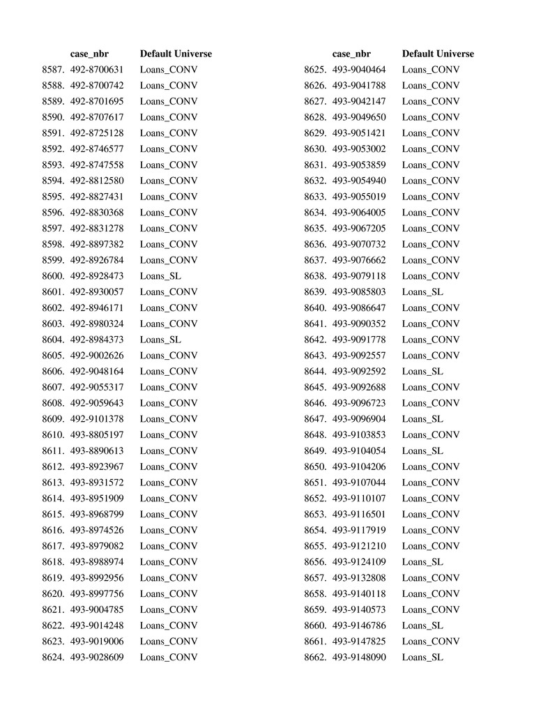 case_nbr Default Universe 8587. 492-8700631 Loans_CONV 8588. 492-8700742 Loans_CONV 8589. 492-8701695 Loans_CONV 8590. 492-8707617 Loans_CONV 8591. 492-8725128 Loans_CONV 8592. 492-8746577 Loans_CONV 8593. 492-8747558 Loans_CONV 8594. 492-8812580 Loans_CONV 8595. 492-8827431 Loans_CONV 8596. 492-8830368 Loans_CONV 8597. 492-8831278 Loans_CONV 8598. 492-8897382 Loans_CONV 8599. 492-8926784 Loans_CONV 8600. 492-8928473 Loans_SL 8601. 492-8930057 Loans_CONV 8602. 492-8946171 Loans_CONV 8603. 492-8980324 Loans_CONV 8604. 492-8984373 Loans_SL 8605. 492-9002626 Loans_CONV 8606. 492-9048164 Loans_CONV 8607. 492-9055317 Loans_CONV 8608. 492-9059643 Loans_CONV 8609. 492-9101378 Loans_CONV 8610. 493-8805197 Loans_CONV 8611. 493-8890613 Loans_CONV 8612. 493-8923967 Loans_CONV 8613. 493-8931572 Loans_CONV 8614. 493-8951909 Loans_CONV 8615. 493-8968799 Loans_CONV 8616. 493-8974526 Loans_CONV 8617. 493-8979082 Loans_CONV 8618. 493-8988974 Loans_CONV 8619. 493-8992956 Loans_CONV 8620. 493-8997756 Loans_CONV 8621. 493-9004785 Loans_CONV 8622. 493-9014248 Loans_CONV 8623. 493-9019006 Loans_CONV 8624. 493-9028609 Loans_CONV case_nbr Default Universe 8625. 493-9040464 Loans_CONV 8626. 493-9041788 Loans_CONV 8627. 493-9042147 Loans_CONV 8628. 493-9049650 Loans_CONV 8629. 493-9051421 Loans_CONV 8630. 493-9053002 Loans_CONV 8631. 493-9053859 Loans_CONV 8632. 493-9054940 Loans_CONV 8633. 493-9055019 Loans_CONV 8634. 493-9064005 Loans_CONV 8635. 493-9067205 Loans_CONV 8636. 493-9070732 Loans_CONV 8637. 493-9076662 Loans_CONV 8638. 493-9079118 Loans_CONV 8639. 493-9085803 Loans_SL 8640. 493-9086647 Loans_CONV 8641. 493-9090352 Loans_CONV 8642. 493-9091778 Loans_CONV 8643. 493-9092557 Loans_CONV 8644. 493-9092592 Loans_SL 8645. 493-9092688 Loans_CONV 8646. 493-9096723 Loans_CONV 8647. 493-9096904 Loans_SL 8648. 493-9103853 Loans_CONV 8649. 493-9104054 Loans_SL 8650. 493-9104206 Loans_CONV 8651. 493-9107044 Loans_CONV 8652. 493-9110107 Loans_CONV 8653. 493-9116501 Loans_CONV 8654. 493-9117919 Loans_CONV 8655. 493-9121210 Loans_CONV 8656. 493-9124109 Loans_SL 8657. 493-9132808 Loans_CONV 8658. 493-9140118 Loans_CONV 8659. 493-9140573 Loans_CONV 8660. 493-9146786 Loans_SL 8661. 493-9147825 Loans_CONV 8662. 493-9148090 Loans_SL