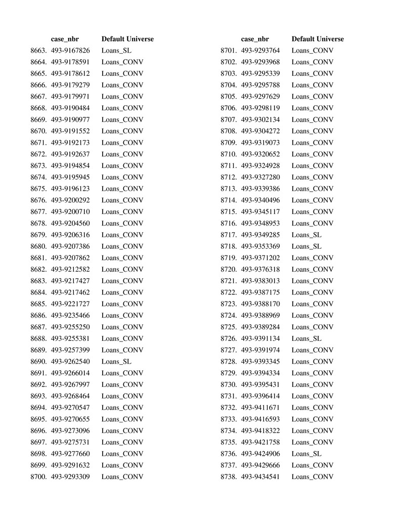 case_nbr Default Universe 8663. 493-9167826 Loans_SL 8664. 493-9178591 Loans_CONV 8665. 493-9178612 Loans_CONV 8666. 493-9179279 Loans_CONV 8667. 493-9179971 Loans_CONV 8668. 493-9190484 Loans_CONV 8669. 493-9190977 Loans_CONV 8670. 493-9191552 Loans_CONV 8671. 493-9192173 Loans_CONV 8672. 493-9192637 Loans_CONV 8673. 493-9194854 Loans_CONV 8674. 493-9195945 Loans_CONV 8675. 493-9196123 Loans_CONV 8676. 493-9200292 Loans_CONV 8677. 493-9200710 Loans_CONV 8678. 493-9204560 Loans_CONV 8679. 493-9206316 Loans_CONV 8680. 493-9207386 Loans_CONV 8681. 493-9207862 Loans_CONV 8682. 493-9212582 Loans_CONV 8683. 493-9217427 Loans_CONV 8684. 493-9217462 Loans_CONV 8685. 493-9221727 Loans_CONV 8686. 493-9235466 Loans_CONV 8687. 493-9255250 Loans_CONV 8688. 493-9255381 Loans_CONV 8689. 493-9257399 Loans_CONV 8690. 493-9262540 Loans_SL 8691. 493-9266014 Loans_CONV 8692. 493-9267997 Loans_CONV 8693. 493-9268464 Loans_CONV 8694. 493-9270547 Loans_CONV 8695. 493-9270655 Loans_CONV 8696. 493-9273096 Loans_CONV 8697. 493-9275731 Loans_CONV 8698. 493-9277660 Loans_CONV 8699. 493-9291632 Loans_CONV 8700. 493-9293309 Loans_CONV case_nbr Default Universe 8701. 493-9293764 Loans_CONV 8702. 493-9293968 Loans_CONV 8703. 493-9295339 Loans_CONV 8704. 493-9295788 Loans_CONV 8705. 493-9297629 Loans_CONV 8706. 493-9298119 Loans_CONV 8707. 493-9302134 Loans_CONV 8708. 493-9304272 Loans_CONV 8709. 493-9319073 Loans_CONV 8710. 493-9320652 Loans_CONV 8711. 493-9324928 Loans_CONV 8712. 493-9327280 Loans_CONV 8713. 493-9339386 Loans_CONV 8714. 493-9340496 Loans_CONV 8715. 493-9345117 Loans_CONV 8716. 493-9348953 Loans_CONV 8717. 493-9349285 Loans_SL 8718. 493-9353369 Loans_SL 8719. 493-9371202 Loans_CONV 8720. 493-9376318 Loans_CONV 8721. 493-9383013 Loans_CONV 8722. 493-9387175 Loans_CONV 8723. 493-9388170 Loans_CONV 8724. 493-9388969 Loans_CONV 8725. 493-9389284 Loans_CONV 8726. 493-9391134 Loans_SL 8727. 493-9391974 Loans_CONV 8728. 493-9393345 Loans_CONV 8729. 493-9394334 Loans_CONV 8730. 493-9395431 Loans_CONV 8731. 493-9396414 Loans_CONV 8732. 493-9411671 Loans_CONV 8733. 493-9416593 Loans_CONV 8734. 493-9418322 Loans_CONV 8735. 493-9421758 Loans_CONV 8736. 493-9424906 Loans_SL 8737. 493-9429666 Loans_CONV 8738. 493-9434541 Loans_CONV