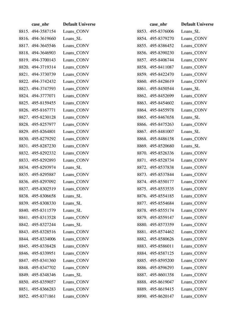 case_nbr Default Universe 8815. 494-3587154 Loans_CONV 8816. 494-3619660 Loans_SL 8817. 494-3645546 Loans_CONV 8818. 494-3646903 Loans_CONV 8819. 494-3700143 Loans_CONV 8820. 494-3719314 Loans_CONV 8821. 494-3730739 Loans_CONV 8822. 494-3742432 Loans_CONV 8823. 494-3747593 Loans_CONV 8824. 494-3777071 Loans_CONV 8825. 495-8159455 Loans_CONV 8826. 495-8167771 Loans_CONV 8827. 495-8230128 Loans_CONV 8828. 495-8257977 Loans_CONV 8829. 495-8264801 Loans_CONV 8830. 495-8279292 Loans_CONV 8831. 495-8287230 Loans_CONV 8832. 495-8292332 Loans_CONV 8833. 495-8292893 Loans_CONV 8834. 495-8293974 Loans_SL 8835. 495-8295887 Loans_CONV 8836. 495-8297092 Loans_CONV 8837. 495-8302519 Loans_CONV 8838. 495-8306658 Loans_SL 8839. 495-8308330 Loans_SL 8840. 495-8311579 Loans_SL 8841. 495-8313528 Loans_CONV 8842. 495-8327244 Loans_SL 8843. 495-8328516 Loans_CONV 8844. 495-8334006 Loans_CONV 8845. 495-8338428 Loans_CONV 8846. 495-8339951 Loans_CONV 8847. 495-8341360 Loans_CONV 8848. 495-8347702 Loans_CONV 8849. 495-8348346 Loans_SL 8850. 495-8359057 Loans_CONV 8851. 495-8366283 Loans_CONV 8852. 495-8371861 Loans_CONV case_nbr Default Universe 8853. 495-8376006 Loans_SL 8854. 495-8379270 Loans_CONV 8855. 495-8386452 Loans_CONV 8856. 495-8390230 Loans_CONV 8857. 495-8406744 Loans_CONV 8858. 495-8411087 Loans_CONV 8859. 495-8422470 Loans_CONV 8860. 495-8428619 Loans_CONV 8861. 495-8450544 Loans_SL 8862. 495-8452699 Loans_CONV 8863. 495-8454602 Loans_CONV 8864. 495-8455978 Loans_CONV 8865. 495-8467658 Loans_SL 8866. 495-8475263 Loans_CONV 8867. 495-8481007 Loans_SL 8868. 495-8486158 Loans_CONV 8869. 495-8520680 Loans_SL 8870. 495-8526336 Loans_CONV 8871. 495-8528734 Loans_CONV 8872. 495-8537838 Loans_CONV 8873. 495-8537844 Loans_CONV 8874. 495-8550177 Loans_CONV 8875. 495-8553535 Loans_CONV 8876. 495-8554185 Loans_CONV 8877. 495-8554684 Loans_CONV 8878. 495-8555174 Loans_CONV 8879. 495-8559147 Loans_CONV 8880. 495-8573359 Loans_CONV 8881. 495-8574462 Loans_CONV 8882. 495-8580626 Loans_CONV 8883. 495-8586011 Loans_CONV 8884. 495-8587125 Loans_CONV 8885. 495-8595200 Loans_CONV 8886. 495-8596293 Loans_CONV 8887. 495-8601358 Loans_CONV 8888. 495-8619047 Loans_CONV 8889. 495-8619415 Loans_CONV 8890. 495-8620147 Loans_CONV