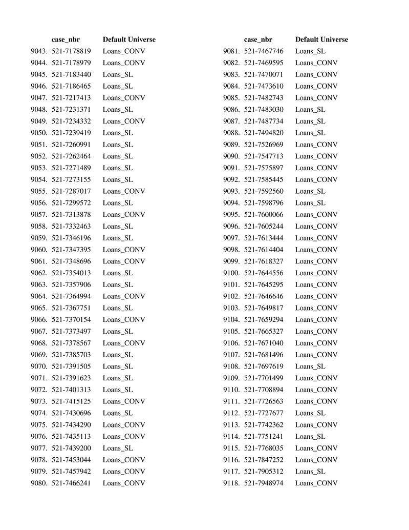case_nbr Default Universe 9043. 521-7178819 Loans_CONV 9044. 521-7178979 Loans_CONV 9045. 521-7183440 Loans_SL 9046. 521-7186465 Loans_SL 9047. 521-7217413 Loans_CONV 9048. 521-7231371 Loans_SL 9049. 521-7234332 Loans_CONV 9050. 521-7239419 Loans_SL 9051. 521-7260991 Loans_SL 9052. 521-7262464 Loans_SL 9053. 521-7271489 Loans_SL 9054. 521-7273155 Loans_SL 9055. 521-7287017 Loans_CONV 9056. 521-7299572 Loans_SL 9057. 521-7313878 Loans_CONV 9058. 521-7332463 Loans_SL 9059. 521-7346196 Loans_SL 9060. 521-7347395 Loans_CONV 9061. 521-7348696 Loans_CONV 9062. 521-7354013 Loans_SL 9063. 521-7357906 Loans_SL 9064. 521-7364994 Loans_CONV 9065. 521-7367751 Loans_SL 9066. 521-7370154 Loans_CONV 9067. 521-7373497 Loans_SL 9068. 521-7378567 Loans_CONV 9069. 521-7385703 Loans_SL 9070. 521-7391505 Loans_SL 9071. 521-7391623 Loans_SL 9072. 521-7401313 Loans_SL 9073. 521-7415125 Loans_CONV 9074. 521-7430696 Loans_SL 9075. 521-7434290 Loans_CONV 9076. 521-7435113 Loans_CONV 9077. 521-7439200 Loans_SL 9078. 521-7453044 Loans_CONV 9079. 521-7457942 Loans_CONV 9080. 521-7466241 Loans_CONV case_nbr Default Universe 9081. 521-7467746 Loans_SL 9082. 521-7469595 Loans_CONV 9083. 521-7470071 Loans_CONV 9084. 521-7473610 Loans_CONV 9085. 521-7482743 Loans_CONV 9086. 521-7483030 Loans_SL 9087. 521-7487734 Loans_SL 9088. 521-7494820 Loans_SL 9089. 521-7526969 Loans_CONV 9090. 521-7547713 Loans_CONV 9091. 521-7575897 Loans_CONV 9092. 521-7585445 Loans_CONV 9093. 521-7592560 Loans_SL 9094. 521-7598796 Loans_SL 9095. 521-7600066 Loans_CONV 9096. 521-7605244 Loans_CONV 9097. 521-7613444 Loans_CONV 9098. 521-7614404 Loans_CONV 9099. 521-7618327 Loans_CONV 9100. 521-7644556 Loans_CONV 9101. 521-7645295 Loans_CONV 9102. 521-7646646 Loans_CONV 9103. 521-7649817 Loans_CONV 9104. 521-7659294 Loans_CONV 9105. 521-7665327 Loans_CONV 9106. 521-7671040 Loans_CONV 9107. 521-7681496 Loans_CONV 9108. 521-7697619 Loans_SL 9109. 521-7701499 Loans_CONV 9110. 521-7708894 Loans_CONV 9111. 521-7726563 Loans_CONV 9112. 521-7727677 Loans_SL 9113. 521-7742362 Loans_CONV 9114. 521-7751241 Loans_SL 9115. 521-7768035 Loans_CONV 9116. 521-7847252 Loans_CONV 9117. 521-7905312 Loans_SL 9118. 521-7948974 Loans_CONV