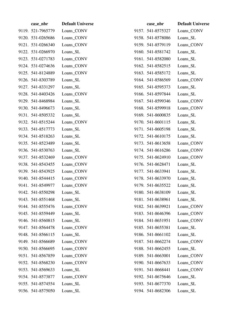 case_nbr Default Universe 9119. 521-7965779 Loans_CONV 9120. 531-0265686 Loans_CONV 9121. 531-0266340 Loans_CONV 9122. 531-0266970 Loans_SL 9123. 531-0271783 Loans_CONV 9124. 531-0274636 Loans_CONV 9125. 541-8124889 Loans_CONV 9126. 541-8303789 Loans_SL 9127. 541-8331297 Loans_SL 9128. 541-8403426 Loans_CONV 9129. 541-8468984 Loans_SL 9130. 541-8496673 Loans_SL 9131. 541-8505332 Loans_SL 9132. 541-8515244 Loans_CONV 9133. 541-8517773 Loans_SL 9134. 541-8518263 Loans_SL 9135. 541-8523489 Loans_SL 9136. 541-8530763 Loans_SL 9137. 541-8532469 Loans_CONV 9138. 541-8543455 Loans_CONV 9139. 541-8543925 Loans_CONV 9140. 541-8544415 Loans_CONV 9141. 541-8549977 Loans_CONV 9142. 541-8550298 Loans_SL 9143. 541-8551468 Loans_SL 9144. 541-8555476 Loans_CONV 9145. 541-8559449 Loans_SL 9146. 541-8560815 Loans_SL 9147. 541-8564478 Loans_CONV 9148. 541-8566115 Loans_SL 9149. 541-8566689 Loans_CONV 9150. 541-8566695 Loans_CONV 9151. 541-8567859 Loans_CONV 9152. 541-8568230 Loans_CONV 9153. 541-8569633 Loans_SL 9154. 541-8573877 Loans_CONV 9155. 541-8574554 Loans_SL 9156. 541-8575050 Loans_SL case_nbr Default Universe 9157. 541-8575327 Loans_CONV 9158. 541-8578086 Loans_SL 9159. 541-8579119 Loans_CONV 9160. 541-8581742 Loans_SL 9161. 541-8582080 Loans_SL 9162. 541-8582515 Loans_SL 9163. 541-8585172 Loans_SL 9164. 541-8586569 Loans_CONV 9165. 541-8595373 Loans_SL 9166. 541-8597844 Loans_SL 9167. 541-8599346 Loans_CONV 9168. 541-8599918 Loans_CONV 9169. 541-8600835 Loans_SL 9170. 541-8601115 Loans_SL 9171. 541-8605198 Loans_SL 9172. 541-8610175 Loans_SL 9173. 541-8613658 Loans_CONV 9174. 541-8616286 Loans_CONV 9175. 541-8624910 Loans_CONV 9176. 541-8628471 Loans_SL 9177. 541-8633941 Loans_SL 9178. 541-8633970 Loans_SL 9179. 541-8635522 Loans_SL 9180. 541-8638109 Loans_SL 9181. 541-8638961 Loans_SL 9182. 541-8639921 Loans_CONV 9183. 541-8646396 Loans_CONV 9184. 541-8651951 Loans_CONV 9185. 541-8655381 Loans_SL 9186. 541-8661102 Loans_SL 9187. 541-8662274 Loans_CONV 9188. 541-8662455 Loans_SL 9189. 541-8663001 Loans_CONV 9190. 541-8667633 Loans_CONV 9191. 541-8668441 Loans_CONV 9192. 541-8675646 Loans_SL 9193. 541-8677370 Loans_SL 9194. 541-8682306 Loans_SL