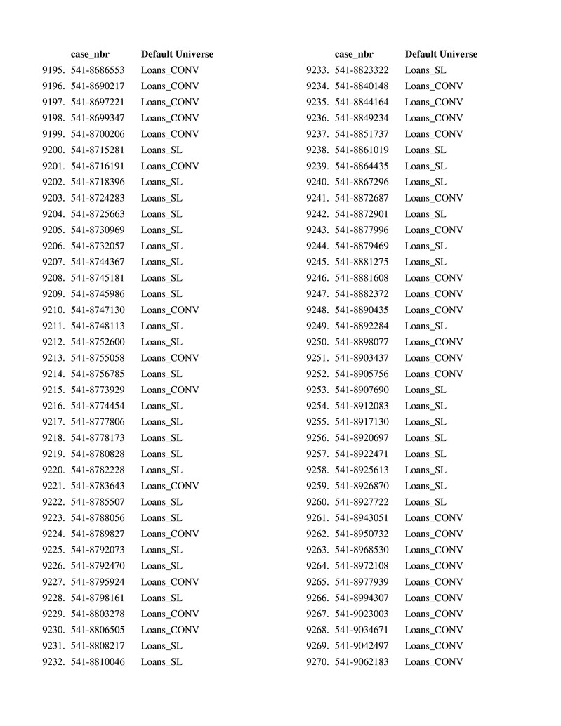case_nbr Default Universe 9195. 541-8686553 Loans_CONV 9196. 541-8690217 Loans_CONV 9197. 541-8697221 Loans_CONV 9198. 541-8699347 Loans_CONV 9199. 541-8700206 Loans_CONV 9200. 541-8715281 Loans_SL 9201. 541-8716191 Loans_CONV 9202. 541-8718396 Loans_SL 9203. 541-8724283 Loans_SL 9204. 541-8725663 Loans_SL 9205. 541-8730969 Loans_SL 9206. 541-8732057 Loans_SL 9207. 541-8744367 Loans_SL 9208. 541-8745181 Loans_SL 9209. 541-8745986 Loans_SL 9210. 541-8747130 Loans_CONV 9211. 541-8748113 Loans_SL 9212. 541-8752600 Loans_SL 9213. 541-8755058 Loans_CONV 9214. 541-8756785 Loans_SL 9215. 541-8773929 Loans_CONV 9216. 541-8774454 Loans_SL 9217. 541-8777806 Loans_SL 9218. 541-8778173 Loans_SL 9219. 541-8780828 Loans_SL 9220. 541-8782228 Loans_SL 9221. 541-8783643 Loans_CONV 9222. 541-8785507 Loans_SL 9223. 541-8788056 Loans_SL 9224. 541-8789827 Loans_CONV 9225. 541-8792073 Loans_SL 9226. 541-8792470 Loans_SL 9227. 541-8795924 Loans_CONV 9228. 541-8798161 Loans_SL 9229. 541-8803278 Loans_CONV 9230. 541-8806505 Loans_CONV 9231. 541-8808217 Loans_SL 9232. 541-8810046 Loans_SL case_nbr Default Universe 9233. 541-8823322 Loans_SL 9234. 541-8840148 Loans_CONV 9235. 541-8844164 Loans_CONV 9236. 541-8849234 Loans_CONV 9237. 541-8851737 Loans_CONV 9238. 541-8861019 Loans_SL 9239. 541-8864435 Loans_SL 9240. 541-8867296 Loans_SL 9241. 541-8872687 Loans_CONV 9242. 541-8872901 Loans_SL 9243. 541-8877996 Loans_CONV 9244. 541-8879469 Loans_SL 9245. 541-8881275 Loans_SL 9246. 541-8881608 Loans_CONV 9247. 541-8882372 Loans_CONV 9248. 541-8890435 Loans_CONV 9249. 541-8892284 Loans_SL 9250. 541-8898077 Loans_CONV 9251. 541-8903437 Loans_CONV 9252. 541-8905756 Loans_CONV 9253. 541-8907690 Loans_SL 9254. 541-8912083 Loans_SL 9255. 541-8917130 Loans_SL 9256. 541-8920697 Loans_SL 9257. 541-8922471 Loans_SL 9258. 541-8925613 Loans_SL 9259. 541-8926870 Loans_SL 9260. 541-8927722 Loans_SL 9261. 541-8943051 Loans_CONV 9262. 541-8950732 Loans_CONV 9263. 541-8968530 Loans_CONV 9264. 541-8972108 Loans_CONV 9265. 541-8977939 Loans_CONV 9266. 541-8994307 Loans_CONV 9267. 541-9023003 Loans_CONV 9268. 541-9034671 Loans_CONV 9269. 541-9042497 Loans_CONV 9270. 541-9062183 Loans_CONV
