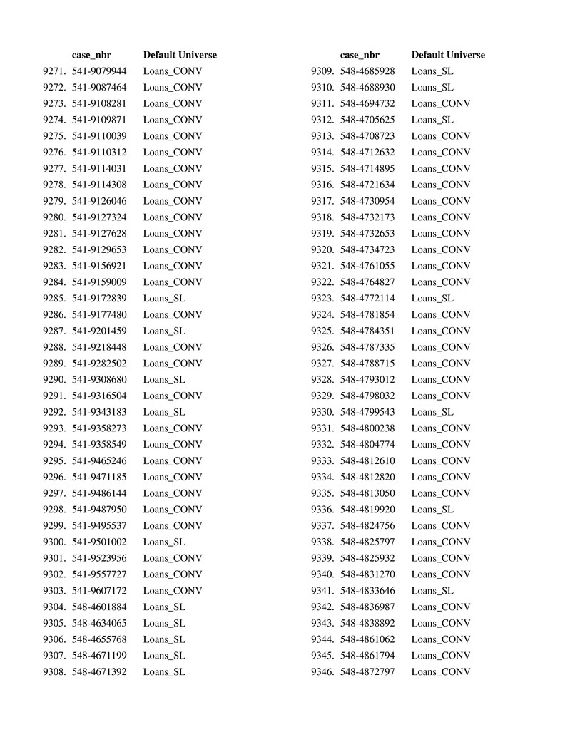 case_nbr Default Universe 9271. 541-9079944 Loans_CONV 9272. 541-9087464 Loans_CONV 9273. 541-9108281 Loans_CONV 9274. 541-9109871 Loans_CONV 9275. 541-9110039 Loans_CONV 9276. 541-9110312 Loans_CONV 9277. 541-9114031 Loans_CONV 9278. 541-9114308 Loans_CONV 9279. 541-9126046 Loans_CONV 9280. 541-9127324 Loans_CONV 9281. 541-9127628 Loans_CONV 9282. 541-9129653 Loans_CONV 9283. 541-9156921 Loans_CONV 9284. 541-9159009 Loans_CONV 9285. 541-9172839 Loans_SL 9286. 541-9177480 Loans_CONV 9287. 541-9201459 Loans_SL 9288. 541-9218448 Loans_CONV 9289. 541-9282502 Loans_CONV 9290. 541-9308680 Loans_SL 9291. 541-9316504 Loans_CONV 9292. 541-9343183 Loans_SL 9293. 541-9358273 Loans_CONV 9294. 541-9358549 Loans_CONV 9295. 541-9465246 Loans_CONV 9296. 541-9471185 Loans_CONV 9297. 541-9486144 Loans_CONV 9298. 541-9487950 Loans_CONV 9299. 541-9495537 Loans_CONV 9300. 541-9501002 Loans_SL 9301. 541-9523956 Loans_CONV 9302. 541-9557727 Loans_CONV 9303. 541-9607172 Loans_CONV 9304. 548-4601884 Loans_SL 9305. 548-4634065 Loans_SL 9306. 548-4655768 Loans_SL 9307. 548-4671199 Loans_SL 9308. 548-4671392 Loans_SL case_nbr Default Universe 9309. 548-4685928 Loans_SL 9310. 548-4688930 Loans_SL 9311. 548-4694732 Loans_CONV 9312. 548-4705625 Loans_SL 9313. 548-4708723 Loans_CONV 9314. 548-4712632 Loans_CONV 9315. 548-4714895 Loans_CONV 9316. 548-4721634 Loans_CONV 9317. 548-4730954 Loans_CONV 9318. 548-4732173 Loans_CONV 9319. 548-4732653 Loans_CONV 9320. 548-4734723 Loans_CONV 9321. 548-4761055 Loans_CONV 9322. 548-4764827 Loans_CONV 9323. 548-4772114 Loans_SL 9324. 548-4781854 Loans_CONV 9325. 548-4784351 Loans_CONV 9326. 548-4787335 Loans_CONV 9327. 548-4788715 Loans_CONV 9328. 548-4793012 Loans_CONV 9329. 548-4798032 Loans_CONV 9330. 548-4799543 Loans_SL 9331. 548-4800238 Loans_CONV 9332. 548-4804774 Loans_CONV 9333. 548-4812610 Loans_CONV 9334. 548-4812820 Loans_CONV 9335. 548-4813050 Loans_CONV 9336. 548-4819920 Loans_SL 9337. 548-4824756 Loans_CONV 9338. 548-4825797 Loans_CONV 9339. 548-4825932 Loans_CONV 9340. 548-4831270 Loans_CONV 9341. 548-4833646 Loans_SL 9342. 548-4836987 Loans_CONV 9343. 548-4838892 Loans_CONV 9344. 548-4861062 Loans_CONV 9345. 548-4861794 Loans_CONV 9346. 548-4872797 Loans_CONV