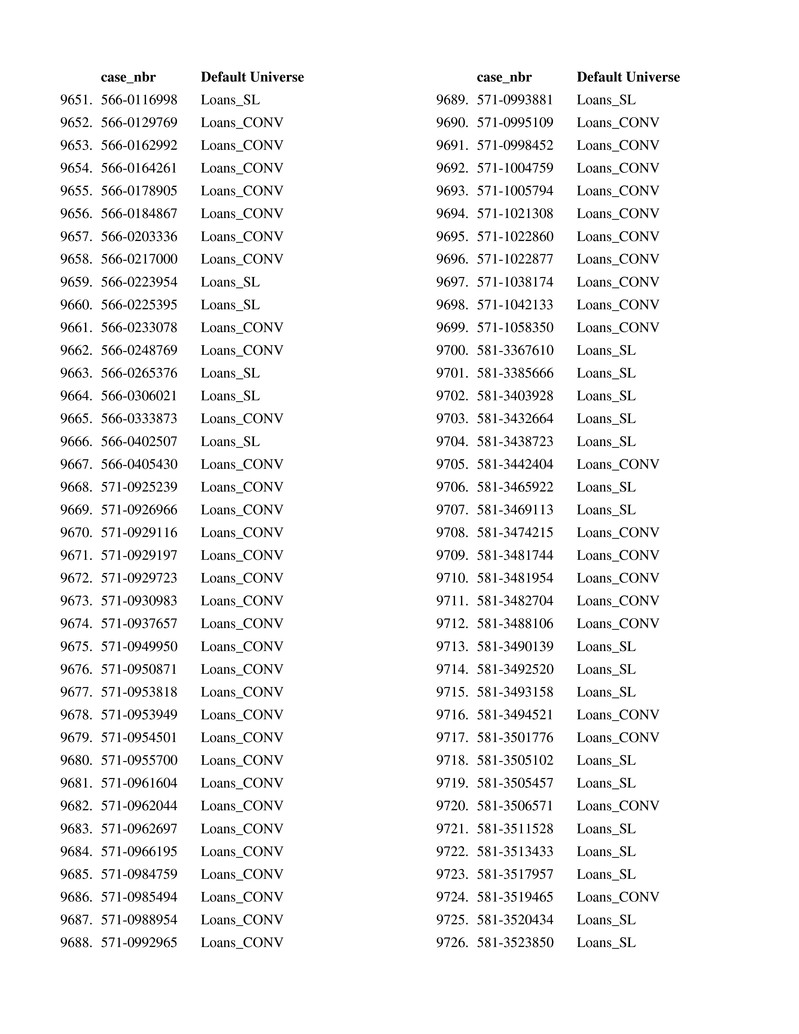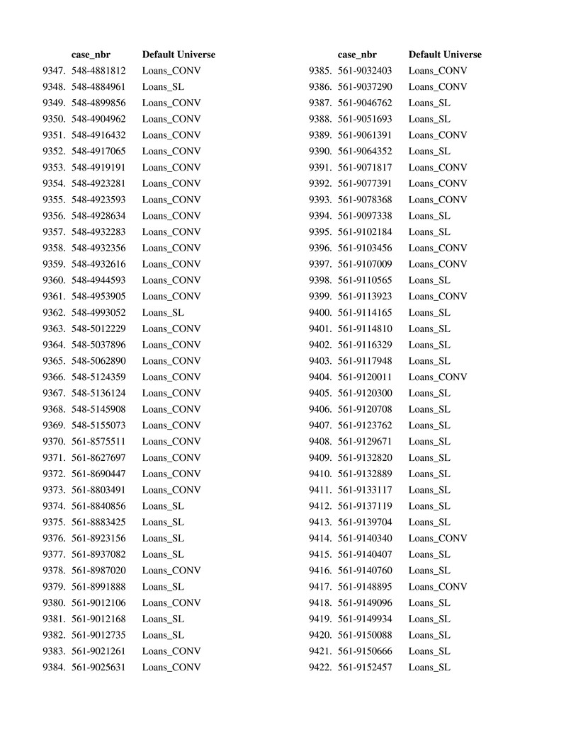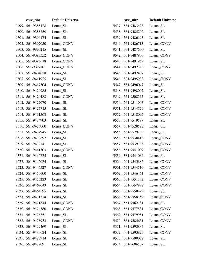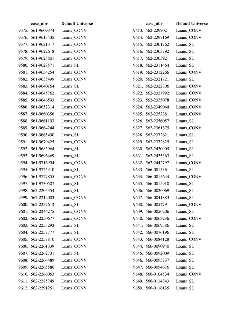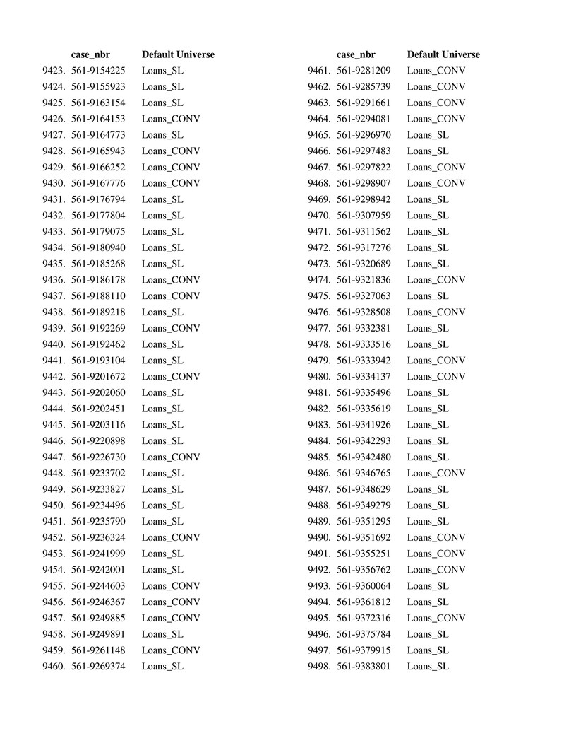 case_nbr Default Universe 9499. 561-9385428 Loans_SL 9500. 561-9388759 Loans_SL 9501. 561-9390174 Loans_SL 9502. 561-9392050 Loans_CONV 9503. 561-9395215 Loans_SL 9504. 561-9395352 Loans_CONV 9505. 561-9396618 Loans_CONV 9506. 561-9397881 Loans_CONV 9507. 561-9404028 Loans_SL 9508. 561-9411925 Loans_SL 9509. 561-9417304 Loans_CONV 9510. 561-9420985 Loans_SL 9511. 561-9424488 Loans_CONV 9512. 561-9427070 Loans_SL 9513. 561-9427715 Loans_SL 9514. 561-9431568 Loans_SL 9515. 561-9434903 Loans_SL 9516. 561-9435060 Loans_CONV 9517. 561-9437945 Loans_SL 9518. 561-9438697 Loans_SL 9519. 561-9439141 Loans_SL 9520. 561-9441303 Loans_CONV 9521. 561-9442735 Loans_SL 9522. 561-9446034 Loans_SL 9523. 561-9446527 Loans_CONV 9524. 561-9450600 Loans_SL 9525. 561-9455223 Loans_SL 9526. 561-9462043 Loans_SL 9527. 561-9464595 Loans_SL 9528. 561-9471328 Loans_SL 9529. 561-9471844 Loans_CONV 9530. 561-9474780 Loans_CONV 9531. 561-9476751 Loans_SL 9532. 561-9478933 Loans_CONV 9533. 561-9479469 Loans_SL 9534. 561-9480024 Loans_SL 9535. 561-9480914 Loans_SL 9536. 561-9482091 Loans_SL case_nbr Default Universe 9537. 561-9483428 Loans_SL 9538. 561-9485202 Loans_SL 9539. 561-9486193 Loans_SL 9540. 561-9486713 Loans_CONV 9541. 561-9487600 Loans_SL 9542. 561-9487906 Loans_CONV 9543. 561-9491969 Loans_SL 9544. 561-9492375 Loans_CONV 9545. 561-9492407 Loans_SL 9546. 561-9495983 Loans_CONV 9547. 561-9496047 Loans_SL 9548. 561-9498002 Loans_SL 9549. 561-9508565 Loans_SL 9550. 561-9511007 Loans_CONV 9551. 561-9514729 Loans_CONV 9552. 561-9518005 Loans_CONV 9553. 561-9519597 Loans_SL 9554. 561-9520572 Loans_SL 9555. 561-9529299 Loans_SL 9556. 561-9538413 Loans_CONV 9557. 561-9539136 Loans_CONV 9558. 561-9541009 Loans_CONV 9559. 561-9541084 Loans_SL 9560. 561-9543885 Loans_CONV 9561. 561-9544510 Loans_CONV 9562. 561-9546461 Loans_CONV 9563. 561-9551172 Loans_CONV 9564. 561-9557928 Loans_CONV 9565. 561-9558499 Loans_SL 9566. 561-9558759 Loans_CONV 9567. 561-9562181 Loans_SL 9568. 561-9577531 Loans_CONV 9569. 561-9579981 Loans_CONV 9570. 561-9585631 Loans_CONV 9571. 561-9592834 Loans_SL 9572. 561-9593875 Loans_CONV 9573. 561-9598078 Loans_SL 9574. 561-9606507 Loans_SL