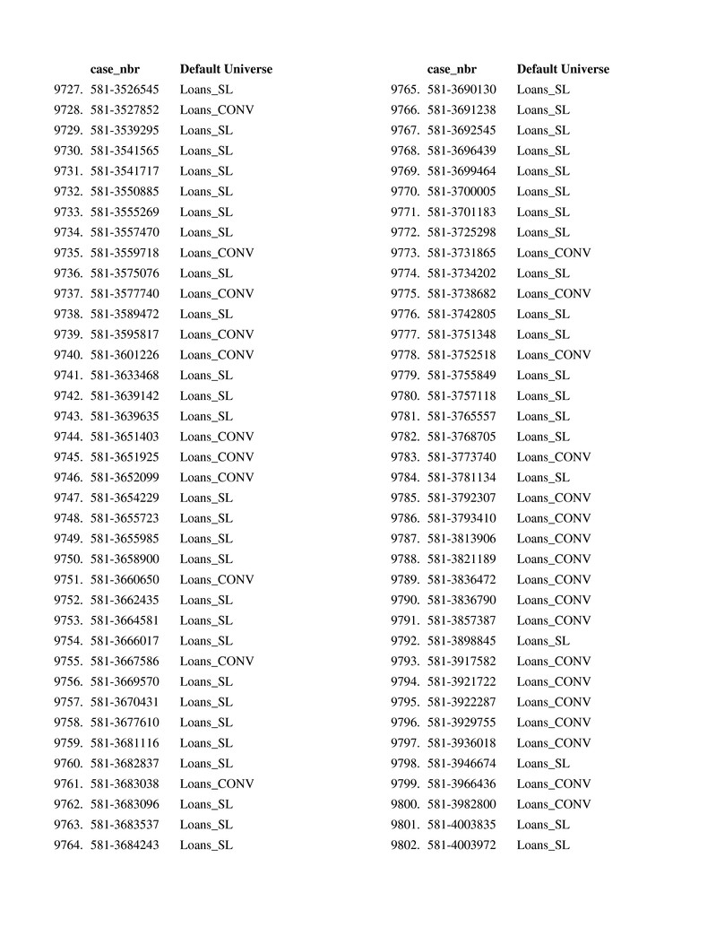 case_nbr Default Universe 9727. 581-3526545 Loans_SL 9728. 581-3527852 Loans_CONV 9729. 581-3539295 Loans_SL 9730. 581-3541565 Loans_SL 9731. 581-3541717 Loans_SL 9732. 581-3550885 Loans_SL 9733. 581-3555269 Loans_SL 9734. 581-3557470 Loans_SL 9735. 581-3559718 Loans_CONV 9736. 581-3575076 Loans_SL 9737. 581-3577740 Loans_CONV 9738. 581-3589472 Loans_SL 9739. 581-3595817 Loans_CONV 9740. 581-3601226 Loans_CONV 9741. 581-3633468 Loans_SL 9742. 581-3639142 Loans_SL 9743. 581-3639635 Loans_SL 9744. 581-3651403 Loans_CONV 9745. 581-3651925 Loans_CONV 9746. 581-3652099 Loans_CONV 9747. 581-3654229 Loans_SL 9748. 581-3655723 Loans_SL 9749. 581-3655985 Loans_SL 9750. 581-3658900 Loans_SL 9751. 581-3660650 Loans_CONV 9752. 581-3662435 Loans_SL 9753. 581-3664581 Loans_SL 9754. 581-3666017 Loans_SL 9755. 581-3667586 Loans_CONV 9756. 581-3669570 Loans_SL 9757. 581-3670431 Loans_SL 9758. 581-3677610 Loans_SL 9759. 581-3681116 Loans_SL 9760. 581-3682837 Loans_SL 9761. 581-3683038 Loans_CONV 9762. 581-3683096 Loans_SL 9763. 581-3683537 Loans_SL 9764. 581-3684243 Loans_SL case_nbr Default Universe 9765. 581-3690130 Loans_SL 9766. 581-3691238 Loans_SL 9767. 581-3692545 Loans_SL 9768. 581-3696439 Loans_SL 9769. 581-3699464 Loans_SL 9770. 581-3700005 Loans_SL 9771. 581-3701183 Loans_SL 9772. 581-3725298 Loans_SL 9773. 581-3731865 Loans_CONV 9774. 581-3734202 Loans_SL 9775. 581-3738682 Loans_CONV 9776. 581-3742805 Loans_SL 9777. 581-3751348 Loans_SL 9778. 581-3752518 Loans_CONV 9779. 581-3755849 Loans_SL 9780. 581-3757118 Loans_SL 9781. 581-3765557 Loans_SL 9782. 581-3768705 Loans_SL 9783. 581-3773740 Loans_CONV 9784. 581-3781134 Loans_SL 9785. 581-3792307 Loans_CONV 9786. 581-3793410 Loans_CONV 9787. 581-3813906 Loans_CONV 9788. 581-3821189 Loans_CONV 9789. 581-3836472 Loans_CONV 9790. 581-3836790 Loans_CONV 9791. 581-3857387 Loans_CONV 9792. 581-3898845 Loans_SL 9793. 581-3917582 Loans_CONV 9794. 581-3921722 Loans_CONV 9795. 581-3922287 Loans_CONV 9796. 581-3929755 Loans_CONV 9797. 581-3936018 Loans_CONV 9798. 581-3946674 Loans_SL 9799. 581-3966436 Loans_CONV 9800. 581-3982800 Loans_CONV 9801. 581-4003835 Loans_SL 9802. 581-4003972 Loans_SL