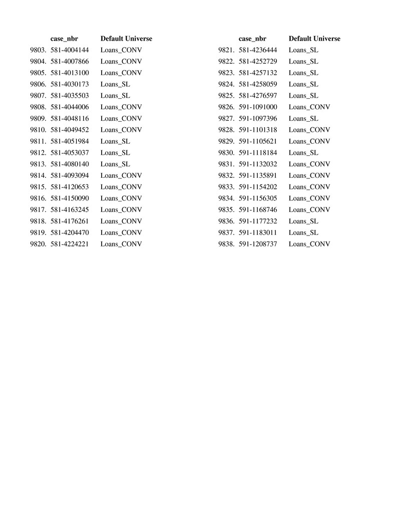 case_nbr Default Universe 9803. 581-4004144 Loans_CONV 9804. 581-4007866 Loans_CONV 9805. 581-4013100 Loans_CONV 9806. 581-4030173 Loans_SL 9807. 581-4035503 Loans_SL 9808. 581-4044006 Loans_CONV 9809. 581-4048116 Loans_CONV 9810. 581-4049452 Loans_CONV 9811. 581-4051984 Loans_SL 9812. 581-4053037 Loans_SL 9813. 581-4080140 Loans_SL 9814. 581-4093094 Loans_CONV 9815. 581-4120653 Loans_CONV 9816. 581-4150090 Loans_CONV 9817. 581-4163245 Loans_CONV 9818. 581-4176261 Loans_CONV 9819. 581-4204470 Loans_CONV 9820. 581-4224221 Loans_CONV case_nbr Default Universe 9821. 581-4236444 Loans_SL 9822. 581-4252729 Loans_SL 9823. 581-4257132 Loans_SL 9824. 581-4258059 Loans_SL 9825. 581-4276597 Loans_SL 9826. 591-1091000 Loans_CONV 9827. 591-1097396 Loans_SL 9828. 591-1101318 Loans_CONV 9829. 591-1105621 Loans_CONV 9830. 591-1118184 Loans_SL 9831. 591-1132032 Loans_CONV 9832. 591-1135891 Loans_CONV 9833. 591-1154202 Loans_CONV 9834. 591-1156305 Loans_CONV 9835. 591-1168746 Loans_CONV 9836. 591-1177232 Loans_SL 9837. 591-1183011 Loans_SL 9838. 591-1208737 Loans_CONV
