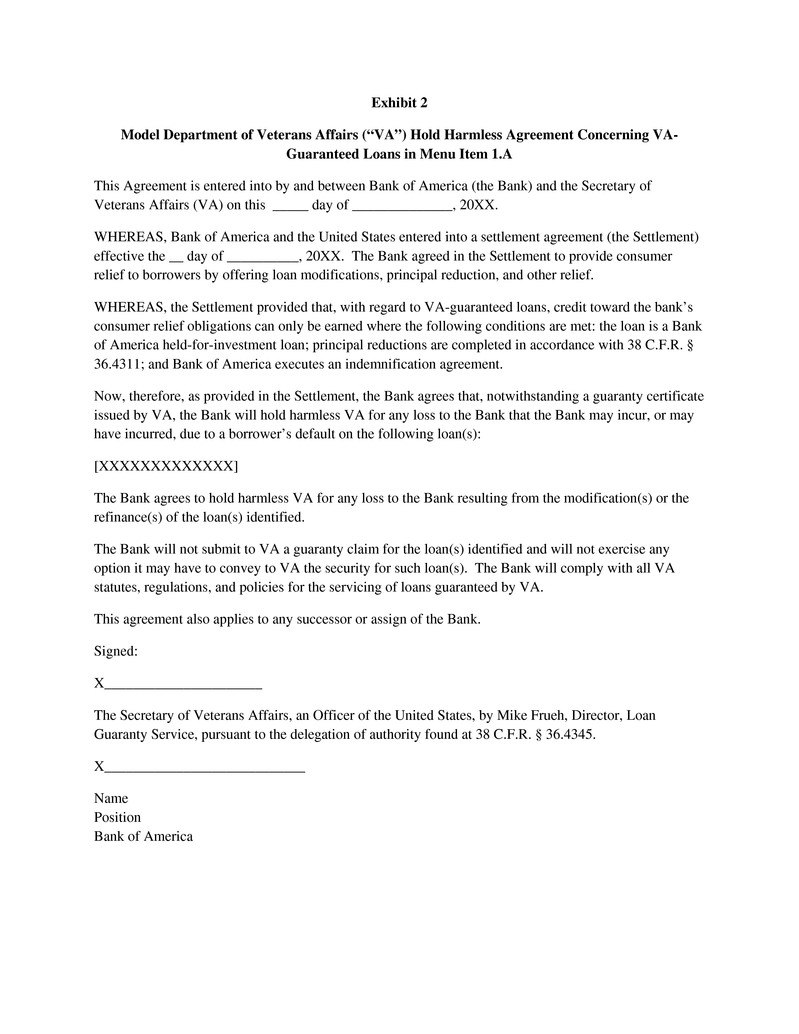 Exhibit 2 Model Department of Veterans Affairs (“VA”) Hold Harmless Agreement Concerning VA- Guaranteed Loans in Menu Item 1.A This Agreement is entered into by and between Bank of America (the Bank) and the Secretary of Veterans Affairs (VA) on this _____ day of ______________, 20XX. WHEREAS, Bank of America and the United States entered into a settlement agreement (the Settlement) effective the __ day of __________, 20XX. The Bank agreed in the Settlement to provide consumer relief to borrowers by offering loan modifications, principal reduction, and other relief. WHEREAS, the Settlement provided that, with regard to VA-guaranteed loans, credit toward the bank’s consumer relief obligations can only be earned where the following conditions are met: the loan is a Bank of America held-for-investment loan; principal reductions are completed in accordance with 38 C.F.R. § 36.4311; and Bank of America executes an indemnification agreement. Now, therefore, as provided in the Settlement, the Bank agrees that, notwithstanding a guaranty certificate issued by VA, the Bank will hold harmless VA for any loss to the Bank that the Bank may incur, or may have incurred, due to a borrower’s default on the following loan(s): [XXXXXXXXXXXXX] The Bank agrees to hold harmless VA for any loss to the Bank resulting from the modification(s) or the refinance(s) of the loan(s) identified. The Bank will not submit to VA a guaranty claim for the loan(s) identified and will not exercise any option it may have to convey to VA the security for such loan(s). The Bank will comply with all VA statutes, regulations, and policies for the servicing of loans guaranteed by VA. This agreement also applies to any successor or assign of the Bank. Signed: X______________________ The Secretary of Veterans Affairs, an Officer of the United States, by Mike Frueh, Director, Loan Guaranty Service, pursuant to the delegation of authority found at 38 C.F.R. § 36.4345. X____________________________ Name Position Bank of America