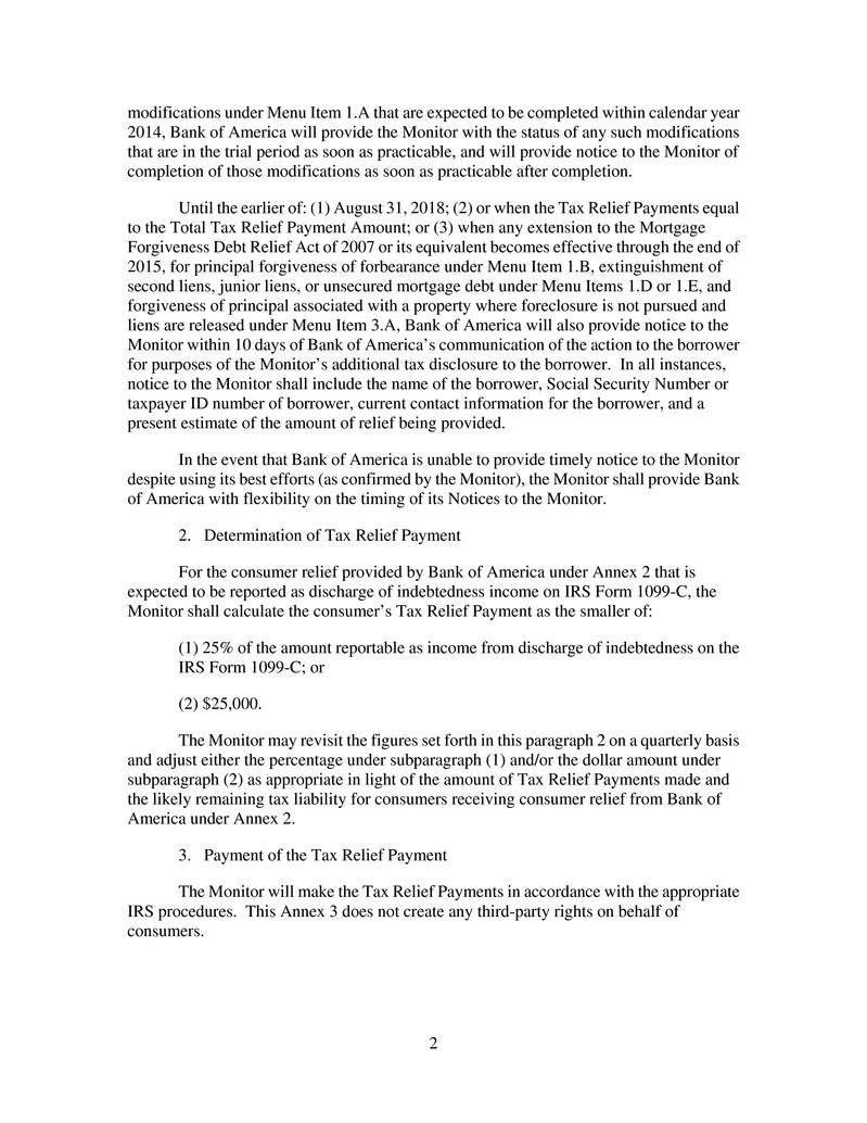 2 modifications under Menu Item 1.A that are expected to be completed within calendar year 2014, Bank of America will provide the Monitor with the status of any such modifications that are in the trial period as soon as practicable, and will provide notice to the Monitor of completion of those modifications as soon as practicable after completion. Until the earlier of: (1) August 31, 2018; (2) or when the Tax Relief Payments equal to the Total Tax Relief Payment Amount; or (3) when any extension to the Mortgage Forgiveness Debt Relief Act of 2007 or its equivalent becomes effective through the end of 2015, for principal forgiveness of forbearance under Menu Item 1.B, extinguishment of second liens, junior liens, or unsecured mortgage debt under Menu Items 1.D or 1.E, and forgiveness of principal associated with a property where foreclosure is not pursued and liens are released under Menu Item 3.A, Bank of America will also provide notice to the Monitor within 10 days of Bank of America’s communication of the action to the borrower for purposes of the Monitor’s additional tax disclosure to the borrower. In all instances, notice to the Monitor shall include the name of the borrower, Social Security Number or taxpayer ID number of borrower, current contact information for the borrower, and a present estimate of the amount of relief being provided. In the event that Bank of America is unable to provide timely notice to the Monitor despite using its best efforts (as confirmed by the Monitor), the Monitor shall provide Bank of America with flexibility on the timing of its Notices to the Monitor. 2. Determination of Tax Relief Payment For the consumer relief provided by Bank of America under Annex 2 that is expected to be reported as discharge of indebtedness income on IRS Form 1099-C, the Monitor shall calculate the consumer’s Tax Relief Payment as the smaller of: (1) 25% of the amount reportable as income from discharge of indebtedness on the IRS Form 1099-C; or (2) $25,000. The Monitor may revisit the figures set forth in this paragraph 2 on a quarterly basis and adjust either the percentage under subparagraph (1) and/or the dollar amount under subparagraph (2) as appropriate in light of the amount of Tax Relief Payments made and the likely remaining tax liability for consumers receiving consumer relief from Bank of America under Annex 2. 3. Payment of the Tax Relief Payment The Monitor will make the Tax Relief Payments in accordance with the appropriate IRS procedures. This Annex 3 does not create any third-party rights on behalf of consumers.