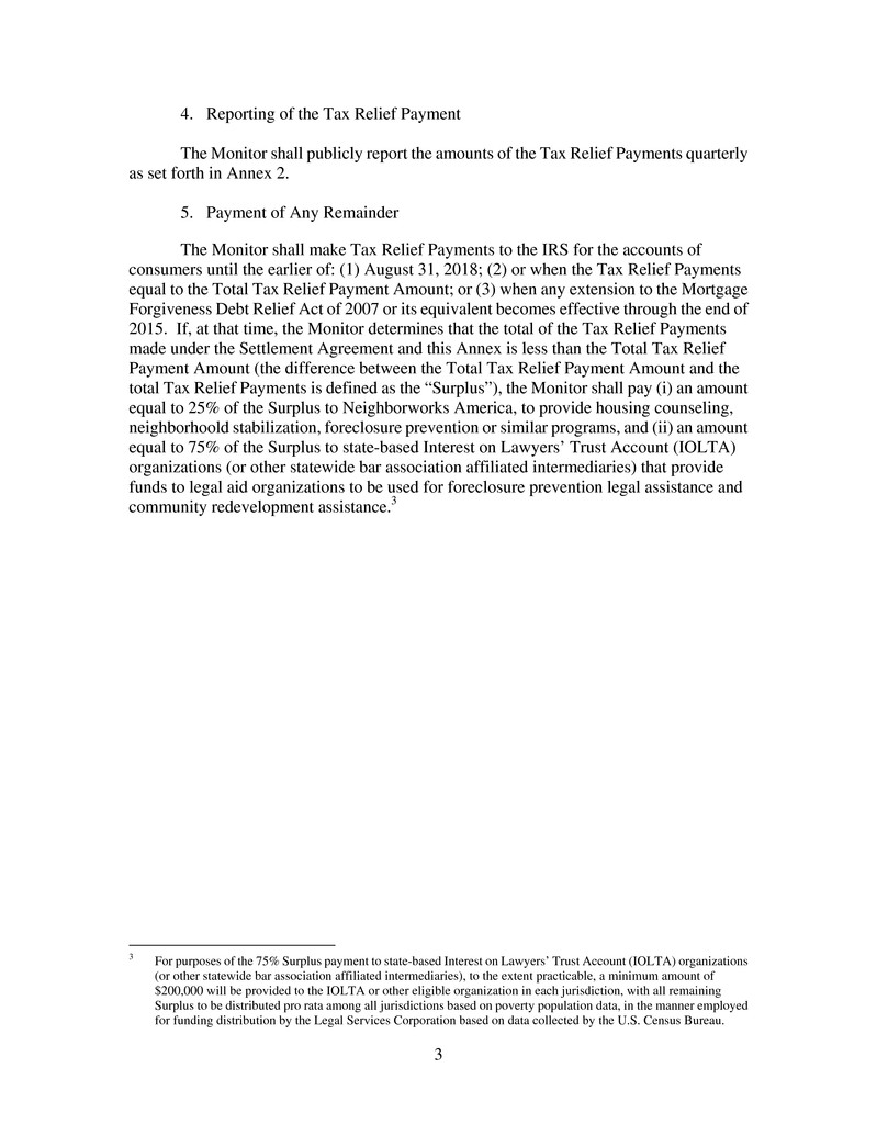 3 4. Reporting of the Tax Relief Payment The Monitor shall publicly report the amounts of the Tax Relief Payments quarterly as set forth in Annex 2. 5. Payment of Any Remainder The Monitor shall make Tax Relief Payments to the IRS for the accounts of consumers until the earlier of: (1) August 31, 2018; (2) or when the Tax Relief Payments equal to the Total Tax Relief Payment Amount; or (3) when any extension to the Mortgage Forgiveness Debt Relief Act of 2007 or its equivalent becomes effective through the end of 2015. If, at that time, the Monitor determines that the total of the Tax Relief Payments made under the Settlement Agreement and this Annex is less than the Total Tax Relief Payment Amount (the difference between the Total Tax Relief Payment Amount and the total Tax Relief Payments is defined as the “Surplus”), the Monitor shall pay (i) an amount equal to 25% of the Surplus to Neighborworks America, to provide housing counseling, neighborhoold stabilization, foreclosure prevention or similar programs, and (ii) an amount equal to 75% of the Surplus to state-based Interest on Lawyers’ Trust Account (IOLTA) organizations (or other statewide bar association affiliated intermediaries) that provide funds to legal aid organizations to be used for foreclosure prevention legal assistance and community redevelopment assistance.3 3 For purposes of the 75% Surplus payment to state-based Interest on Lawyers’ Trust Account (IOLTA) organizations (or other statewide bar association affiliated intermediaries), to the extent practicable, a minimum amount of $200,000 will be provided to the IOLTA or other eligible organization in each jurisdiction, with all remaining Surplus to be distributed pro rata among all jurisdictions based on poverty population data, in the manner employed for funding distribution by the Legal Services Corporation based on data collected by the U.S. Census Bureau.