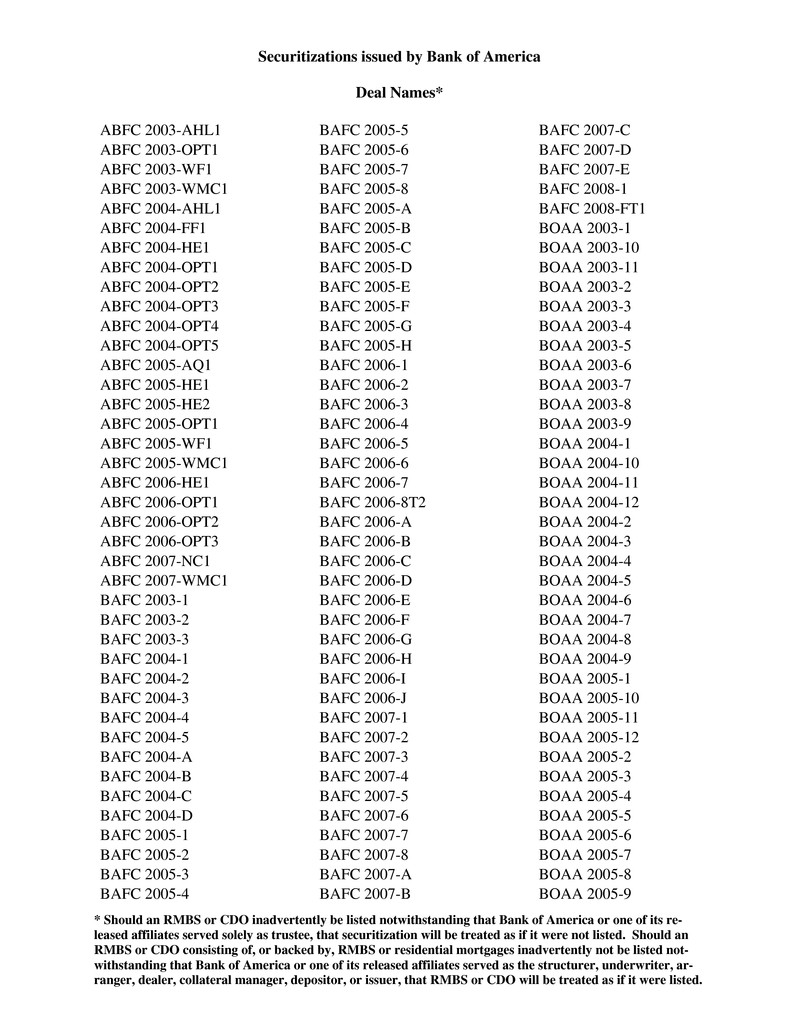 Securitizations issued by Bank of America Deal Names* * Should an RMBS or CDO inadvertently be listed notwithstanding that Bank of America or one of its re- leased affiliates served solely as trustee, that securitization will be treated as if it were not listed. Should an RMBS or CDO consisting of, or backed by, RMBS or residential mortgages inadvertently not be listed not- withstanding that Bank of America or one of its released affiliates served as the structurer, underwriter, ar- ranger, dealer, collateral manager, depositor, or issuer, that RMBS or CDO will be treated as if it were listed. ABFC 2003-AHL1 ABFC 2003-OPT1 ABFC 2003-WF1 ABFC 2003-WMC1 ABFC 2004-AHL1 ABFC 2004-FF1 ABFC 2004-HE1 ABFC 2004-OPT1 ABFC 2004-OPT2 ABFC 2004-OPT3 ABFC 2004-OPT4 ABFC 2004-OPT5 ABFC 2005-AQ1 ABFC 2005-HE1 ABFC 2005-HE2 ABFC 2005-OPT1 ABFC 2005-WF1 ABFC 2005-WMC1 ABFC 2006-HE1 ABFC 2006-OPT1 ABFC 2006-OPT2 ABFC 2006-OPT3 ABFC 2007-NC1 ABFC 2007-WMC1 BAFC 2003-1 BAFC 2003-2 BAFC 2003-3 BAFC 2004-1 BAFC 2004-2 BAFC 2004-3 BAFC 2004-4 BAFC 2004-5 BAFC 2004-A BAFC 2004-B BAFC 2004-C BAFC 2004-D BAFC 2005-1 BAFC 2005-2 BAFC 2005-3 BAFC 2005-4 BAFC 2005-5 BAFC 2005-6 BAFC 2005-7 BAFC 2005-8 BAFC 2005-A BAFC 2005-B BAFC 2005-C BAFC 2005-D BAFC 2005-E BAFC 2005-F BAFC 2005-G BAFC 2005-H BAFC 2006-1 BAFC 2006-2 BAFC 2006-3 BAFC 2006-4 BAFC 2006-5 BAFC 2006-6 BAFC 2006-7 BAFC 2006-8T2 BAFC 2006-A BAFC 2006-B BAFC 2006-C BAFC 2006-D BAFC 2006-E BAFC 2006-F BAFC 2006-G BAFC 2006-H BAFC 2006-I BAFC 2006-J BAFC 2007-1 BAFC 2007-2 BAFC 2007-3 BAFC 2007-4 BAFC 2007-5 BAFC 2007-6 BAFC 2007-7 BAFC 2007-8 BAFC 2007-A BAFC 2007-B BAFC 2007-C BAFC 2007-D BAFC 2007-E BAFC 2008-1 BAFC 2008-FT1 BOAA 2003-1 BOAA 2003-10 BOAA 2003-11 BOAA 2003-2 BOAA 2003-3 BOAA 2003-4 BOAA 2003-5 BOAA 2003-6 BOAA 2003-7 BOAA 2003-8 BOAA 2003-9 BOAA 2004-1 BOAA 2004-10 BOAA 2004-11 BOAA 2004-12 BOAA 2004-2 BOAA 2004-3 BOAA 2004-4 BOAA 2004-5 BOAA 2004-6 BOAA 2004-7 BOAA 2004-8 BOAA 2004-9 BOAA 2005-1 BOAA 2005-10 BOAA 2005-11 BOAA 2005-12 BOAA 2005-2 BOAA 2005-3 BOAA 2005-4 BOAA 2005-5 BOAA 2005-6 BOAA 2005-7 BOAA 2005-8 BOAA 2005-9