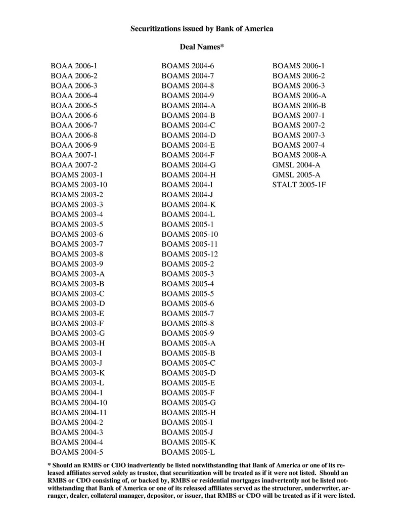 Securitizations issued by Bank of America Deal Names* * Should an RMBS or CDO inadvertently be listed notwithstanding that Bank of America or one of its re- leased affiliates served solely as trustee, that securitization will be treated as if it were not listed. Should an RMBS or CDO consisting of, or backed by, RMBS or residential mortgages inadvertently not be listed not- withstanding that Bank of America or one of its released affiliates served as the structurer, underwriter, ar- ranger, dealer, collateral manager, depositor, or issuer, that RMBS or CDO will be treated as if it were listed. BOAA 2006-1 BOAA 2006-2 BOAA 2006-3 BOAA 2006-4 BOAA 2006-5 BOAA 2006-6 BOAA 2006-7 BOAA 2006-8 BOAA 2006-9 BOAA 2007-1 BOAA 2007-2 BOAMS 2003-1 BOAMS 2003-10 BOAMS 2003-2 BOAMS 2003-3 BOAMS 2003-4 BOAMS 2003-5 BOAMS 2003-6 BOAMS 2003-7 BOAMS 2003-8 BOAMS 2003-9 BOAMS 2003-A BOAMS 2003-B BOAMS 2003-C BOAMS 2003-D BOAMS 2003-E BOAMS 2003-F BOAMS 2003-G BOAMS 2003-H BOAMS 2003-I BOAMS 2003-J BOAMS 2003-K BOAMS 2003-L BOAMS 2004-1 BOAMS 2004-10 BOAMS 2004-11 BOAMS 2004-2 BOAMS 2004-3 BOAMS 2004-4 BOAMS 2004-5 BOAMS 2004-6 BOAMS 2004-7 BOAMS 2004-8 BOAMS 2004-9 BOAMS 2004-A BOAMS 2004-B BOAMS 2004-C BOAMS 2004-D BOAMS 2004-E BOAMS 2004-F BOAMS 2004-G BOAMS 2004-H BOAMS 2004-I BOAMS 2004-J BOAMS 2004-K BOAMS 2004-L BOAMS 2005-1 BOAMS 2005-10 BOAMS 2005-11 BOAMS 2005-12 BOAMS 2005-2 BOAMS 2005-3 BOAMS 2005-4 BOAMS 2005-5 BOAMS 2005-6 BOAMS 2005-7 BOAMS 2005-8 BOAMS 2005-9 BOAMS 2005-A BOAMS 2005-B BOAMS 2005-C BOAMS 2005-D BOAMS 2005-E BOAMS 2005-F BOAMS 2005-G BOAMS 2005-H BOAMS 2005-I BOAMS 2005-J BOAMS 2005-K BOAMS 2005-L BOAMS 2006-1 BOAMS 2006-2 BOAMS 2006-3 BOAMS 2006-A BOAMS 2006-B BOAMS 2007-1 BOAMS 2007-2 BOAMS 2007-3 BOAMS 2007-4 BOAMS 2008-A GMSL 2004-A GMSL 2005-A STALT 2005-1F