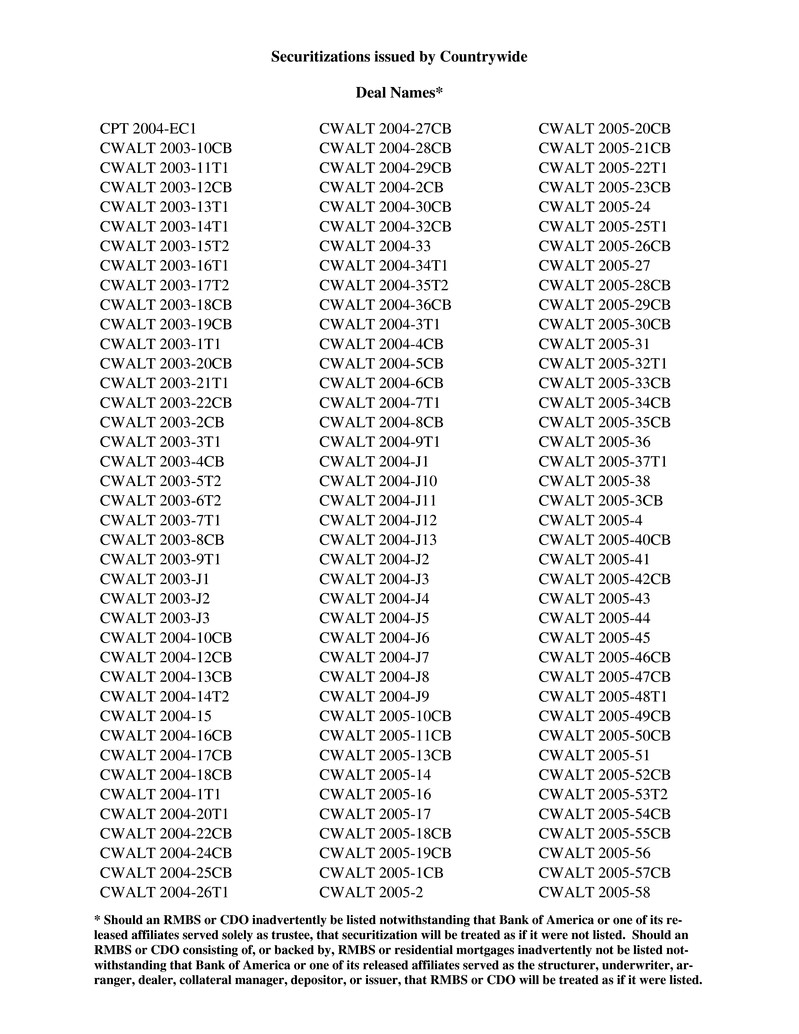 Securitizations issued by Countrywide Deal Names* * Should an RMBS or CDO inadvertently be listed notwithstanding that Bank of America or one of its re- leased affiliates served solely as trustee, that securitization will be treated as if it were not listed. Should an RMBS or CDO consisting of, or backed by, RMBS or residential mortgages inadvertently not be listed not- withstanding that Bank of America or one of its released affiliates served as the structurer, underwriter, ar- ranger, dealer, collateral manager, depositor, or issuer, that RMBS or CDO will be treated as if it were listed. CPT 2004-EC1 CWALT 2003-10CB CWALT 2003-11T1 CWALT 2003-12CB CWALT 2003-13T1 CWALT 2003-14T1 CWALT 2003-15T2 CWALT 2003-16T1 CWALT 2003-17T2 CWALT 2003-18CB CWALT 2003-19CB CWALT 2003-1T1 CWALT 2003-20CB CWALT 2003-21T1 CWALT 2003-22CB CWALT 2003-2CB CWALT 2003-3T1 CWALT 2003-4CB CWALT 2003-5T2 CWALT 2003-6T2 CWALT 2003-7T1 CWALT 2003-8CB CWALT 2003-9T1 CWALT 2003-J1 CWALT 2003-J2 CWALT 2003-J3 CWALT 2004-10CB CWALT 2004-12CB CWALT 2004-13CB CWALT 2004-14T2 CWALT 2004-15 CWALT 2004-16CB CWALT 2004-17CB CWALT 2004-18CB CWALT 2004-1T1 CWALT 2004-20T1 CWALT 2004-22CB CWALT 2004-24CB CWALT 2004-25CB CWALT 2004-26T1 CWALT 2004-27CB CWALT 2004-28CB CWALT 2004-29CB CWALT 2004-2CB CWALT 2004-30CB CWALT 2004-32CB CWALT 2004-33 CWALT 2004-34T1 CWALT 2004-35T2 CWALT 2004-36CB CWALT 2004-3T1 CWALT 2004-4CB CWALT 2004-5CB CWALT 2004-6CB CWALT 2004-7T1 CWALT 2004-8CB CWALT 2004-9T1 CWALT 2004-J1 CWALT 2004-J10 CWALT 2004-J11 CWALT 2004-J12 CWALT 2004-J13 CWALT 2004-J2 CWALT 2004-J3 CWALT 2004-J4 CWALT 2004-J5 CWALT 2004-J6 CWALT 2004-J7 CWALT 2004-J8 CWALT 2004-J9 CWALT 2005-10CB CWALT 2005-11CB CWALT 2005-13CB CWALT 2005-14 CWALT 2005-16 CWALT 2005-17 CWALT 2005-18CB CWALT 2005-19CB CWALT 2005-1CB CWALT 2005-2 CWALT 2005-20CB CWALT 2005-21CB CWALT 2005-22T1 CWALT 2005-23CB CWALT 2005-24 CWALT 2005-25T1 CWALT 2005-26CB CWALT 2005-27 CWALT 2005-28CB CWALT 2005-29CB CWALT 2005-30CB CWALT 2005-31 CWALT 2005-32T1 CWALT 2005-33CB CWALT 2005-34CB CWALT 2005-35CB CWALT 2005-36 CWALT 2005-37T1 CWALT 2005-38 CWALT 2005-3CB CWALT 2005-4 CWALT 2005-40CB CWALT 2005-41 CWALT 2005-42CB CWALT 2005-43 CWALT 2005-44 CWALT 2005-45 CWALT 2005-46CB CWALT 2005-47CB CWALT 2005-48T1 CWALT 2005-49CB CWALT 2005-50CB CWALT 2005-51 CWALT 2005-52CB CWALT 2005-53T2 CWALT 2005-54CB CWALT 2005-55CB CWALT 2005-56 CWALT 2005-57CB CWALT 2005-58