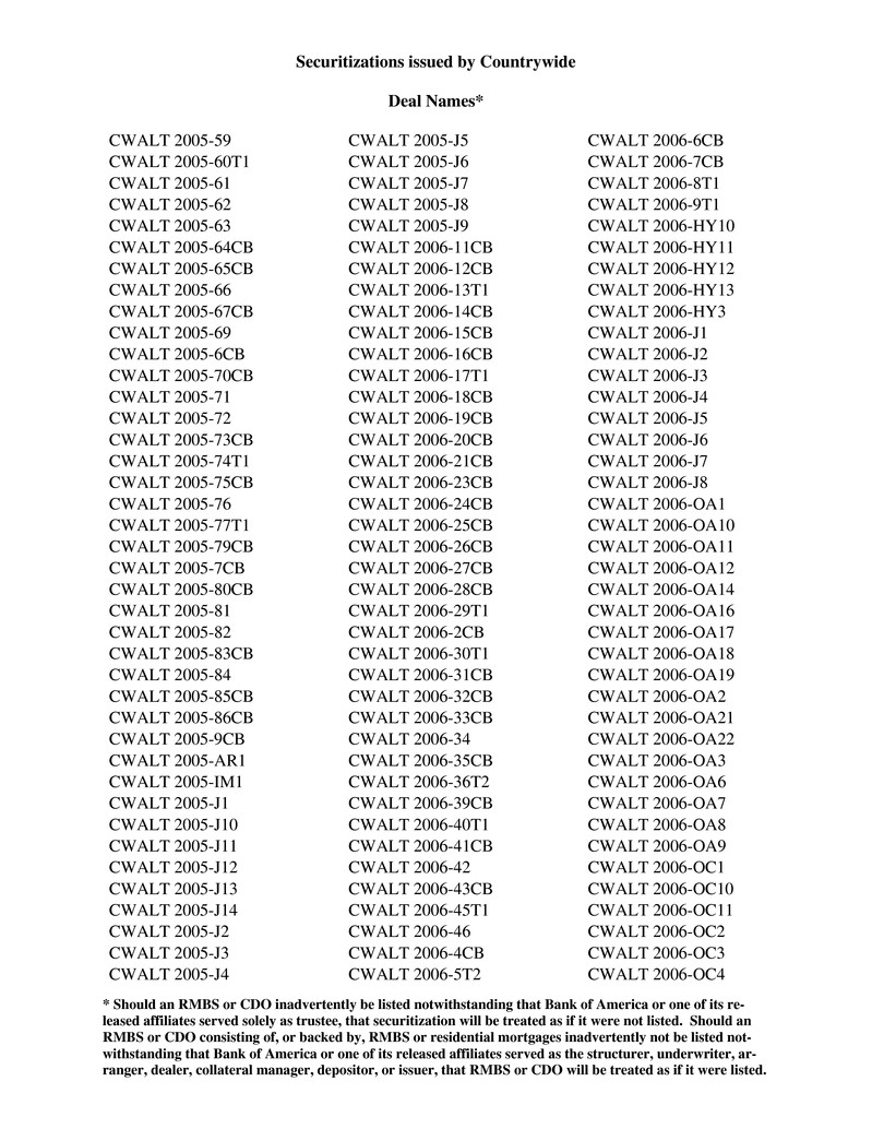 Securitizations issued by Countrywide Deal Names* * Should an RMBS or CDO inadvertently be listed notwithstanding that Bank of America or one of its re- leased affiliates served solely as trustee, that securitization will be treated as if it were not listed. Should an RMBS or CDO consisting of, or backed by, RMBS or residential mortgages inadvertently not be listed not- withstanding that Bank of America or one of its released affiliates served as the structurer, underwriter, ar- ranger, dealer, collateral manager, depositor, or issuer, that RMBS or CDO will be treated as if it were listed. CWALT 2005-59 CWALT 2005-60T1 CWALT 2005-61 CWALT 2005-62 CWALT 2005-63 CWALT 2005-64CB CWALT 2005-65CB CWALT 2005-66 CWALT 2005-67CB CWALT 2005-69 CWALT 2005-6CB CWALT 2005-70CB CWALT 2005-71 CWALT 2005-72 CWALT 2005-73CB CWALT 2005-74T1 CWALT 2005-75CB CWALT 2005-76 CWALT 2005-77T1 CWALT 2005-79CB CWALT 2005-7CB CWALT 2005-80CB CWALT 2005-81 CWALT 2005-82 CWALT 2005-83CB CWALT 2005-84 CWALT 2005-85CB CWALT 2005-86CB CWALT 2005-9CB CWALT 2005-AR1 CWALT 2005-IM1 CWALT 2005-J1 CWALT 2005-J10 CWALT 2005-J11 CWALT 2005-J12 CWALT 2005-J13 CWALT 2005-J14 CWALT 2005-J2 CWALT 2005-J3 CWALT 2005-J4 CWALT 2005-J5 CWALT 2005-J6 CWALT 2005-J7 CWALT 2005-J8 CWALT 2005-J9 CWALT 2006-11CB CWALT 2006-12CB CWALT 2006-13T1 CWALT 2006-14CB CWALT 2006-15CB CWALT 2006-16CB CWALT 2006-17T1 CWALT 2006-18CB CWALT 2006-19CB CWALT 2006-20CB CWALT 2006-21CB CWALT 2006-23CB CWALT 2006-24CB CWALT 2006-25CB CWALT 2006-26CB CWALT 2006-27CB CWALT 2006-28CB CWALT 2006-29T1 CWALT 2006-2CB CWALT 2006-30T1 CWALT 2006-31CB CWALT 2006-32CB CWALT 2006-33CB CWALT 2006-34 CWALT 2006-35CB CWALT 2006-36T2 CWALT 2006-39CB CWALT 2006-40T1 CWALT 2006-41CB CWALT 2006-42 CWALT 2006-43CB CWALT 2006-45T1 CWALT 2006-46 CWALT 2006-4CB CWALT 2006-5T2 CWALT 2006-6CB CWALT 2006-7CB CWALT 2006-8T1 CWALT 2006-9T1 CWALT 2006-HY10 CWALT 2006-HY11 CWALT 2006-HY12 CWALT 2006-HY13 CWALT 2006-HY3 CWALT 2006-J1 CWALT 2006-J2 CWALT 2006-J3 CWALT 2006-J4 CWALT 2006-J5 CWALT 2006-J6 CWALT 2006-J7 CWALT 2006-J8 CWALT 2006-OA1 CWALT 2006-OA10 CWALT 2006-OA11 CWALT 2006-OA12 CWALT 2006-OA14 CWALT 2006-OA16 CWALT 2006-OA17 CWALT 2006-OA18 CWALT 2006-OA19 CWALT 2006-OA2 CWALT 2006-OA21 CWALT 2006-OA22 CWALT 2006-OA3 CWALT 2006-OA6 CWALT 2006-OA7 CWALT 2006-OA8 CWALT 2006-OA9 CWALT 2006-OC1 CWALT 2006-OC10 CWALT 2006-OC11 CWALT 2006-OC2 CWALT 2006-OC3 CWALT 2006-OC4
