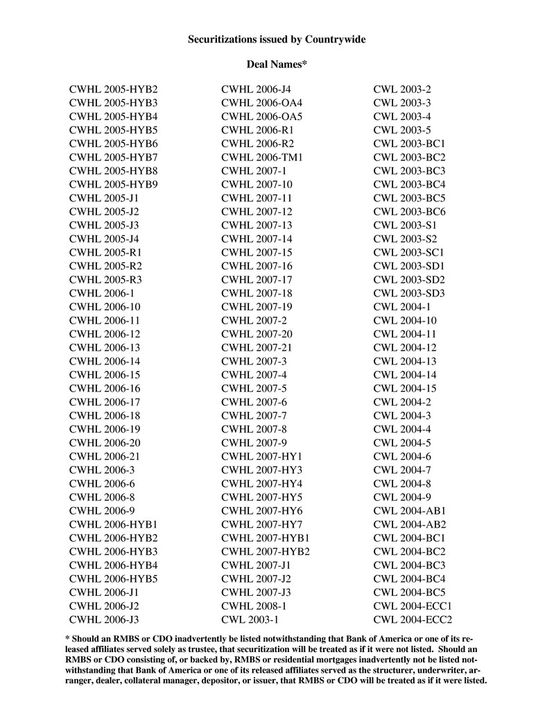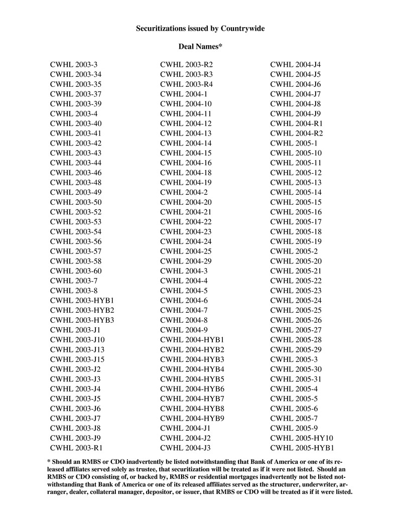 Securitizations issued by Countrywide Deal Names* * Should an RMBS or CDO inadvertently be listed notwithstanding that Bank of America or one of its re- leased affiliates served solely as trustee, that securitization will be treated as if it were not listed. Should an RMBS or CDO consisting of, or backed by, RMBS or residential mortgages inadvertently not be listed not- withstanding that Bank of America or one of its released affiliates served as the structurer, underwriter, ar- ranger, dealer, collateral manager, depositor, or issuer, that RMBS or CDO will be treated as if it were listed. CWHL 2005-HYB2 CWHL 2005-HYB3 CWHL 2005-HYB4 CWHL 2005-HYB5 CWHL 2005-HYB6 CWHL 2005-HYB7 CWHL 2005-HYB8 CWHL 2005-HYB9 CWHL 2005-J1 CWHL 2005-J2 CWHL 2005-J3 CWHL 2005-J4 CWHL 2005-R1 CWHL 2005-R2 CWHL 2005-R3 CWHL 2006-1 CWHL 2006-10 CWHL 2006-11 CWHL 2006-12 CWHL 2006-13 CWHL 2006-14 CWHL 2006-15 CWHL 2006-16 CWHL 2006-17 CWHL 2006-18 CWHL 2006-19 CWHL 2006-20 CWHL 2006-21 CWHL 2006-3 CWHL 2006-6 CWHL 2006-8 CWHL 2006-9 CWHL 2006-HYB1 CWHL 2006-HYB2 CWHL 2006-HYB3 CWHL 2006-HYB4 CWHL 2006-HYB5 CWHL 2006-J1 CWHL 2006-J2 CWHL 2006-J3 CWHL 2006-J4 CWHL 2006-OA4 CWHL 2006-OA5 CWHL 2006-R1 CWHL 2006-R2 CWHL 2006-TM1 CWHL 2007-1 CWHL 2007-10 CWHL 2007-11 CWHL 2007-12 CWHL 2007-13 CWHL 2007-14 CWHL 2007-15 CWHL 2007-16 CWHL 2007-17 CWHL 2007-18 CWHL 2007-19 CWHL 2007-2 CWHL 2007-20 CWHL 2007-21 CWHL 2007-3 CWHL 2007-4 CWHL 2007-5 CWHL 2007-6 CWHL 2007-7 CWHL 2007-8 CWHL 2007-9 CWHL 2007-HY1 CWHL 2007-HY3 CWHL 2007-HY4 CWHL 2007-HY5 CWHL 2007-HY6 CWHL 2007-HY7 CWHL 2007-HYB1 CWHL 2007-HYB2 CWHL 2007-J1 CWHL 2007-J2 CWHL 2007-J3 CWHL 2008-1 CWL 2003-1 CWL 2003-2 CWL 2003-3 CWL 2003-4 CWL 2003-5 CWL 2003-BC1 CWL 2003-BC2 CWL 2003-BC3 CWL 2003-BC4 CWL 2003-BC5 CWL 2003-BC6 CWL 2003-S1 CWL 2003-S2 CWL 2003-SC1 CWL 2003-SD1 CWL 2003-SD2 CWL 2003-SD3 CWL 2004-1 CWL 2004-10 CWL 2004-11 CWL 2004-12 CWL 2004-13 CWL 2004-14 CWL 2004-15 CWL 2004-2 CWL 2004-3 CWL 2004-4 CWL 2004-5 CWL 2004-6 CWL 2004-7 CWL 2004-8 CWL 2004-9 CWL 2004-AB1 CWL 2004-AB2 CWL 2004-BC1 CWL 2004-BC2 CWL 2004-BC3 CWL 2004-BC4 CWL 2004-BC5 CWL 2004-ECC1 CWL 2004-ECC2