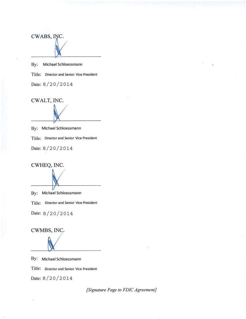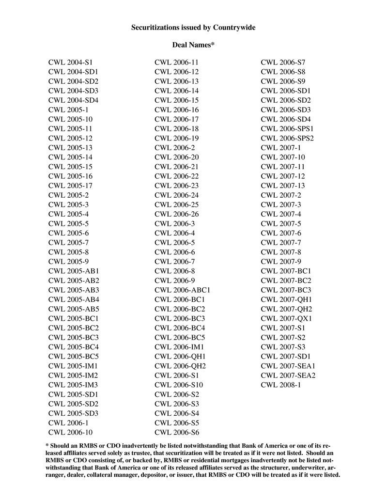 Securitizations issued by Countrywide Deal Names* * Should an RMBS or CDO inadvertently be listed notwithstanding that Bank of America or one of its re- leased affiliates served solely as trustee, that securitization will be treated as if it were not listed. Should an RMBS or CDO consisting of, or backed by, RMBS or residential mortgages inadvertently not be listed not- withstanding that Bank of America or one of its released affiliates served as the structurer, underwriter, ar- ranger, dealer, collateral manager, depositor, or issuer, that RMBS or CDO will be treated as if it were listed. CWL 2004-S1 CWL 2004-SD1 CWL 2004-SD2 CWL 2004-SD3 CWL 2004-SD4 CWL 2005-1 CWL 2005-10 CWL 2005-11 CWL 2005-12 CWL 2005-13 CWL 2005-14 CWL 2005-15 CWL 2005-16 CWL 2005-17 CWL 2005-2 CWL 2005-3 CWL 2005-4 CWL 2005-5 CWL 2005-6 CWL 2005-7 CWL 2005-8 CWL 2005-9 CWL 2005-AB1 CWL 2005-AB2 CWL 2005-AB3 CWL 2005-AB4 CWL 2005-AB5 CWL 2005-BC1 CWL 2005-BC2 CWL 2005-BC3 CWL 2005-BC4 CWL 2005-BC5 CWL 2005-IM1 CWL 2005-IM2 CWL 2005-IM3 CWL 2005-SD1 CWL 2005-SD2 CWL 2005-SD3 CWL 2006-1 CWL 2006-10 CWL 2006-11 CWL 2006-12 CWL 2006-13 CWL 2006-14 CWL 2006-15 CWL 2006-16 CWL 2006-17 CWL 2006-18 CWL 2006-19 CWL 2006-2 CWL 2006-20 CWL 2006-21 CWL 2006-22 CWL 2006-23 CWL 2006-24 CWL 2006-25 CWL 2006-26 CWL 2006-3 CWL 2006-4 CWL 2006-5 CWL 2006-6 CWL 2006-7 CWL 2006-8 CWL 2006-9 CWL 2006-ABC1 CWL 2006-BC1 CWL 2006-BC2 CWL 2006-BC3 CWL 2006-BC4 CWL 2006-BC5 CWL 2006-IM1 CWL 2006-QH1 CWL 2006-QH2 CWL 2006-S1 CWL 2006-S10 CWL 2006-S2 CWL 2006-S3 CWL 2006-S4 CWL 2006-S5 CWL 2006-S6 CWL 2006-S7 CWL 2006-S8 CWL 2006-S9 CWL 2006-SD1 CWL 2006-SD2 CWL 2006-SD3 CWL 2006-SD4 CWL 2006-SPS1 CWL 2006-SPS2 CWL 2007-1 CWL 2007-10 CWL 2007-11 CWL 2007-12 CWL 2007-13 CWL 2007-2 CWL 2007-3 CWL 2007-4 CWL 2007-5 CWL 2007-6 CWL 2007-7 CWL 2007-8 CWL 2007-9 CWL 2007-BC1 CWL 2007-BC2 CWL 2007-BC3 CWL 2007-QH1 CWL 2007-QH2 CWL 2007-QX1 CWL 2007-S1 CWL 2007-S2 CWL 2007-S3 CWL 2007-SD1 CWL 2007-SEA1 CWL 2007-SEA2 CWL 2008-1