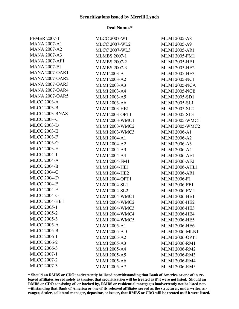 Securitizations issued by Merrill Lynch Deal Names* * Should an RMBS or CDO inadvertently be listed notwithstanding that Bank of America or one of its re- leased affiliates served solely as trustee, that securitization will be treated as if it were not listed. Should an RMBS or CDO consisting of, or backed by, RMBS or residential mortgages inadvertently not be listed not- withstanding that Bank of America or one of its released affiliates served as the structurer, underwriter, ar- ranger, dealer, collateral manager, depositor, or issuer, that RMBS or CDO will be treated as if it were listed. FFMER 2007-1 MANA 2007-A1 MANA 2007-A2 MANA 2007-A3 MANA 2007-AF1 MANA 2007-F1 MANA 2007-OAR1 MANA 2007-OAR2 MANA 2007-OAR3 MANA 2007-OAR4 MANA 2007-OAR5 MLCC 2003-A MLCC 2003-B MLCC 2003-BNAS MLCC 2003-C MLCC 2003-D MLCC 2003-E MLCC 2003-F MLCC 2003-G MLCC 2003-H MLCC 2004-1 MLCC 2004-A MLCC 2004-B MLCC 2004-C MLCC 2004-D MLCC 2004-E MLCC 2004-F MLCC 2004-G MLCC 2004-HB1 MLCC 2005-1 MLCC 2005-2 MLCC 2005-3 MLCC 2005-A MLCC 2005-B MLCC 2006-1 MLCC 2006-2 MLCC 2006-3 MLCC 2007-1 MLCC 2007-2 MLCC 2007-3 MLCC 2007-W1 MLCC 2007-WL2 MLCC 2007-WL3 MLMBS 2007-1 MLMBS 2007-2 MLMBS 2007-3 MLMI 2003-A1 MLMI 2003-A2 MLMI 2003-A3 MLMI 2003-A4 MLMI 2003-A5 MLMI 2003-A6 MLMI 2003-HE1 MLMI 2003-OPT1 MLMI 2003-WMC1 MLMI 2003-WMC2 MLMI 2003-WMC3 MLMI 2004-A1 MLMI 2004-A2 MLMI 2004-A3 MLMI 2004-A4 MLMI 2004-FM1 MLMI 2004-HE1 MLMI 2004-HE2 MLMI 2004-OPT1 MLMI 2004-SL1 MLMI 2004-SL2 MLMI 2004-WMC1 MLMI 2004-WMC2 MLMI 2004-WMC3 MLMI 2004-WMC4 MLMI 2004-WMC5 MLMI 2005-A1 MLMI 2005-A10 MLMI 2005-A2 MLMI 2005-A3 MLMI 2005-A4 MLMI 2005-A5 MLMI 2005-A6 MLMI 2005-A7 MLMI 2005-A8 MLMI 2005-A9 MLMI 2005-AR1 MLMI 2005-FM1 MLMI 2005-HE1 MLMI 2005-HE2 MLMI 2005-HE3 MLMI 2005-NC1 MLMI 2005-NCA MLMI 2005-NCB MLMI 2005-SD1 MLMI 2005-SL1 MLMI 2005-SL2 MLMI 2005-SL3 MLMI 2005-WMC1 MLMI 2005-WMC2 MLMI 2006-A1 MLMI 2006-A2 MLMI 2006-A3 MLMI 2006-A4 MLMI 2006-AF1 MLMI 2006-AF2 MLMI 2006-AHL1 MLMI 2006-AR1 MLMI 2006-F1 MLMI 2006-FF1 MLMI 2006-FM1 MLMI 2006-HE1 MLMI 2006-HE2 MLMI 2006-HE3 MLMI 2006-HE4 MLMI 2006-HE5 MLMI 2006-HE6 MLMI 2006-MLN1 MLMI 2006-OPT1 MLMI 2006-RM1 MLMI 2006-RM2 MLMI 2006-RM3 MLMI 2006-RM4 MLMI 2006-RM5