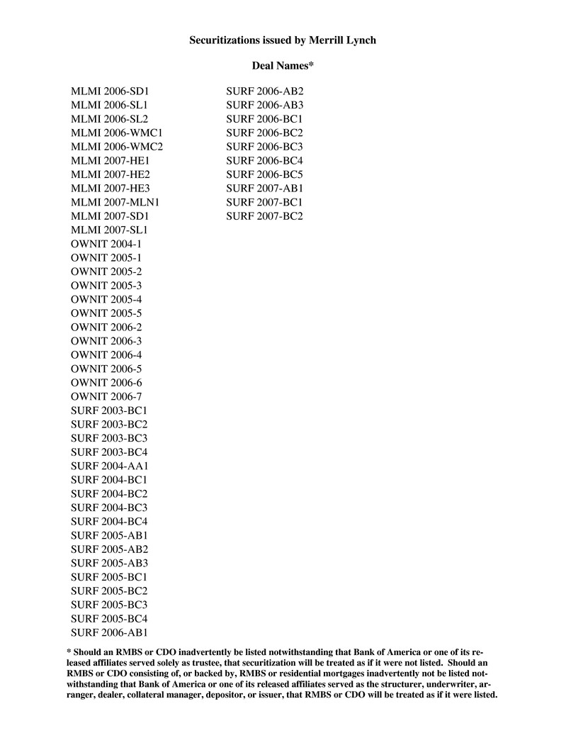 Securitizations issued by Merrill Lynch Deal Names* * Should an RMBS or CDO inadvertently be listed notwithstanding that Bank of America or one of its re- leased affiliates served solely as trustee, that securitization will be treated as if it were not listed. Should an RMBS or CDO consisting of, or backed by, RMBS or residential mortgages inadvertently not be listed not- withstanding that Bank of America or one of its released affiliates served as the structurer, underwriter, ar- ranger, dealer, collateral manager, depositor, or issuer, that RMBS or CDO will be treated as if it were listed. MLMI 2006-SD1 MLMI 2006-SL1 MLMI 2006-SL2 MLMI 2006-WMC1 MLMI 2006-WMC2 MLMI 2007-HE1 MLMI 2007-HE2 MLMI 2007-HE3 MLMI 2007-MLN1 MLMI 2007-SD1 MLMI 2007-SL1 OWNIT 2004-1 OWNIT 2005-1 OWNIT 2005-2 OWNIT 2005-3 OWNIT 2005-4 OWNIT 2005-5 OWNIT 2006-2 OWNIT 2006-3 OWNIT 2006-4 OWNIT 2006-5 OWNIT 2006-6 OWNIT 2006-7 SURF 2003-BC1 SURF 2003-BC2 SURF 2003-BC3 SURF 2003-BC4 SURF 2004-AA1 SURF 2004-BC1 SURF 2004-BC2 SURF 2004-BC3 SURF 2004-BC4 SURF 2005-AB1 SURF 2005-AB2 SURF 2005-AB3 SURF 2005-BC1 SURF 2005-BC2 SURF 2005-BC3 SURF 2005-BC4 SURF 2006-AB1 SURF 2006-AB2 SURF 2006-AB3 SURF 2006-BC1 SURF 2006-BC2 SURF 2006-BC3 SURF 2006-BC4 SURF 2006-BC5 SURF 2007-AB1 SURF 2007-BC1 SURF 2007-BC2