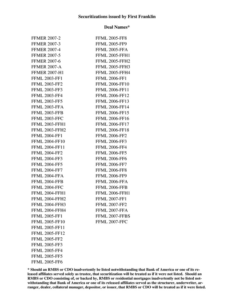 Securitizations issued by First Franklin Deal Names* * Should an RMBS or CDO inadvertently be listed notwithstanding that Bank of America or one of its re- leased affiliates served solely as trustee, that securitization will be treated as if it were not listed. Should an RMBS or CDO consisting of, or backed by, RMBS or residential mortgages inadvertently not be listed not- withstanding that Bank of America or one of its released affiliates served as the structurer, underwriter, ar- ranger, dealer, collateral manager, depositor, or issuer, that RMBS or CDO will be treated as if it were listed. FFMER 2007-2 FFMER 2007-3 FFMER 2007-4 FFMER 2007-5 FFMER 2007-6 FFMER 2007-A FFMER 2007-H1 FFML 2003-FF1 FFML 2003-FF2 FFML 2003-FF3 FFML 2003-FF4 FFML 2003-FF5 FFML 2003-FFA FFML 2003-FFB FFML 2003-FFC FFML 2003-FFH1 FFML 2003-FFH2 FFML 2004-FF1 FFML 2004-FF10 FFML 2004-FF11 FFML 2004-FF2 FFML 2004-FF3 FFML 2004-FF5 FFML 2004-FF7 FFML 2004-FFA FFML 2004-FFB FFML 2004-FFC FFML 2004-FFH1 FFML 2004-FFH2 FFML 2004-FFH3 FFML 2004-FFH4 FFML 2005-FF1 FFML 2005-FF10 FFML 2005-FF11 FFML 2005-FF12 FFML 2005-FF2 FFML 2005-FF3 FFML 2005-FF4 FFML 2005-FF5 FFML 2005-FF6 FFML 2005-FF8 FFML 2005-FF9 FFML 2005-FFA FFML 2005-FFH1 FFML 2005-FFH2 FFML 2005-FFH3 FFML 2005-FFH4 FFML 2006-FF1 FFML 2006-FF10 FFML 2006-FF11 FFML 2006-FF12 FFML 2006-FF13 FFML 2006-FF14 FFML 2006-FF15 FFML 2006-FF16 FFML 2006-FF17 FFML 2006-FF18 FFML 2006-FF2 FFML 2006-FF3 FFML 2006-FF4 FFML 2006-FF5 FFML 2006-FF6 FFML 2006-FF7 FFML 2006-FF8 FFML 2006-FF9 FFML 2006-FFA FFML 2006-FFB FFML 2006-FFH1 FFML 2007-FF1 FFML 2007-FF2 FFML 2007-FFA FFML 2007-FFBS FFML 2007-FFC
