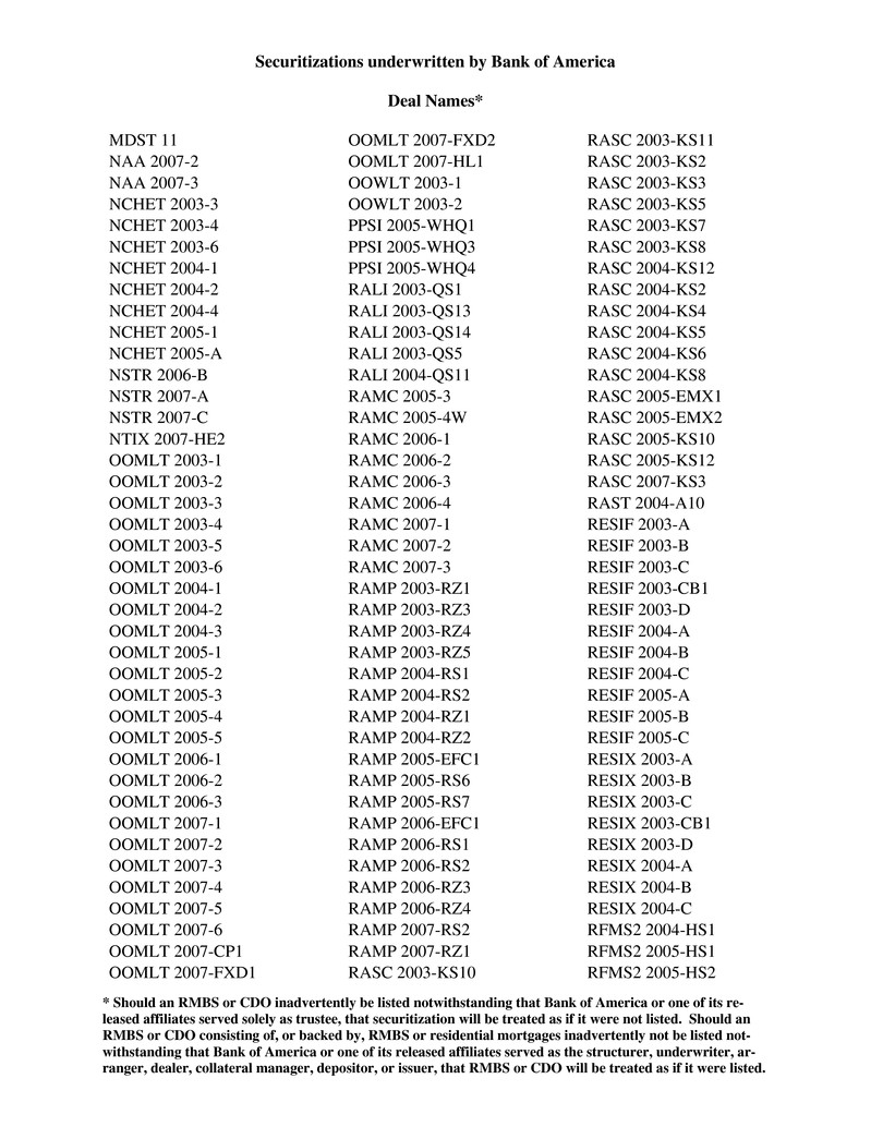 Securitizations underwritten by Bank of America Deal Names* * Should an RMBS or CDO inadvertently be listed notwithstanding that Bank of America or one of its re- leased affiliates served solely as trustee, that securitization will be treated as if it were not listed. Should an RMBS or CDO consisting of, or backed by, RMBS or residential mortgages inadvertently not be listed not- withstanding that Bank of America or one of its released affiliates served as the structurer, underwriter, ar- ranger, dealer, collateral manager, depositor, or issuer, that RMBS or CDO will be treated as if it were listed. MDST 11 NAA 2007-2 NAA 2007-3 NCHET 2003-3 NCHET 2003-4 NCHET 2003-6 NCHET 2004-1 NCHET 2004-2 NCHET 2004-4 NCHET 2005-1 NCHET 2005-A NSTR 2006-B NSTR 2007-A NSTR 2007-C NTIX 2007-HE2 OOMLT 2003-1 OOMLT 2003-2 OOMLT 2003-3 OOMLT 2003-4 OOMLT 2003-5 OOMLT 2003-6 OOMLT 2004-1 OOMLT 2004-2 OOMLT 2004-3 OOMLT 2005-1 OOMLT 2005-2 OOMLT 2005-3 OOMLT 2005-4 OOMLT 2005-5 OOMLT 2006-1 OOMLT 2006-2 OOMLT 2006-3 OOMLT 2007-1 OOMLT 2007-2 OOMLT 2007-3 OOMLT 2007-4 OOMLT 2007-5 OOMLT 2007-6 OOMLT 2007-CP1 OOMLT 2007-FXD1 OOMLT 2007-FXD2 OOMLT 2007-HL1 OOWLT 2003-1 OOWLT 2003-2 PPSI 2005-WHQ1 PPSI 2005-WHQ3 PPSI 2005-WHQ4 RALI 2003-QS1 RALI 2003-QS13 RALI 2003-QS14 RALI 2003-QS5 RALI 2004-QS11 RAMC 2005-3 RAMC 2005-4W RAMC 2006-1 RAMC 2006-2 RAMC 2006-3 RAMC 2006-4 RAMC 2007-1 RAMC 2007-2 RAMC 2007-3 RAMP 2003-RZ1 RAMP 2003-RZ3 RAMP 2003-RZ4 RAMP 2003-RZ5 RAMP 2004-RS1 RAMP 2004-RS2 RAMP 2004-RZ1 RAMP 2004-RZ2 RAMP 2005-EFC1 RAMP 2005-RS6 RAMP 2005-RS7 RAMP 2006-EFC1 RAMP 2006-RS1 RAMP 2006-RS2 RAMP 2006-RZ3 RAMP 2006-RZ4 RAMP 2007-RS2 RAMP 2007-RZ1 RASC 2003-KS10 RASC 2003-KS11 RASC 2003-KS2 RASC 2003-KS3 RASC 2003-KS5 RASC 2003-KS7 RASC 2003-KS8 RASC 2004-KS12 RASC 2004-KS2 RASC 2004-KS4 RASC 2004-KS5 RASC 2004-KS6 RASC 2004-KS8 RASC 2005-EMX1 RASC 2005-EMX2 RASC 2005-KS10 RASC 2005-KS12 RASC 2007-KS3 RAST 2004-A10 RESIF 2003-A RESIF 2003-B RESIF 2003-C RESIF 2003-CB1 RESIF 2003-D RESIF 2004-A RESIF 2004-B RESIF 2004-C RESIF 2005-A RESIF 2005-B RESIF 2005-C RESIX 2003-A RESIX 2003-B RESIX 2003-C RESIX 2003-CB1 RESIX 2003-D RESIX 2004-A RESIX 2004-B RESIX 2004-C RFMS2 2004-HS1 RFMS2 2005-HS1 RFMS2 2005-HS2