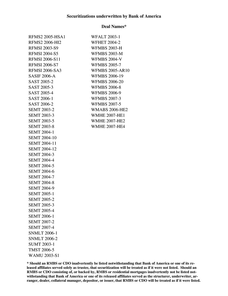 Securitizations underwritten by Bank of America Deal Names* * Should an RMBS or CDO inadvertently be listed notwithstanding that Bank of America or one of its re- leased affiliates served solely as trustee, that securitization will be treated as if it were not listed. Should an RMBS or CDO consisting of, or backed by, RMBS or residential mortgages inadvertently not be listed not- withstanding that Bank of America or one of its released affiliates served as the structurer, underwriter, ar- ranger, dealer, collateral manager, depositor, or issuer, that RMBS or CDO will be treated as if it were listed. RFMS2 2005-HSA1 RFMS2 2006-HI2 RFMSI 2003-S9 RFMSI 2004-S5 RFMSI 2006-S11 RFMSI 2006-S7 RFMSI 2006-SA3 SASIF 2006-A SAST 2005-2 SAST 2005-3 SAST 2005-4 SAST 2006-1 SAST 2006-2 SEMT 2003-2 SEMT 2003-3 SEMT 2003-5 SEMT 2003-8 SEMT 2004-1 SEMT 2004-10 SEMT 2004-11 SEMT 2004-12 SEMT 2004-3 SEMT 2004-4 SEMT 2004-5 SEMT 2004-6 SEMT 2004-7 SEMT 2004-8 SEMT 2004-9 SEMT 2005-1 SEMT 2005-2 SEMT 2005-3 SEMT 2005-4 SEMT 2006-1 SEMT 2007-2 SEMT 2007-4 SNMLT 2006-1 SNMLT 2006-2 SUMT 2003-1 TMST 2006-5 WAMU 2003-S1 WFALT 2003-1 WFHET 2004-2 WFMBS 2003-H WFMBS 2003-M WFMBS 2004-V WFMBS 2005-7 WFMBS 2005-AR10 WFMBS 2006-19 WFMBS 2006-20 WFMBS 2006-8 WFMBS 2006-9 WFMBS 2007-3 WFMBS 2007-5 WMABS 2006-HE2 WMHE 2007-HE1 WMHE 2007-HE2 WMHE 2007-HE4