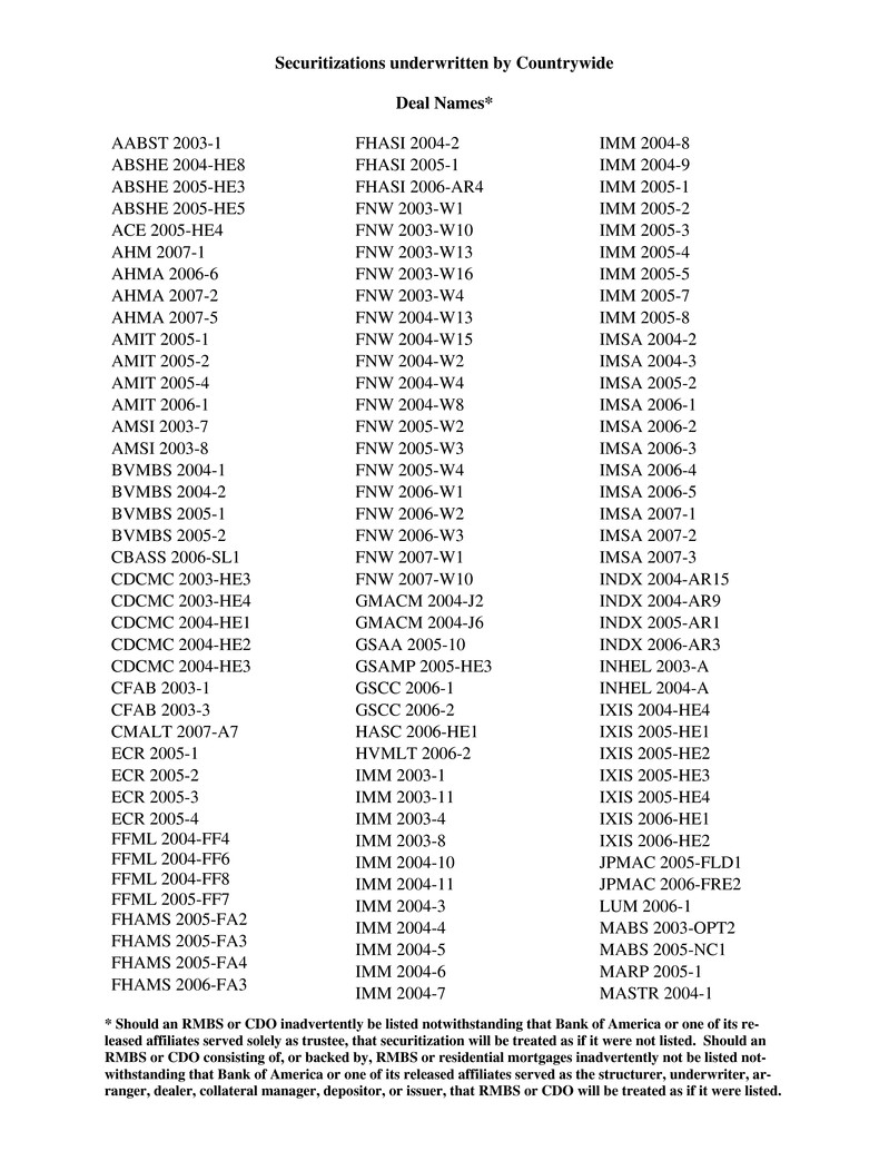 Securitizations underwritten by Countrywide Deal Names* * Should an RMBS or CDO inadvertently be listed notwithstanding that Bank of America or one of its re- leased affiliates served solely as trustee, that securitization will be treated as if it were not listed. Should an RMBS or CDO consisting of, or backed by, RMBS or residential mortgages inadvertently not be listed not- withstanding that Bank of America or one of its released affiliates served as the structurer, underwriter, ar- ranger, dealer, collateral manager, depositor, or issuer, that RMBS or CDO will be treated as if it were listed. AABST 2003-1 ABSHE 2004-HE8 ABSHE 2005-HE3 ABSHE 2005-HE5 ACE 2005-HE4 AHM 2007-1 AHMA 2006-6 AHMA 2007-2 AHMA 2007-5 AMIT 2005-1 AMIT 2005-2 AMIT 2005-4 AMIT 2006-1 AMSI 2003-7 AMSI 2003-8 BVMBS 2004-1 BVMBS 2004-2 BVMBS 2005-1 BVMBS 2005-2 CBASS 2006-SL1 CDCMC 2003-HE3 CDCMC 2003-HE4 CDCMC 2004-HE1 CDCMC 2004-HE2 CDCMC 2004-HE3 CFAB 2003-1 CFAB 2003-3 CMALT 2007-A7 ECR 2005-1 ECR 2005-2 ECR 2005-3 ECR 2005-4 FFML 2004-FF4 FFML 2004-FF6 FFML 2004-FF8 FFML 2005-FF7 FHAMS 2005-FA2 FHAMS 2005-FA3 FHAMS 2005-FA4 FHAMS 2006-FA3 FHASI 2004-2 FHASI 2005-1 FHASI 2006-AR4 FNW 2003-W1 FNW 2003-W10 FNW 2003-W13 FNW 2003-W16 FNW 2003-W4 FNW 2004-W13 FNW 2004-W15 FNW 2004-W2 FNW 2004-W4 FNW 2004-W8 FNW 2005-W2 FNW 2005-W3 FNW 2005-W4 FNW 2006-W1 FNW 2006-W2 FNW 2006-W3 FNW 2007-W1 FNW 2007-W10 GMACM 2004-J2 GMACM 2004-J6 GSAA 2005-10 GSAMP 2005-HE3 GSCC 2006-1 GSCC 2006-2 HASC 2006-HE1 HVMLT 2006-2 IMM 2003-1 IMM 2003-11 IMM 2003-4 IMM 2003-8 IMM 2004-10 IMM 2004-11 IMM 2004-3 IMM 2004-4 IMM 2004-5 IMM 2004-6 IMM 2004-7 IMM 2004-8 IMM 2004-9 IMM 2005-1 IMM 2005-2 IMM 2005-3 IMM 2005-4 IMM 2005-5 IMM 2005-7 IMM 2005-8 IMSA 2004-2 IMSA 2004-3 IMSA 2005-2 IMSA 2006-1 IMSA 2006-2 IMSA 2006-3 IMSA 2006-4 IMSA 2006-5 IMSA 2007-1 IMSA 2007-2 IMSA 2007-3 INDX 2004-AR15 INDX 2004-AR9 INDX 2005-AR1 INDX 2006-AR3 INHEL 2003-A INHEL 2004-A IXIS 2004-HE4 IXIS 2005-HE1 IXIS 2005-HE2 IXIS 2005-HE3 IXIS 2005-HE4 IXIS 2006-HE1 IXIS 2006-HE2 JPMAC 2005-FLD1 JPMAC 2006-FRE2 LUM 2006-1 MABS 2003-OPT2 MABS 2005-NC1 MARP 2005-1 MASTR 2004-1