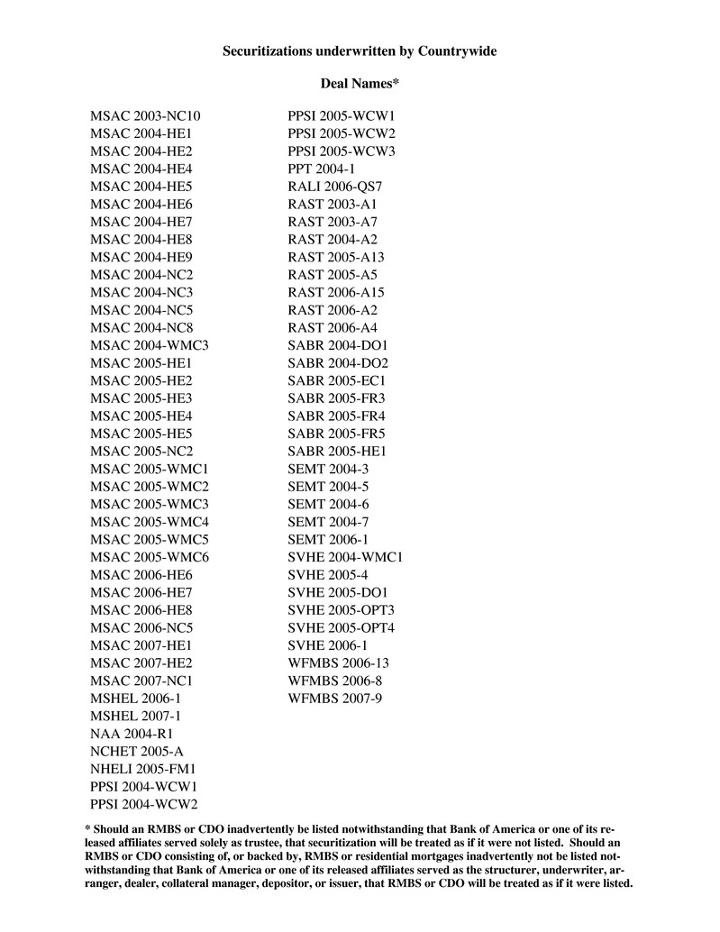 Securitizations underwritten by Countrywide Deal Names* * Should an RMBS or CDO inadvertently be listed notwithstanding that Bank of America or one of its re- leased affiliates served solely as trustee, that securitization will be treated as if it were not listed. Should an RMBS or CDO consisting of, or backed by, RMBS or residential mortgages inadvertently not be listed not- withstanding that Bank of America or one of its released affiliates served as the structurer, underwriter, ar- ranger, dealer, collateral manager, depositor, or issuer, that RMBS or CDO will be treated as if it were listed. MSAC 2003-NC10 MSAC 2004-HE1 MSAC 2004-HE2 MSAC 2004-HE4 MSAC 2004-HE5 MSAC 2004-HE6 MSAC 2004-HE7 MSAC 2004-HE8 MSAC 2004-HE9 MSAC 2004-NC2 MSAC 2004-NC3 MSAC 2004-NC5 MSAC 2004-NC8 MSAC 2004-WMC3 MSAC 2005-HE1 MSAC 2005-HE2 MSAC 2005-HE3 MSAC 2005-HE4 MSAC 2005-HE5 MSAC 2005-NC2 MSAC 2005-WMC1 MSAC 2005-WMC2 MSAC 2005-WMC3 MSAC 2005-WMC4 MSAC 2005-WMC5 MSAC 2005-WMC6 MSAC 2006-HE6 MSAC 2006-HE7 MSAC 2006-HE8 MSAC 2006-NC5 MSAC 2007-HE1 MSAC 2007-HE2 MSAC 2007-NC1 MSHEL 2006-1 MSHEL 2007-1 NAA 2004-R1 NCHET 2005-A NHELI 2005-FM1 PPSI 2004-WCW1 PPSI 2004-WCW2 PPSI 2005-WCW1 PPSI 2005-WCW2 PPSI 2005-WCW3 PPT 2004-1 RALI 2006-QS7 RAST 2003-A1 RAST 2003-A7 RAST 2004-A2 RAST 2005-A13 RAST 2005-A5 RAST 2006-A15 RAST 2006-A2 RAST 2006-A4 SABR 2004-DO1 SABR 2004-DO2 SABR 2005-EC1 SABR 2005-FR3 SABR 2005-FR4 SABR 2005-FR5 SABR 2005-HE1 SEMT 2004-3 SEMT 2004-5 SEMT 2004-6 SEMT 2004-7 SEMT 2006-1 SVHE 2004-WMC1 SVHE 2005-4 SVHE 2005-DO1 SVHE 2005-OPT3 SVHE 2005-OPT4 SVHE 2006-1 WFMBS 2006-13 WFMBS 2006-8 WFMBS 2007-9