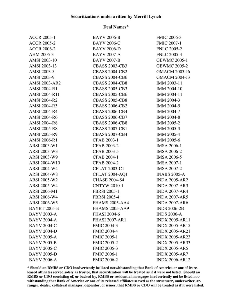 Securitizations underwritten by Merrill Lynch Deal Names* * Should an RMBS or CDO inadvertently be listed notwithstanding that Bank of America or one of its re- leased affiliates served solely as trustee, that securitization will be treated as if it were not listed. Should an RMBS or CDO consisting of, or backed by, RMBS or residential mortgages inadvertently not be listed not- withstanding that Bank of America or one of its released affiliates served as the structurer, underwriter, ar- ranger, dealer, collateral manager, depositor, or issuer, that RMBS or CDO will be treated as if it were listed. ACCR 2005-1 ACCR 2005-2 ACCR 2006-2 AHM 2005-3 AMSI 2003-10 AMSI 2003-13 AMSI 2003-5 AMSI 2003-9 AMSI 2003-AR2 AMSI 2004-R1 AMSI 2004-R11 AMSI 2004-R2 AMSI 2004-R3 AMSI 2004-R4 AMSI 2004-R6 AMSI 2004-R8 AMSI 2005-R8 AMSI 2005-R9 AMSI 2006-R1 ARSI 2003-W1 ARSI 2003-W3 ARSI 2003-W9 ARSI 2004-W10 ARSI 2004-W4 ARSI 2004-W8 ARSI 2005-W2 ARSI 2005-W4 ARSI 2006-M1 ARSI 2006-W4 ARSI 2006-W5 BAYRT 2005-E BAYV 2003-A BAYV 2004-A BAYV 2004-C BAYV 2004-D BAYV 2005-A BAYV 2005-B BAYV 2005-C BAYV 2005-D BAYV 2006-A BAYV 2006-B BAYV 2006-C BAYV 2006-D BAYV 2007-A BAYV 2007-B CBASS 2003-CB3 CBASS 2004-CB2 CBASS 2004-CB6 CBASS 2004-CB8 CBASS 2005-CB3 CBASS 2005-CB6 CBASS 2005-CB8 CBASS 2006-CB2 CBASS 2006-CB4 CBASS 2006-CB7 CBASS 2006-CB8 CBASS 2007-CB1 CBASS 2007-CB4 CFAB 2003-1 CFAB 2003-2 CFAB 2003-5 CFAB 2004-1 CFAB 2004-2 CFLAT 2003-C1 CFLAT 2004-AQ1 CHASE 2004-S4 CNTYW 2010-1 FBRSI 2005-1 FBRSI 2005-4 FHAMS 2005-AA4 FHAMS 2005-AA9 FHASI 2004-6 FHASI 2007-AR1 FMIC 2004-3 FMIC 2004-4 FMIC 2005-1 FMIC 2005-2 FMIC 2005-3 FMIC 2006-1 FMIC 2006-2 FMIC 2006-3 FMIC 2007-1 FNLC 2005-2 FNLC 2005-4 GEWMC 2005-1 GEWMC 2005-2 GMACM 2003-J6 GMACM 2004-J3 IMM 2003-11 IMM 2004-10 IMM 2004-11 IMM 2004-3 IMM 2004-5 IMM 2004-7 IMM 2004-8 IMM 2005-2 IMM 2005-3 IMM 2005-4 IMM 2005-6 IMSA 2006-1 IMSA 2006-2 IMSA 2006-5 IMSA 2007-1 IMSA 2007-2 INABS 2005-A INDA 2005-AR2 INDA 2007-AR3 INDA 2007-AR4 INDA 2007-AR5 INDA 2007-AR6 INDS 2006-2B INDS 2006-A INDX 2005-AR11 INDX 2005-AR15 INDX 2005-AR21 INDX 2005-AR23 INDX 2005-AR33 INDX 2005-AR5 INDX 2005-AR7 INDX 2006-AR12