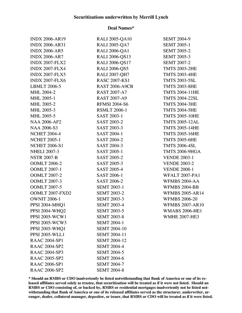 Securitizations underwritten by Merrill Lynch Deal Names* * Should an RMBS or CDO inadvertently be listed notwithstanding that Bank of America or one of its re- leased affiliates served solely as trustee, that securitization will be treated as if it were not listed. Should an RMBS or CDO consisting of, or backed by, RMBS or residential mortgages inadvertently not be listed not- withstanding that Bank of America or one of its released affiliates served as the structurer, underwriter, ar- ranger, dealer, collateral manager, depositor, or issuer, that RMBS or CDO will be treated as if it were listed. INDX 2006-AR19 INDX 2006-AR31 INDX 2006-AR5 INDX 2006-AR7 INDX 2007-FLX2 INDX 2007-FLX4 INDX 2007-FLX5 INDX 2007-FLX6 LBMLT 2006-5 MHL 2004-2 MHL 2005-1 MHL 2005-2 MHL 2005-3 MHL 2005-5 NAA 2006-AF2 NAA 2006-S3 NCHET 2004-4 NCHET 2005-1 NCHET 2006-S1 NHELI 2007-3 NSTR 2007-B OOMLT 2006-2 OOMLT 2007-1 OOMLT 2007-2 OOMLT 2007-3 OOMLT 2007-5 OOMLT 2007-FXD2 OWNIT 2006-1 PPSI 2004-MHQ1 PPSI 2004-WHQ2 PPSI 2005-WCW1 PPSI 2005-WCW3 PPSI 2005-WHQ1 PPSI 2005-WLL1 RAAC 2004-SP1 RAAC 2004-SP2 RAAC 2004-SP3 RAAC 2005-SP2 RAAC 2006-SP1 RAAC 2006-SP2 RALI 2005-QA10 RALI 2005-QA7 RALI 2006-QA1 RALI 2006-QS13 RALI 2006-QS17 RALI 2006-QS5 RALI 2007-QH7 RASC 2007-KS1 RAST 2006-A9CB RAST 2007-A7 RAST 2007-A9 RFMSI 2004-S6 RSMLT 2006-1 SAST 2003-1 SAST 2003-2 SAST 2003-3 SAST 2004-1 SAST 2004-2 SAST 2004-3 SAST 2005-1 SAST 2005-2 SAST 2005-3 SAST 2005-4 SAST 2006-1 SAST 2006-2 SEMT 2003-1 SEMT 2003-2 SEMT 2003-3 SEMT 2003-4 SEMT 2003-5 SEMT 2003-8 SEMT 2004-1 SEMT 2004-10 SEMT 2004-11 SEMT 2004-12 SEMT 2004-4 SEMT 2004-5 SEMT 2004-6 SEMT 2004-7 SEMT 2004-8 SEMT 2004-9 SEMT 2005-1 SEMT 2005-2 SEMT 2005-3 SEMT 2007-2 TMTS 2003-2HE TMTS 2003-4HE TMTS 2003-5SL TMTS 2003-8HE TMTS 2004-11HE TMTS 2004-22SL TMTS 2004-3HE TMTS 2004-5HE TMTS 2005-10HE TMTS 2005-12AL TMTS 2005-14HE TMTS 2005-16HE TMTS 2005-6HE TMTS 2006-4SL TMTS 2006-9HGA VENDE 2003-1 VENDE 2003-2 VENDE 2008-1 WFALT 2007-PA1 WFMBS 2004-AA WFMBS 2004-BB WFMBS 2005-AR14 WFMBS 2006-20 WFMBS 2007-AR10 WMABS 2006-HE1 WMHE 2007-HE3