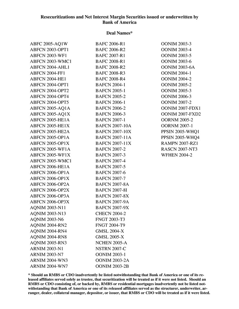 Resecuritizations and Net Interest Margin Securities issued or underwritten by Bank of America Deal Names* * Should an RMBS or CDO inadvertently be listed notwithstanding that Bank of America or one of its re- leased affiliates served solely as trustee, that securitization will be treated as if it were not listed. Should an RMBS or CDO consisting of, or backed by, RMBS or residential mortgages inadvertently not be listed not- withstanding that Bank of America or one of its released affiliates served as the structurer, underwriter, ar- ranger, dealer, collateral manager, depositor, or issuer, that RMBS or CDO will be treated as if it were listed. ABFC 2005-AQ1W ABFCN 2003-OPT1 ABFCN 2003-WF1 ABFCN 2003-WMC1 ABFCN 2004-AHL1 ABFCN 2004-FF1 ABFCN 2004-HE1 ABFCN 2004-OPT1 ABFCN 2004-OPT2 ABFCN 2004-OPT4 ABFCN 2004-OPT5 ABFCN 2005-AQ1A ABFCN 2005-AQ1X ABFCN 2005-HE1A ABFCN 2005-HE1X ABFCN 2005-HE2A ABFCN 2005-OP1A ABFCN 2005-OP1X ABFCN 2005-WF1A ABFCN 2005-WF1X ABFCN 2005-WMC1 ABFCN 2006-HE1A ABFCN 2006-OP1A ABFCN 2006-OP1X ABFCN 2006-OP2A ABFCN 2006-OP2X ABFCN 2006-OP3A ABFCN 2006-OP3X AQNIM 2003-N11 AQNIM 2003-N13 AQNIM 2003-N6 AQNIM 2004-RN2 AQNIM 2004-RN4 AQNIM 2004-RN8 AQNIM 2005-RN3 ARNIM 2003-N1 ARNIM 2003-N7 ARNIM 2004-WN3 ARNIM 2004-WN7 BAFC 2006-R1 BAFC 2006-R2 BAFC 2007-R1 BAFC 2008-R1 BAFC 2008-R2 BAFC 2008-R3 BAFC 2008-R4 BAFCN 2004-1 BAFCN 2005-1 BAFCN 2005-2 BAFCN 2006-1 BAFCN 2006-2 BAFCN 2006-3 BAFCN 2007-1 BAFCN 2007-10A BAFCN 2007-10X BAFCN 2007-11A BAFCN 2007-11X BAFCN 2007-2 BAFCN 2007-3 BAFCN 2007-4 BAFCN 2007-5 BAFCN 2007-6 BAFCN 2007-7 BAFCN 2007-8A BAFCN 2007-8I BAFCN 2007-8X BAFCN 2007-9A BAFCN 2007-9X CHECN 2004-2 FNGT 2003-T3 FNGT 2004-T9 GMSL 2004-X GMSL 2005-X NCHEN 2005-A NSTRN 2007-C OONIM 2003-1 OONIM 2003-2A OONIM 2003-2B OONIM 2003-3 OONIM 2003-4 OONIM 2003-5 OONIM 2003-6 OONIM 2003-6A OONIM 2004-1 OONIM 2004-2 OONIM 2005-2 OONIM 2005-3 OONIM 2006-3 OONIM 2007-2 OONIM 2007-FDX1 OONIM 2007-FXD2 OORNM 2005-2 OORNM 2007-1 PPSIN 2005-WHQ1 PPSIN 2005-WHQ4 RAMPN 2007-RZ1 RASCN 2007-NT3 WFHEN 2004-2