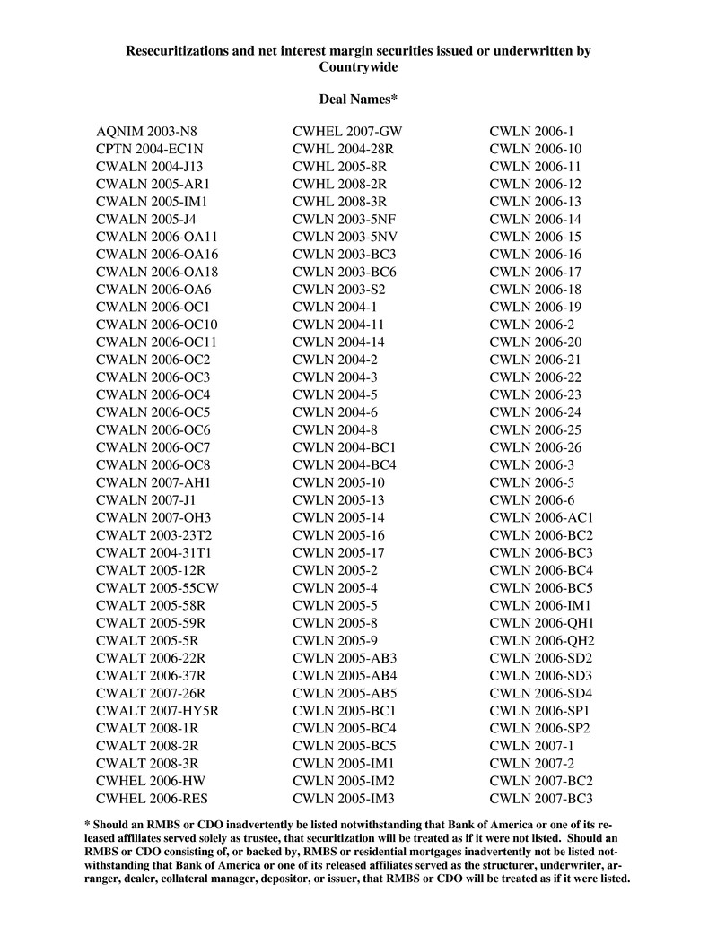 Resecuritizations and net interest margin securities issued or underwritten by Countrywide Deal Names* * Should an RMBS or CDO inadvertently be listed notwithstanding that Bank of America or one of its re- leased affiliates served solely as trustee, that securitization will be treated as if it were not listed. Should an RMBS or CDO consisting of, or backed by, RMBS or residential mortgages inadvertently not be listed not- withstanding that Bank of America or one of its released affiliates served as the structurer, underwriter, ar- ranger, dealer, collateral manager, depositor, or issuer, that RMBS or CDO will be treated as if it were listed. AQNIM 2003-N8 CPTN 2004-EC1N CWALN 2004-J13 CWALN 2005-AR1 CWALN 2005-IM1 CWALN 2005-J4 CWALN 2006-OA11 CWALN 2006-OA16 CWALN 2006-OA18 CWALN 2006-OA6 CWALN 2006-OC1 CWALN 2006-OC10 CWALN 2006-OC11 CWALN 2006-OC2 CWALN 2006-OC3 CWALN 2006-OC4 CWALN 2006-OC5 CWALN 2006-OC6 CWALN 2006-OC7 CWALN 2006-OC8 CWALN 2007-AH1 CWALN 2007-J1 CWALN 2007-OH3 CWALT 2003-23T2 CWALT 2004-31T1 CWALT 2005-12R CWALT 2005-55CW CWALT 2005-58R CWALT 2005-59R CWALT 2005-5R CWALT 2006-22R CWALT 2006-37R CWALT 2007-26R CWALT 2007-HY5R CWALT 2008-1R CWALT 2008-2R CWALT 2008-3R CWHEL 2006-HW CWHEL 2006-RES CWHEL 2007-GW CWHL 2004-28R CWHL 2005-8R CWHL 2008-2R CWHL 2008-3R CWLN 2003-5NF CWLN 2003-5NV CWLN 2003-BC3 CWLN 2003-BC6 CWLN 2003-S2 CWLN 2004-1 CWLN 2004-11 CWLN 2004-14 CWLN 2004-2 CWLN 2004-3 CWLN 2004-5 CWLN 2004-6 CWLN 2004-8 CWLN 2004-BC1 CWLN 2004-BC4 CWLN 2005-10 CWLN 2005-13 CWLN 2005-14 CWLN 2005-16 CWLN 2005-17 CWLN 2005-2 CWLN 2005-4 CWLN 2005-5 CWLN 2005-8 CWLN 2005-9 CWLN 2005-AB3 CWLN 2005-AB4 CWLN 2005-AB5 CWLN 2005-BC1 CWLN 2005-BC4 CWLN 2005-BC5 CWLN 2005-IM1 CWLN 2005-IM2 CWLN 2005-IM3 CWLN 2006-1 CWLN 2006-10 CWLN 2006-11 CWLN 2006-12 CWLN 2006-13 CWLN 2006-14 CWLN 2006-15 CWLN 2006-16 CWLN 2006-17 CWLN 2006-18 CWLN 2006-19 CWLN 2006-2 CWLN 2006-20 CWLN 2006-21 CWLN 2006-22 CWLN 2006-23 CWLN 2006-24 CWLN 2006-25 CWLN 2006-26 CWLN 2006-3 CWLN 2006-5 CWLN 2006-6 CWLN 2006-AC1 CWLN 2006-BC2 CWLN 2006-BC3 CWLN 2006-BC4 CWLN 2006-BC5 CWLN 2006-IM1 CWLN 2006-QH1 CWLN 2006-QH2 CWLN 2006-SD2 CWLN 2006-SD3 CWLN 2006-SD4 CWLN 2006-SP1 CWLN 2006-SP2 CWLN 2007-1 CWLN 2007-2 CWLN 2007-BC2 CWLN 2007-BC3