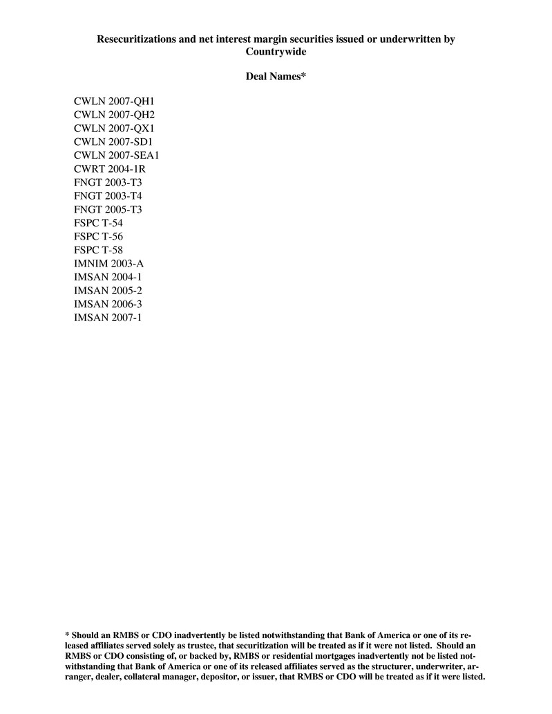 Resecuritizations and net interest margin securities issued or underwritten by Countrywide Deal Names* * Should an RMBS or CDO inadvertently be listed notwithstanding that Bank of America or one of its re- leased affiliates served solely as trustee, that securitization will be treated as if it were not listed. Should an RMBS or CDO consisting of, or backed by, RMBS or residential mortgages inadvertently not be listed not- withstanding that Bank of America or one of its released affiliates served as the structurer, underwriter, ar- ranger, dealer, collateral manager, depositor, or issuer, that RMBS or CDO will be treated as if it were listed. CWLN 2007-QH1 CWLN 2007-QH2 CWLN 2007-QX1 CWLN 2007-SD1 CWLN 2007-SEA1 CWRT 2004-1R FNGT 2003-T3 FNGT 2003-T4 FNGT 2005-T3 FSPC T-54 FSPC T-56 FSPC T-58 IMNIM 2003-A IMSAN 2004-1 IMSAN 2005-2 IMSAN 2006-3 IMSAN 2007-1