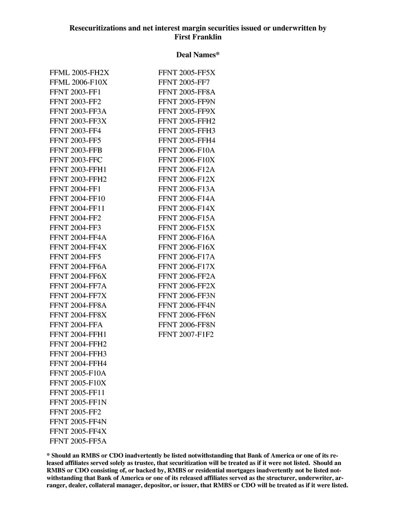 Resecuritizations and net interest margin securities issued or underwritten by First Franklin Deal Names* * Should an RMBS or CDO inadvertently be listed notwithstanding that Bank of America or one of its re- leased affiliates served solely as trustee, that securitization will be treated as if it were not listed. Should an RMBS or CDO consisting of, or backed by, RMBS or residential mortgages inadvertently not be listed not- withstanding that Bank of America or one of its released affiliates served as the structurer, underwriter, ar- ranger, dealer, collateral manager, depositor, or issuer, that RMBS or CDO will be treated as if it were listed. FFML 2005-FH2X FFML 2006-F10X FFNT 2003-FF1 FFNT 2003-FF2 FFNT 2003-FF3A FFNT 2003-FF3X FFNT 2003-FF4 FFNT 2003-FF5 FFNT 2003-FFB FFNT 2003-FFC FFNT 2003-FFH1 FFNT 2003-FFH2 FFNT 2004-FF1 FFNT 2004-FF10 FFNT 2004-FF11 FFNT 2004-FF2 FFNT 2004-FF3 FFNT 2004-FF4A FFNT 2004-FF4X FFNT 2004-FF5 FFNT 2004-FF6A FFNT 2004-FF6X FFNT 2004-FF7A FFNT 2004-FF7X FFNT 2004-FF8A FFNT 2004-FF8X FFNT 2004-FFA FFNT 2004-FFH1 FFNT 2004-FFH2 FFNT 2004-FFH3 FFNT 2004-FFH4 FFNT 2005-F10A FFNT 2005-F10X FFNT 2005-FF11 FFNT 2005-FF1N FFNT 2005-FF2 FFNT 2005-FF4N FFNT 2005-FF4X FFNT 2005-FF5A FFNT 2005-FF5X FFNT 2005-FF7 FFNT 2005-FF8A FFNT 2005-FF9N FFNT 2005-FF9X FFNT 2005-FFH2 FFNT 2005-FFH3 FFNT 2005-FFH4 FFNT 2006-F10A FFNT 2006-F10X FFNT 2006-F12A FFNT 2006-F12X FFNT 2006-F13A FFNT 2006-F14A FFNT 2006-F14X FFNT 2006-F15A FFNT 2006-F15X FFNT 2006-F16A FFNT 2006-F16X FFNT 2006-F17A FFNT 2006-F17X FFNT 2006-FF2A FFNT 2006-FF2X FFNT 2006-FF3N FFNT 2006-FF4N FFNT 2006-FF6N FFNT 2006-FF8N FFNT 2007-F1F2