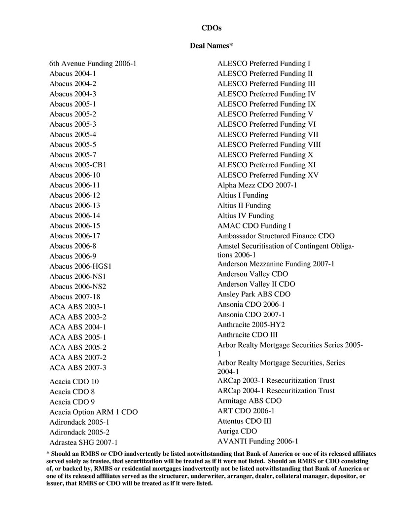 CDOs Deal Names* * Should an RMBS or CDO inadvertently be listed notwithstanding that Bank of America or one of its released affiliates served solely as trustee, that securitization will be treated as if it were not listed. Should an RMBS or CDO consisting of, or backed by, RMBS or residential mortgages inadvertently not be listed notwithstanding that Bank of America or one of its released affiliates served as the structurer, underwriter, arranger, dealer, collateral manager, depositor, or issuer, that RMBS or CDO will be treated as if it were listed. 6th Avenue Funding 2006-1 Abacus 2004-1 Abacus 2004-2 Abacus 2004-3 Abacus 2005-1 Abacus 2005-2 Abacus 2005-3 Abacus 2005-4 Abacus 2005-5 Abacus 2005-7 Abacus 2005-CB1 Abacus 2006-10 Abacus 2006-11 Abacus 2006-12 Abacus 2006-13 Abacus 2006-14 Abacus 2006-15 Abacus 2006-17 Abacus 2006-8 Abacus 2006-9 Abacus 2006-HGS1 Abacus 2006-NS1 Abacus 2006-NS2 Abacus 2007-18 ACA ABS 2003-1 ACA ABS 2003-2 ACA ABS 2004-1 ACA ABS 2005-1 ACA ABS 2005-2 ACA ABS 2007-2 ACA ABS 2007-3 Acacia CDO 10 Acacia CDO 8 Acacia CDO 9 Acacia Option ARM 1 CDO Adirondack 2005-1 Adirondack 2005-2 Adrastea SHG 2007-1 ALESCO Preferred Funding I ALESCO Preferred Funding II ALESCO Preferred Funding III ALESCO Preferred Funding IV ALESCO Preferred Funding IX ALESCO Preferred Funding V ALESCO Preferred Funding VI ALESCO Preferred Funding VII ALESCO Preferred Funding VIII ALESCO Preferred Funding X ALESCO Preferred Funding XI ALESCO Preferred Funding XV Alpha Mezz CDO 2007-1 Altius I Funding Altius II Funding Altius IV Funding AMAC CDO Funding I Ambassador Structured Finance CDO Amstel Securitisation of Contingent Obliga- tions 2006-1 Anderson Mezzanine Funding 2007-1 Anderson Valley CDO Anderson Valley II CDO Ansley Park ABS CDO Ansonia CDO 2006-1 Ansonia CDO 2007-1 Anthracite 2005-HY2 Anthracite CDO III Arbor Realty Mortgage Securities Series 2005- 1 Arbor Realty Mortgage Securities, Series 2004-1 ARCap 2003-1 Resecuritization Trust ARCap 2004-1 Resecuritization Trust Armitage ABS CDO ART CDO 2006-1 Attentus CDO III Auriga CDO AVANTI Funding 2006-1