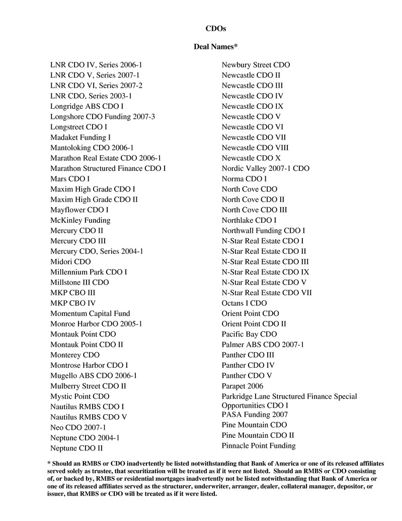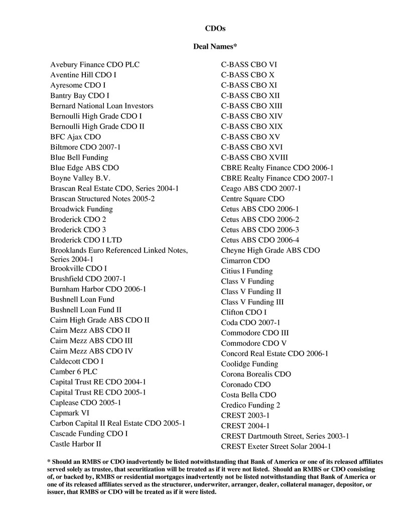 CDOs Deal Names* * Should an RMBS or CDO inadvertently be listed notwithstanding that Bank of America or one of its released affiliates served solely as trustee, that securitization will be treated as if it were not listed. Should an RMBS or CDO consisting of, or backed by, RMBS or residential mortgages inadvertently not be listed notwithstanding that Bank of America or one of its released affiliates served as the structurer, underwriter, arranger, dealer, collateral manager, depositor, or issuer, that RMBS or CDO will be treated as if it were listed. Avebury Finance CDO PLC Aventine Hill CDO I Ayresome CDO I Bantry Bay CDO I Bernard National Loan Investors Bernoulli High Grade CDO I Bernoulli High Grade CDO II BFC Ajax CDO Biltmore CDO 2007-1 Blue Bell Funding Blue Edge ABS CDO Boyne Valley B.V. Brascan Real Estate CDO, Series 2004-1 Brascan Structured Notes 2005-2 Broadwick Funding Broderick CDO 2 Broderick CDO 3 Broderick CDO I LTD Brooklands Euro Referenced Linked Notes, Series 2004-1 Brookville CDO I Brushfield CDO 2007-1 Burnham Harbor CDO 2006-1 Bushnell Loan Fund Bushnell Loan Fund II Cairn High Grade ABS CDO II Cairn Mezz ABS CDO II Cairn Mezz ABS CDO III Cairn Mezz ABS CDO IV Caldecott CDO I Camber 6 PLC Capital Trust RE CDO 2004-1 Capital Trust RE CDO 2005-1 Caplease CDO 2005-1 Capmark VI Carbon Capital II Real Estate CDO 2005-1 Cascade Funding CDO I Castle Harbor II C-BASS CBO VI C-BASS CBO X C-BASS CBO XI C-BASS CBO XII C-BASS CBO XIII C-BASS CBO XIV C-BASS CBO XIX C-BASS CBO XV C-BASS CBO XVI C-BASS CBO XVIII CBRE Realty Finance CDO 2006-1 CBRE Realty Finance CDO 2007-1 Ceago ABS CDO 2007-1 Centre Square CDO Cetus ABS CDO 2006-1 Cetus ABS CDO 2006-2 Cetus ABS CDO 2006-3 Cetus ABS CDO 2006-4 Cheyne High Grade ABS CDO Cimarron CDO Citius I Funding Class V Funding Class V Funding II Class V Funding III Clifton CDO I Coda CDO 2007-1 Commodore CDO III Commodore CDO V Concord Real Estate CDO 2006-1 Coolidge Funding Corona Borealis CDO Coronado CDO Costa Bella CDO Credico Funding 2 CREST 2003-1 CREST 2004-1 CREST Dartmouth Street, Series 2003-1 CREST Exeter Street Solar 2004-1