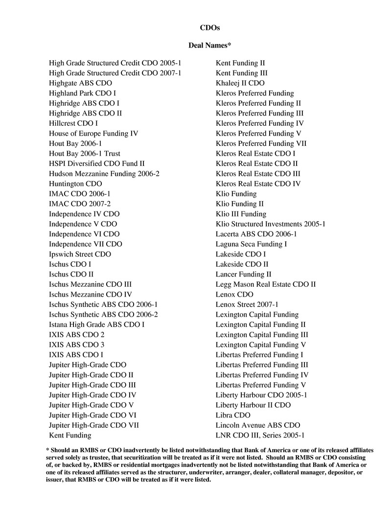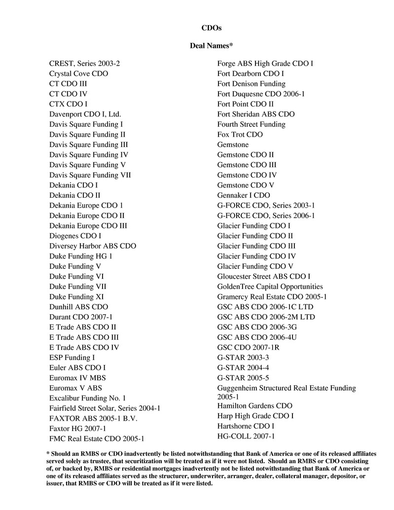 CDOs Deal Names* * Should an RMBS or CDO inadvertently be listed notwithstanding that Bank of America or one of its released affiliates served solely as trustee, that securitization will be treated as if it were not listed. Should an RMBS or CDO consisting of, or backed by, RMBS or residential mortgages inadvertently not be listed notwithstanding that Bank of America or one of its released affiliates served as the structurer, underwriter, arranger, dealer, collateral manager, depositor, or issuer, that RMBS or CDO will be treated as if it were listed. CREST, Series 2003-2 Crystal Cove CDO CT CDO III CT CDO IV CTX CDO I Davenport CDO I, Ltd. Davis Square Funding I Davis Square Funding II Davis Square Funding III Davis Square Funding IV Davis Square Funding V Davis Square Funding VII Dekania CDO I Dekania CDO II Dekania Europe CDO 1 Dekania Europe CDO II Dekania Europe CDO III Diogenes CDO I Diversey Harbor ABS CDO Duke Funding HG 1 Duke Funding V Duke Funding VI Duke Funding VII Duke Funding XI Dunhill ABS CDO Durant CDO 2007-1 E Trade ABS CDO II E Trade ABS CDO III E Trade ABS CDO IV ESP Funding I Euler ABS CDO I Euromax IV MBS Euromax V ABS Excalibur Funding No. 1 Fairfield Street Solar, Series 2004-1 FAXTOR ABS 2005-1 B.V. Faxtor HG 2007-1 FMC Real Estate CDO 2005-1 Forge ABS High Grade CDO I Fort Dearborn CDO I Fort Denison Funding Fort Duquesne CDO 2006-1 Fort Point CDO II Fort Sheridan ABS CDO Fourth Street Funding Fox Trot CDO Gemstone Gemstone CDO II Gemstone CDO III Gemstone CDO IV Gemstone CDO V Gennaker I CDO G-FORCE CDO, Series 2003-1 G-FORCE CDO, Series 2006-1 Glacier Funding CDO I Glacier Funding CDO II Glacier Funding CDO III Glacier Funding CDO IV Glacier Funding CDO V Gloucester Street ABS CDO I GoldenTree Capital Opportunities Gramercy Real Estate CDO 2005-1 GSC ABS CDO 2006-1C LTD GSC ABS CDO 2006-2M LTD GSC ABS CDO 2006-3G GSC ABS CDO 2006-4U GSC CDO 2007-1R G-STAR 2003-3 G-STAR 2004-4 G-STAR 2005-5 Guggenheim Structured Real Estate Funding 2005-1 Hamilton Gardens CDO Harp High Grade CDO I Hartshorne CDO I HG-COLL 2007-1