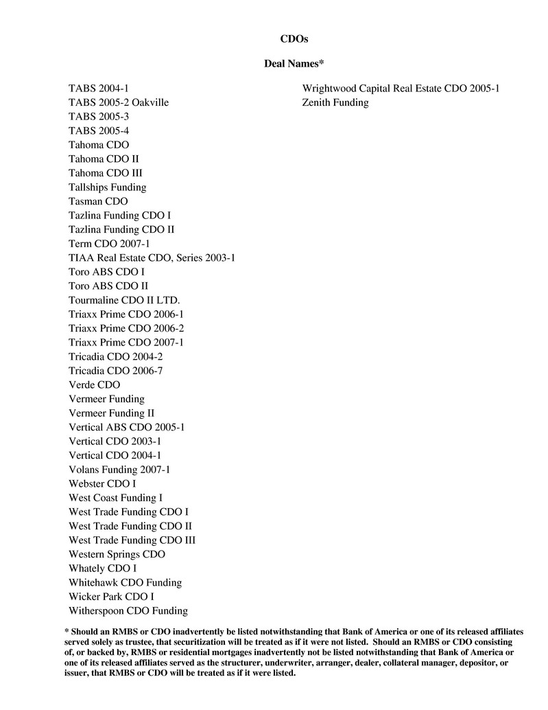 CDOs Deal Names* * Should an RMBS or CDO inadvertently be listed notwithstanding that Bank of America or one of its released affiliates served solely as trustee, that securitization will be treated as if it were not listed. Should an RMBS or CDO consisting of, or backed by, RMBS or residential mortgages inadvertently not be listed notwithstanding that Bank of America or one of its released affiliates served as the structurer, underwriter, arranger, dealer, collateral manager, depositor, or issuer, that RMBS or CDO will be treated as if it were listed. TABS 2004-1 TABS 2005-2 Oakville TABS 2005-3 TABS 2005-4 Tahoma CDO Tahoma CDO II Tahoma CDO III Tallships Funding Tasman CDO Tazlina Funding CDO I Tazlina Funding CDO II Term CDO 2007-1 TIAA Real Estate CDO, Series 2003-1 Toro ABS CDO I Toro ABS CDO II Tourmaline CDO II LTD. Triaxx Prime CDO 2006-1 Triaxx Prime CDO 2006-2 Triaxx Prime CDO 2007-1 Tricadia CDO 2004-2 Tricadia CDO 2006-7 Verde CDO Vermeer Funding Vermeer Funding II Vertical ABS CDO 2005-1 Vertical CDO 2003-1 Vertical CDO 2004-1 Volans Funding 2007-1 Webster CDO I West Coast Funding I West Trade Funding CDO I West Trade Funding CDO II West Trade Funding CDO III Western Springs CDO Whately CDO I Whitehawk CDO Funding Wicker Park CDO I Witherspoon CDO Funding Wrightwood Capital Real Estate CDO 2005-1 Zenith Funding