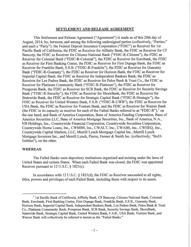 SETTLEMENT AND RELEASE AGREEMENT This Settlement and Release Agreement ("Agreement") is made as of this 20th day of August, 2014, by, between, and among the following undersigned parties (collectively, "Parties," and each a "Party"): the Federal Deposit Insurance Corporation ("FDIC") as Receiver for 1st Pacific Bank of California, the FDIC as Receiver for Affinity Bank, the FDIC as Receiver for CF Bancorp, the FDIC as Receiver for Citizens National Bank ("FDIC-R-Citizens"), the FDIC as Receiver for Colonial Bank ("FDIC-R-Colonial"), the FDIC as Receiver for Eurobank, the FDIC as Receiver for First Banking Center, the FDIC as Receiver for First Dupage Bank, the FDIC as Receiver for Franklin Bank, S.S.B. ("FDIC-R-Franklin"), the FDIC as Receiver for Guaranty Bank ("FDIC-R-Guaranty"), the FDIC as Receiver for Horizon Bank, the FDIC as Receiver for Imperial Capital Bank, the FDIC as Receiver for Independent Bankers Bank, the FDIC as Receiver for Los Padres Bank, the FDIC as Receiver for Palos Bank &Trust Co., the FDIC as Receiver for Platinum Community Bank ("FDIC-R-Platinum"), the FDIC as Receiver for Prosperan Bank, the FDIC as Receiver for SCB Bank, the FDIC as Receiver for Security Savings Bank ("FDIC-R-Security"), the FDIC as Receiver for ShoreBank, the FDIC as Receiver for Statewide Bank, the FDIC as Receiver for Strategic Capital Bank ("FDIC-R-Strategic"), the FDIC as Receiver for United Western Bank, F.S.B. ("FDIC-R-UWB"), the FDIC as Receiver for USA Bank, the FDIC as Receiver for Venture Bank, and the FDIC as Receiver for Warren Bank (the FDIC in its capacity as receiver for each of the Failed Banks referred to as "FDIC-R"),1 on the one hand, and Bank of America Corporation, Banc of America Funding Corporation, Banc of America Securities LLC, Banc of America Mortgage Securities, Inc., Bank of America, N.A., NB Holdings, Inc., Countrywide Financial Corporation, Countrywide Securities Corporation, Countrywide Home Loans, Inc., CWMBS, Inc., CWALT, Inc., CWABS, Inc., CWHEQ, Inc., Countrywide Capital Markets, LLC, Merrill Lynch Mortgage Capital Inc., Merrill Lynch Mortgage Investors Inc., and Merrill Lynch, Pierce, Fenner &Smith Inc. (collectively, `BofA Entities"), on the other. wxE~As: The Failed Banks were depository institutions organized and existing under the laws of United States and certain States. When each Failed Bank was closed, the FDIC was appointed Receiver pursuant to 12 U.S.C. § 1821(c). In accordance with 12 U.S.C. § 1821(d), the FDIC as Receiver succeeded to all rights, titles, powers and privileges of each Failed Bank, including those with respect to its assets. 1st Pacific Bank of California, Affinity Bank, CF Bancorp, Citizens National Bank, Colonial Bank, Eurobank, First Banking Center, First Dupage Bank, Franklin Bank, S.S.B., Guaranty Bank, Horizon Bank, Imperial Capital Bank, Independent Bankers Bank, Los Padres Bank, Palos Bank &Trust Co., Platinum Community Bank, Prosperan Bank, SCB Bank, Security Savings Bank, ShoreBank, Statewide Bank, Strategic Capital Bank, United Western Bank, F.S.B., USA Bank, Venture Bank, and Warren Bank will collectively be referred to herein as the "Failed Banks." -1-