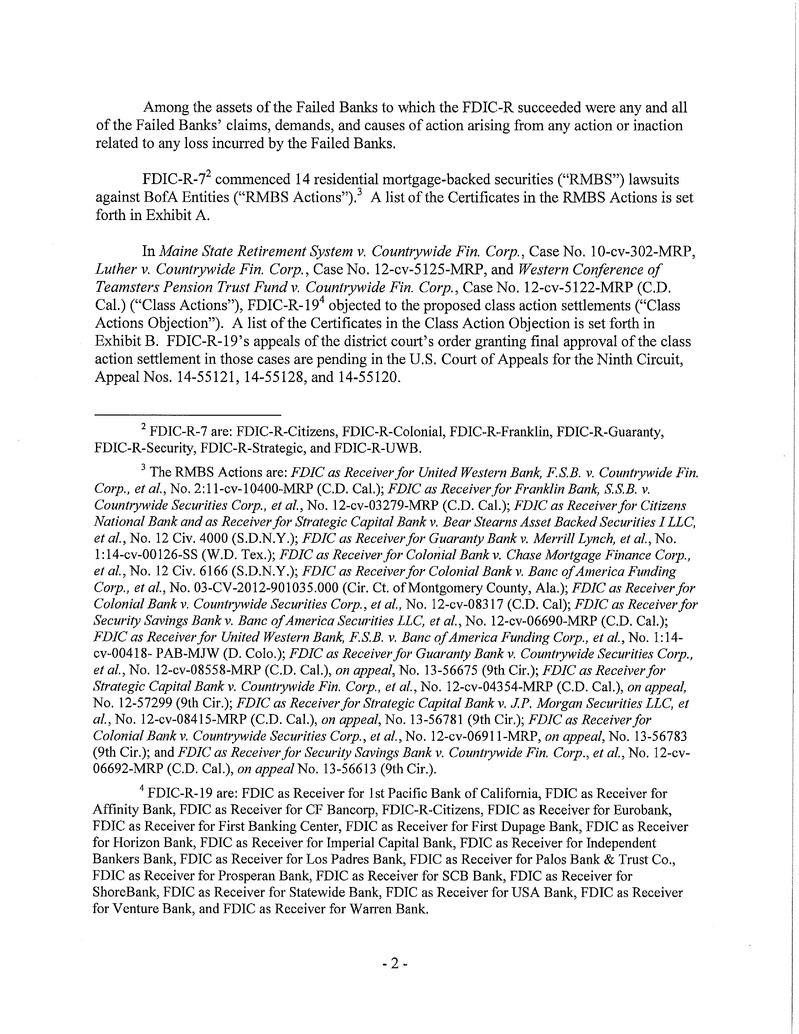 Among the assets of the Failed Banks to which the FDIC-R succeeded were any and all of the Failed Banks' claims, demands, and causes of action arising from any action or inaction related to any loss incurred by the Failed Banks. FDIC-R-72 commenced 14 residential mortgage-backed securities ("RMBS") lawsuits against BofA Entities ("RMBS Actions").3 A list of the Certificates in the RMBS Actions is set forth in Exhibit A. In Maine State Retirement System v. Countrywide Fin. Corp., Case No. 10-cv-302-MRP, Luther v. Countrywide Fin. Cofp., Case No. 12-cv-5125-MRP, and Western Conference of Teamsters Pension Trust Fund v. Coa~ntrywide Fin. Corp., Case No. 12-cv-5122-MRP (C.D. Cal.) ("Class Actions"), FDIC-R-194 objected to the proposed class action settlements ("Class Actions Objection"). A list of the Certificates in the Class Action Objection is set forth in Exhibit B. FDIC-R-19's appeals of the district court's order granting final approval of the class action settlement in those cases are pending in the U.S. Court of Appeals for the Ninth Circuit, Appeal Nos. 14-55121, 14-55128, and 14-55120. 2 FDIC-R-7 are: FDIC-R-Citizens, FDIC-R-Colonial, FDIC-R-Franklin, FDIC-R-Guaranty, FDIC-R-Security, FDIC-R-Strategic, and FDIC-R-UWB. 3 The RMBS Actions are: FDIC as Receiver for United Western Bank, F.S.B. v. Counhywide Fin. Corp., et al., No. 2:11-cv-10400-MRP (C.D. Cal.); FDIC as Receiver for Franklin Bank, S.S.B. v. Count~ytivide Securities Corp., et al., No. 12-cv-03279-MRP (C.D. Cal.); FDIC as Receiver fo~~ Citizens National Bank and as Receiver for Strategic Capital Bank v. Bear Stearns Asset Backed Securities I LLC, et al., No. 12 Civ. 4000 (S.DN.Y.); FDIC as Receiver for Guaranty Bank v. Merrill Lynch, et al., No. 1:14-cv-00126-SS (W.D. Tex.); FDIC as Receiver for Colonial Bank v. Chase Mortgage Finance Corp., et al., No. 12 Civ. 6166 (S.D.N.Y.); FDIC as Receiver for Colonial Bank v. Banc ofAmerica Funding Corp., et a1., No. 03-CV-2012-901035.000 (Cir. Ct. of Montgomery County, Ala.); FDIC as Receiver for Colonial Bank v. Countrywide Secu~•ities Corp., et al., No. 12-cv-08317 (C.D. Cal); FDIC as Receiver for Security Savings Bank v. Banc ofAmerica Securities LLC, et al., No. 12-cv-06690-MRP (C.D. Cal.); FDIC as Receiver for United Western Bank, F.S.B. v. Banc ofAmerica Fundi»g Corp., et al., No. 1:14- cv-00418- PAB-MJW (D. Colo.); FDIC as Receiver for Guaranty Bank v. Countrywide Secuf•ities Corp., et al., No. 12-cv-08558-IvTRP (C.D. Cal.), on appeal, No. 13-56675 (9th Cir.); FDIC as Receiver for Strategic Capital Bank v. CourrtJywide Fin. Corp., et al., No. 12-cv-04354-MRP (C.D. Cal.), on appeal, No. 12-57299 (9th Cir.); FDIC as Receiver for Strategic Capital Bank v. J.P. Morgan Securities LLC, et al., No. 12-cv-08415-MRP (C.D. Cal.), on appeal, No. 13-56781 (9th Cir.); FDIC as Receiver for Colonial Bank v. Country►vide Securities Corp., et al., No. 12-cv-06911-MRP, on appeal, No. 13-56783 (9th Cir.); and FDIC as Receiver for Security Savings Bank v. Count~y►vide Fin. Corp., et al., No. 12-cv- 06692-MRP (C.D. Cal.), on appeal No. 13-56613 (9th Cir.). 4 FDIC-R-19 are: FDIC as Receiver for lst Pacific Bank of California, FDIC as Receiver for Affinity Bank, FDIC as Receiver for CF Bancorp, FDIC-R-Citizens, FDIC as Receiver for Eurobank, FDIC as Receiver for First Banking Center, FDIC as Receiver for First Dupage Bank, FDIC as Receiver for Horizon Bank, FDIC as Receiver for Imperial Capital Bank, FDIC as Receiver for Independent Bankers Bank, FDIC as Receiver for Los Padres Bank, FDIC as Receiver for Palos Bank &Trust Co., FDIC as Receiver for Prosperan Bank, FDIC as Receiver for SCB Bank, FDIC as Receiver for ShoreBank, FDIC as Receiver for Statewide Bank, FDIC as Receiver for USA Bank, FDIC as Receiver for Venture Bank, and FDIC as Receiver for Warren Bank. -2-