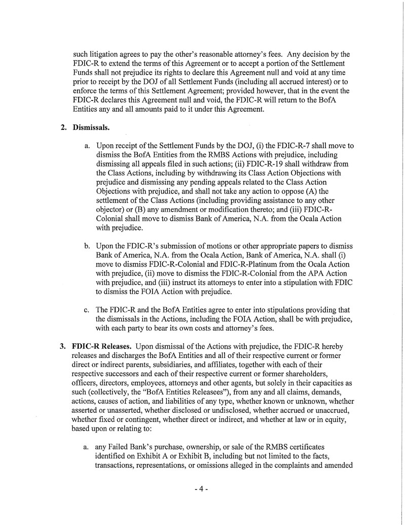 such litigation agrees to pay the other's reasonable attorney's fees. Any decision by the FDIC-R to extend the terms of this Agreement or to accept a portion of the Settlement Funds shall not prejudice its rights to declare this Agreement null and void at any time prior to receipt by the DOJ of all Settlement Funds (including all accrued interest) or to enforce the terms of this Settlement Agreement; provided however, that in the event the FDIC-R declares this Agreement null and void, the FDIC-R will return to the BofA Entities any and all amounts paid to it under this Agreement. 2. Dismissals. a. Upon receipt of the Settlement Funds by the DOJ, (i) the FDIC-R-7 shall move to dismiss the BofA Entities from the RMBS Actions with prejudice, including dismissing all appeals filed in such actions; (ii) FDIC-R-19 shall withdraw from the Class Actions, including by withdrawing its Class Action Objections with prejudice and dismissing any pending appeals related to the Class Action Objections with prejudice, and shall not take any action to oppose (A) the settlement of the Class Actions (including providing assistance to any other objector) or (B) any amendment or modification thereto; and (iii) FDIC-R- Colonial shall move to dismiss Bank of America, N.A. from the Ocala Action with prejudice. b. Upon the FDIC-R's submission of motions or other appropriate papers to dismiss Bank of America, N.A. from the Ocala Action, Bank of America, N.A. shall (i) move to dismiss FDIC-R-Colonial and FDIC-R-Platinum from the Ocala Action with prejudice, (ii) move to dismiss the FDIC-R-Colonial from the APA Action with prejudice, and (iii) instruct its attorneys to enter into a stipulation with FDIC to dismiss the FOIA Action with prejudice. c. The FDIC-R and the BofA Entities agree to enter into stipulations providing that the dismissals in the Actions, including the FOIA Action, shall be with prejudice, with each party to bear its own costs and attorney's fees. 3. FDIC-R Releases. Upon dismissal of the Actions with prejudice, the FDIC-R hereby releases and discharges the BofA Entities and all of their respective current or former direct or indirect parents, subsidiaries, and affiliates, together with each of their respective successors and each of their respective current or former shareholders, officers, directors, employees, attorneys and other agents, but solely in their capacities as such (collectively, the `BofA Entities Releasees"), from any and all claims, demands, actions, causes of action, and liabilities of any type, whether known or unknown, whether asserted or unasserted, whether disclosed or undisclosed, whether accrued or unaccrued, whether fixed or contingent, whether direct or indirect, and whether at law or in equity, based upon or relating to: a. any Failed Bank's purchase, ownership, or sale of the RMBS certificates identified on Exhibit A or Exhibit B, including but not limited to the facts, transactions, representations, or omissions alleged in the complaints and amended