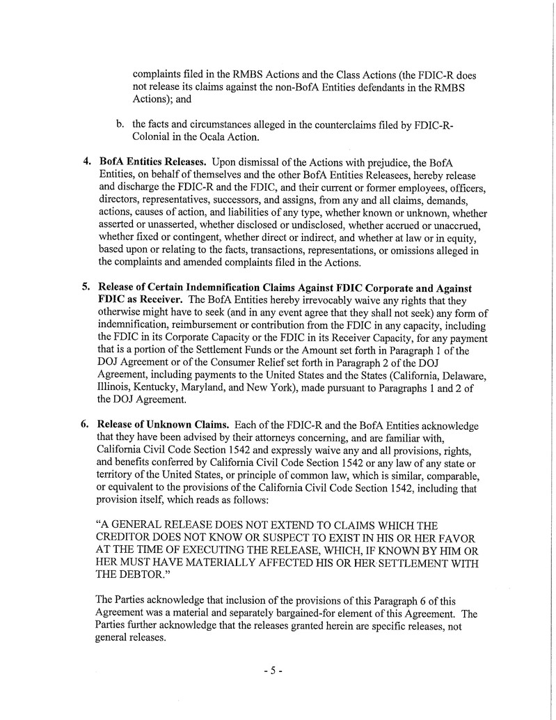 complaints filed in the RMBS Actions and the Class Actions (the FDIC-R does not release its claims against the non-BofA Entities .defendants in the RMBS Actions); and b. the facts and circumstances alleged in the counterclaims filed by FDIC-R- Colonial in the Ocala Action. 4. BofA Entities Releases. Upon dismissal of the Actions with prejudice, the BofA Entities, on behalf of themselves and the other BofA Entities Releasees, hereby release and discharge the FDIC-R and the FDIC, and their current or former employees, officers, directors, representatives, successors, and assigns, from any and all claims, demands, actions, causes of action, and liabilities of any type, whether known or unknown, whether asserted or unasserted, whether disclosed or undisclosed, whether accrued or unaccrued, whether fixed or contingent, whether direct or indirect, and whether at law or in equity, based upon or relating to the facts, transactions, representations, or omissions alleged in the complaints and amended complaints filed in the Actions. 5. Release of Certain Indemnification Claims Against FDIC Corporate and Against FDIC as Receiver. The BofA Entities hereby irrevocably waive any rights that they otherwise might have to seek (and in any event agree that they shall not seek) any form of indemnification, reimbursement or contribution from the FDIC in any capacity, including the FDIC in its Corporate Capacity or the FDIC in its Receiver Capacity, for any payment that is a portion of the Settlement Funds or the Amount set forth in Paragraph 1 of the DOJ Agreement or of the Consumer Relief set forth in Paragraph 2 of the DOJ Agreement, including payments to the United States and the States (California, Delaware, Illinois, Kentucky, Maryland, and New York), made pursuant to Paragraphs 1 and 2 of the DOJ Agreement. 6. Release of Unknown Claims. Each of the FDIC-R and the BofA Entities acknowledge that they have been advised by their attorneys concerning, and are familiar with, California Civil Code Section 1542 and expressly waive any and all provisions, rights, and benefits conferred by California Civil Code Section 1542 or any law of any state or territory of the United States, or principle of common law, which is similar, comparable, or equivalent to the provisions of the California Civil Code Section 1542, including that provision itself, which reads as follows: "A GENERAL RELEASE DOES NOT EXTEND TO CLAIMS WHICH THE CREDITOR DOES NOT KNOW OR SUSPECT TO EXIST IN HIS OR HER FAVOR AT THE TIME OF EXECUTING THE RELEASE, WHICH, IF KNOWN BY HIM OR HER MUST HAVE MATERIALLY AFFECTED HIS OR HER SETTLEMENT WITH THE DEBTOR." The Parties acknowledge that inclusion of the provisions of this Paragraph 6 of this Agreement was a material and separately bargained-for element of this Agreement. The Parties further acknowledge that the releases granted herein are specific releases, not general releases. -5-