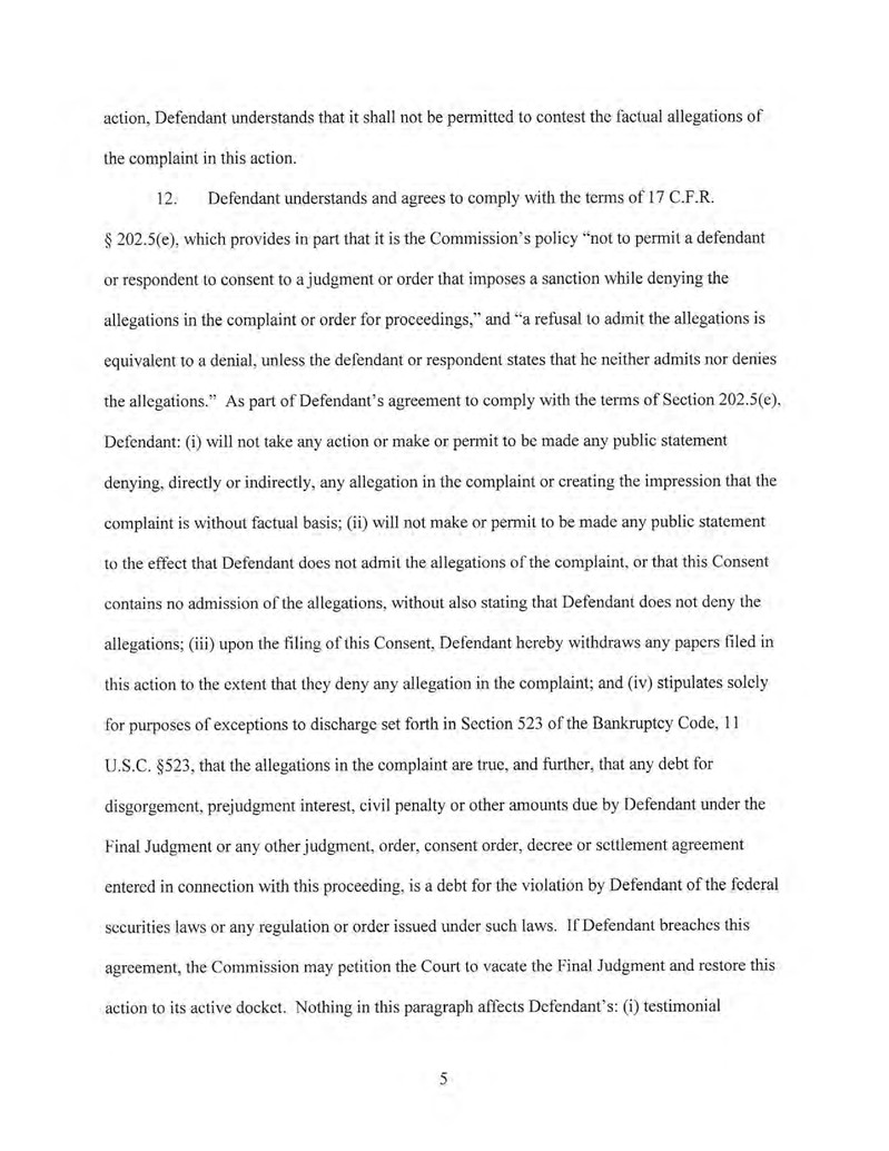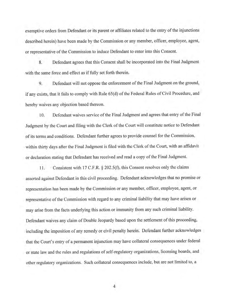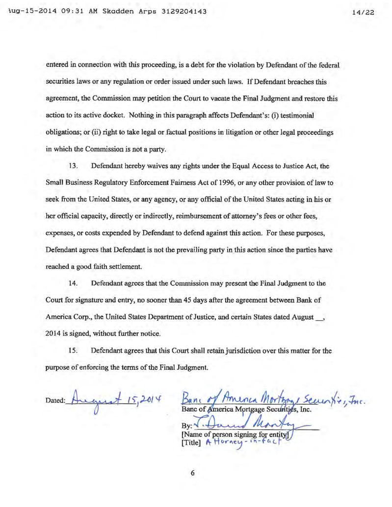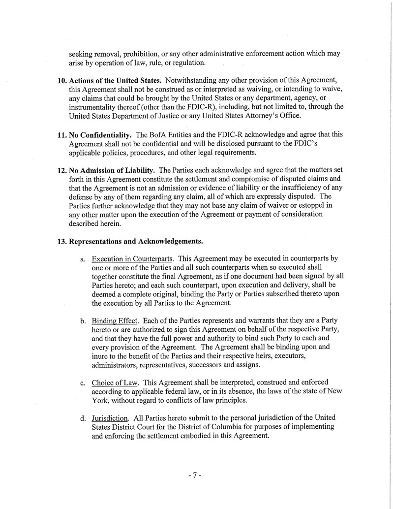seeking removal, prohibition, or any other administrative enforcement action which may arise by operation of law, rule, or regulation. 10. Actions of the United States. Notwithstanding any other provision of this Agreement, this Agreement shall not be construed as or interpreted as waiving, or intending to waive, any claims that could be brought by the United States ox any department, agency, or instrumentality thereof (other than the FDIC-R), including, but not limited to, through the United States Department of Justice or any United States Attorney's Office. 11. No Confidentiality. The BofA Entities and the FDIC-R acknowledge and agree that this Agreement shall not be confidential and will be disclosed pursuant to the FDIC's applicable policies, procedures, and other legal requirements. 12. No Admission of Liability. The Parties each acknowledge and agree that the matters set forth in this Agreement constitute the settlement and compromise of disputed claims and that the Agreement is not an admission or evidence of liability or the insufficiency of any defense by any of them regarding any claim, all of which are expressly disputed. The Parties further acknowledge that they may not base any claim of waiver or estoppel in any other matter upon the execution of the Agreement or payment of consideration described herein. 13. Representations and Acknowledgements. a. Execution in Counterparts. This Agreement may be executed in counterparts by one or more of the Parties and all such counterparts when so executed shall together constitute the final Agreement, as if one document had been signed by all Parties hereto; and each such counterpart, upon execution and delivery, shall be deemed a complete original, binding the Party or Parties subscribed thereto upon the execution by ail Parties to the Agreement. b. Bindin Eg ffect. Each of the Parties represents and warrants that they are a Party hereto or are authorized to sign this Agreement on behalf of the respective Party, and that they have the full power and authority to bind such Party to each and every provision of the Agreement. The Agreement shall be binding upon and inure to the benefit of the Parties and their respective heirs, executors, administrators, representatives, successors and assigns. c. Choice of Law. This Agreement shall be interpreted, construed and enforced according to applicable federal law, or in its absence, the laws of the state of New York, without regard to conflicts of law principles. d. Jurisdiction. All Parties hereto submit to the personal jurisdiction of the United States District Court for the District of Columbia for purposes of implementing and enforcing the settlement embodied in this Agreement. -7-