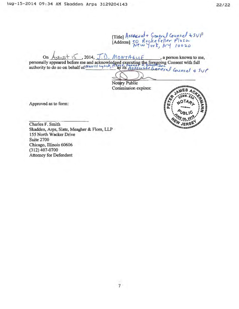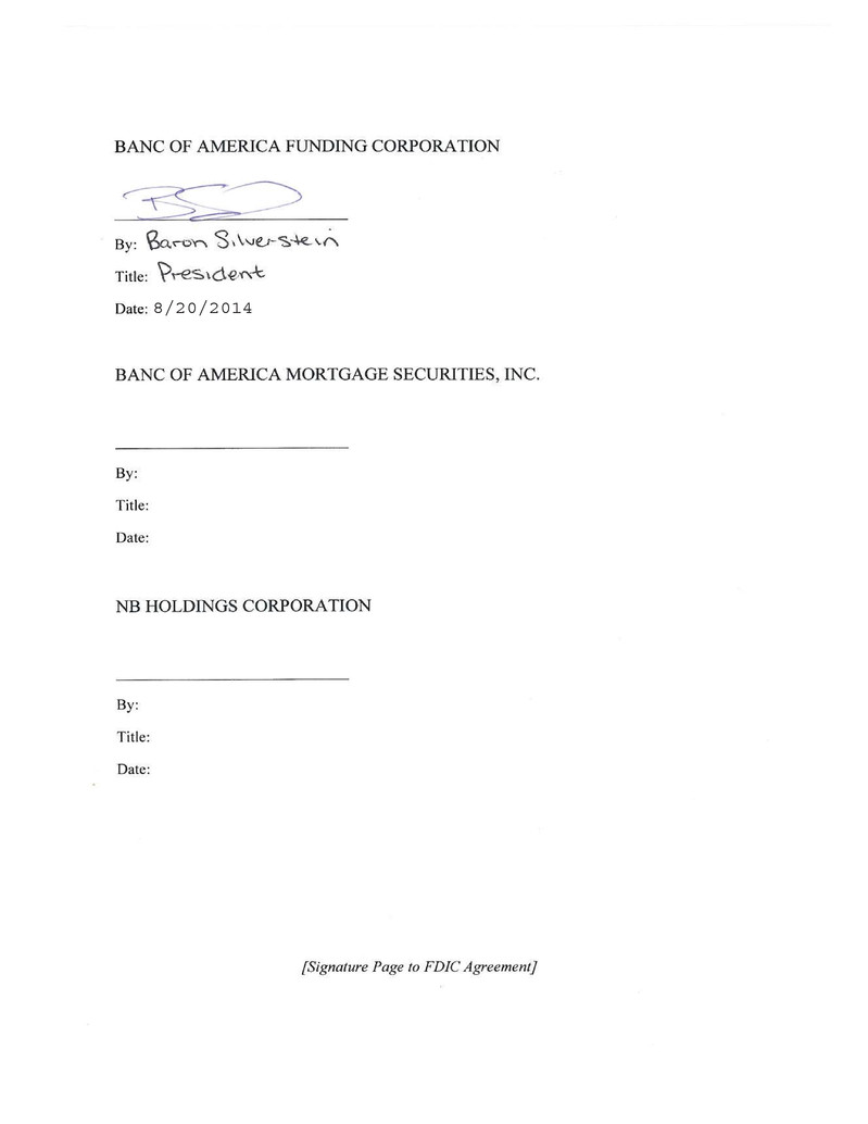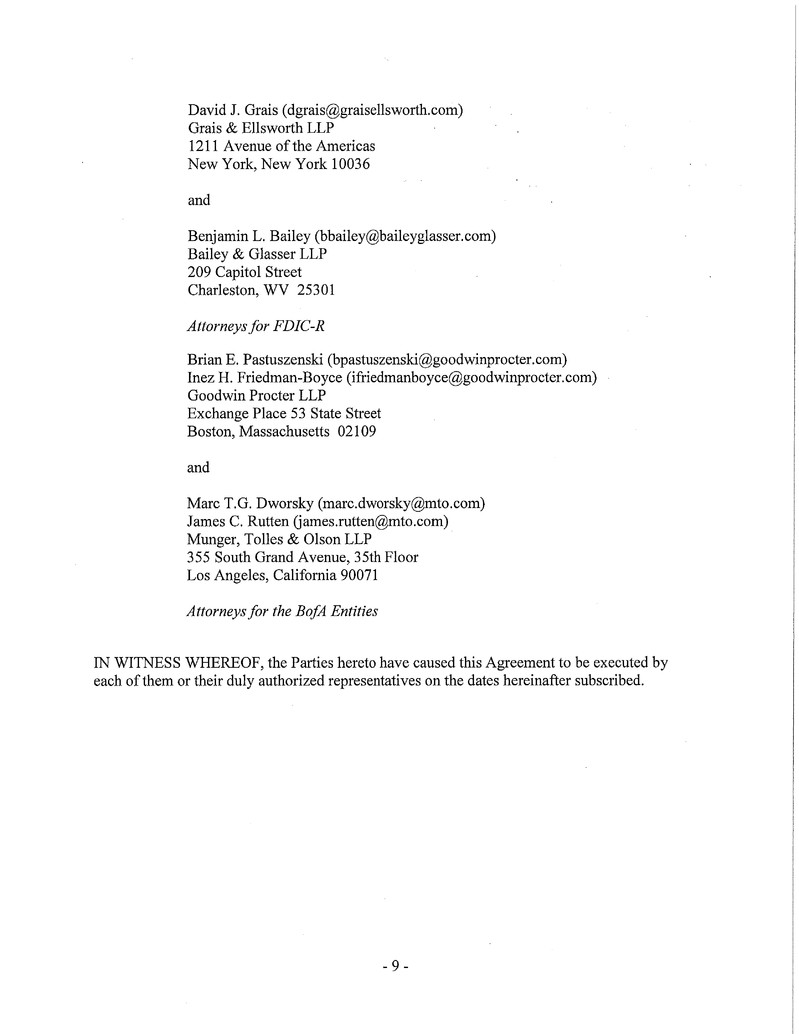 David J. Grais (dgrais@graiselisworth.com) Grais &Ellsworth LLP 1211 Avenue of the Americas New York, New York 10036 and Benjamin L. Bailey (bbailey@baileyglasser.com) Bailey &Glasser LLP 209 Capitol Street Charleston, VW 25301 Attorneys for FDIC-R Brian E. Pastuszenski (bpastuszenski@goodwinprocter.com) Inez H. Friedman-Boyce (ifriedmanboyce@goodwinprocter.com) Goodwin Procter LLP Exchange Place 53 State Street Boston, Massachusetts 02109 FTT:I Marc T.G. Dworsky (marc.dworsky@mto.com) James C. Rutten (james.rutten@mto.com) Munger, Tolles &Olson LLP 355 South Grand Avenue, 35th Floor Los Angeles, California 90071 Attorneys for the BofA Entities IN WITNESS WHEREOF, the Parties hereto have caused this Agreement to be executed by each of them or their duly authorized representatives on the dates hereinafter subscribed. ~~