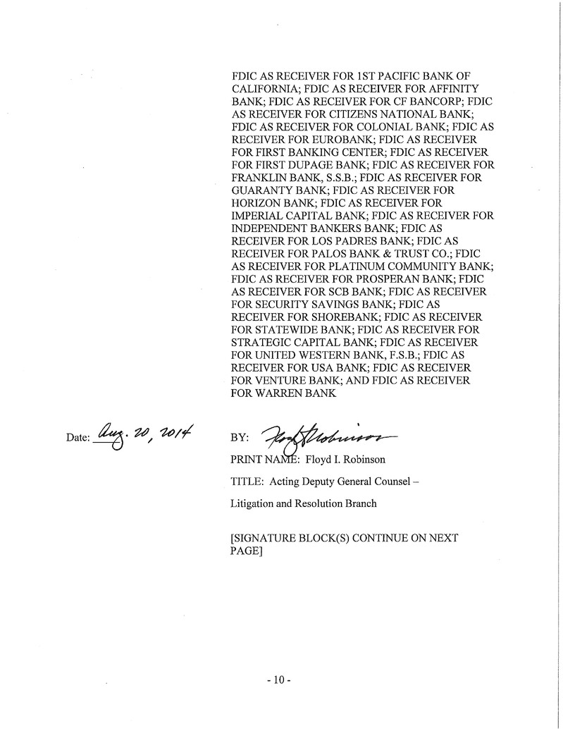 FDIC AS RECEIVER FOR 1 ST PACIFIC BANK OF CALIFORNIA; FDIC AS RECEIVER FOR AFFINITY -BANK; FDIC AS RECEIVER FOR CF BANCORP; FDIC AS RECEIVER FOR CITIZENS NATIONAL BANK; FDIC AS RECEIVER FOR COLONIAL BANK; FDIC AS RECEIVER FOR EUROBANK; FDIC AS RECEIVER FOR FIRST BANKING CENTER; FDIC AS RECEIVER FOR FIRST DUPAGE BANK; FDIC AS RECEIVER FOR FRANKLIN BANK, S.S.B.; FDIC AS RECEIVER FOR GUARANTY BANK; FDIC AS RECEIVER FOR HORIZON BANK; FDIC AS RECEIVER FOR IMPERIAL CAPITAL BANK; FDIC AS RECEIVER FOR INDEPENDENT BANKERS BANK; FDIC AS RECEIVER FOR LOS PADRES BANK; FDIC AS RECEIVER FOR PALOS BANK &TRUST CO.; FDIC AS RECEIVER FOR PLATINUM COMMUNITY BANK; FDIC AS RECEIVER FOR PROSPERAN BANK; FDIC AS RECEIVER FOR SCB BANK; FDIC AS RECEIVER FOR SECURITY SAVINGS BANK; FDIC AS RECEIVER FOR SHOREBANK; FDIC AS RECEIVER FOR STATEWIDE BANK; FDIC AS RECEIVER FOR STRATEGIC CAPITAL BANK; FDIC AS RECEIVER FOR UNITED WESTERN BANK, F.S.B.; FDIC AS RECEIVER FOR USA BANK; FDIC AS RECEIVER FOR VENTURE BANK; AND FDIC AS RECEIVER FOR WARREN BANK Date: ~ ~~~ BY: PRINT NA Floyd L Robinson TITLE: Acting Deputy General Counsel — Litigation and Resolution Branch [SIGNATURE BLOCKS) CONTINUE ON NEXT PAGE] -10-