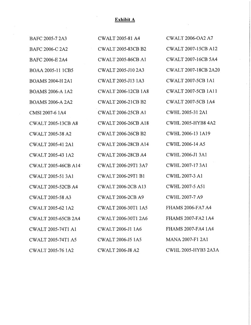 Exhibit A BAFC 2005-7 2A3 CWALT 2005-81 A4 CWALT 2006-OA2 A7 BAFC 2006-C 2A2 CWALT 2005-83CB B2 CWALT 2007-15CB Al2 BAFC 2006-E 2A4 CWALT 2005-86CB Al CWALT 2007-16CB SA4 BOAR 2005-11 1CB5 CWALT 2005-J10 2A3 CWALT 2007-18CB 2A20 BOAMS 2004-H 2A1 CWALT 2005-J13 lA3 CWALT 2007-SCB lAl BOAMS 2006-A lA2 CWALT 2006-12CB lA8 CWALT 2007-SCB lAl 1 BOAMS 2006-A 2A2 CWALT 2006-21CB B2 CWALT 2007-SCB lA4 CMSI 2007-6 lA4 CWALT 2006-25CB Al CWHL 2005-31 2A1 CWALT 2005-13CB A8 CWALT 2006-26CB A18 CWHL 2005-HYB8 4A2 CWALT 2005-38 A2 CWALT 2006-26CB B2 CWHL 2006-13 1A19 CWALT 2005-41 2A1 CWALT 2006-28CB A14 CWHL 2006-14 AS CWALT 2005-43 lA2 CWALT 2006-28CB A4 CWHL 2006-J1 3A1 CWALT 2005-46CB A14 CWALT 2006-29T1 3A7 CWHL 2007-17 3A1 CWALT 2005-51 3A1 CWALT 2006-29T1 Bl CWHL 2007-3 Al CWALT 2005-52CB A4 CWALT 2006-2CB A13 CWHL 2007-5 A51 CWALT 2005-58 A3 CWALT 2006-2CB A9 CWHL 2007-7 A9 CWALT 2005-62 lA2 CWALT 2006-30T1 lA5 FHAMS 2006-FA7 A4 CWALT 2005-65CB 2A4 CWALT 2006-30T1 2A6 FHAMS 2007-FA2 lA4 CWALT 2005-74T1 Al CWALT 2006-J1 lA6 FHAMS 2007-FA4 lA4 CWALT 2005-74T1 AS CWALT 2006-JS lA5 MANA 2007-F1 2A1 CWALT 2005-76 lA2 CWALT 2006-J8 A2 CWHL 2005-HYB3 2A3A