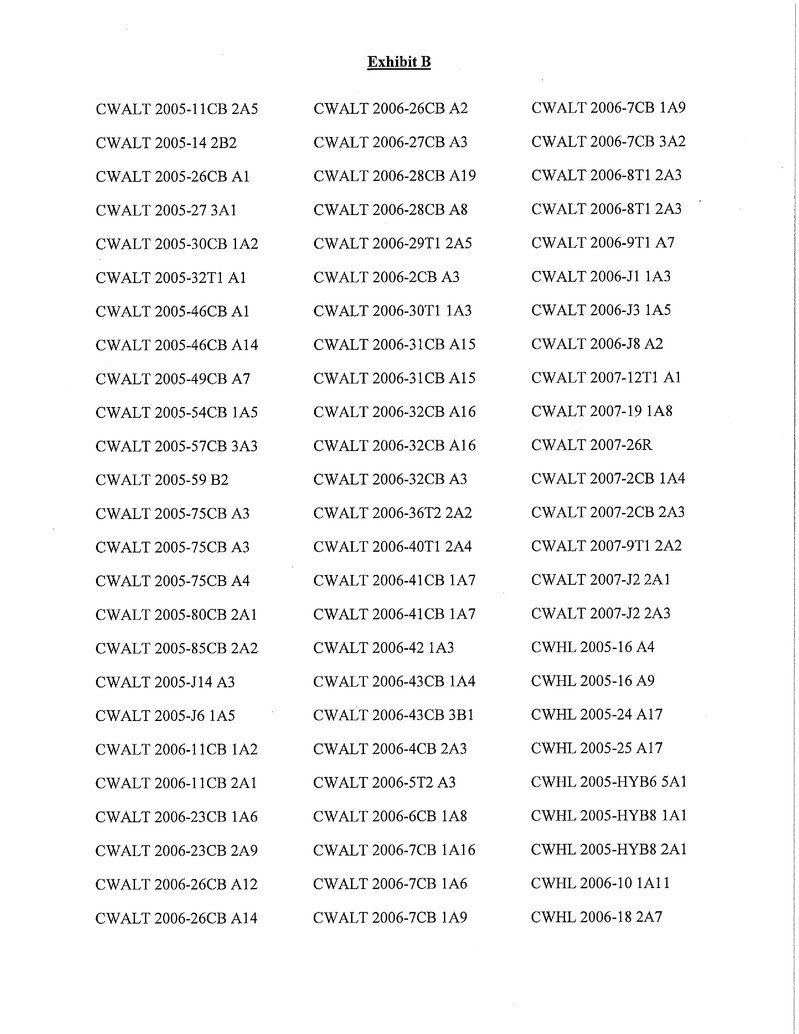 Exhibit B CWALT 2005-11CB 2A5 CWALT 2006-26CB A2 CWALT 2006-7CB lA9 CWALT 2005-14 2B2 CWALT 2006-27CB A3 CWALT 2006-7CB 3A2 CWALT 2005-26CB Al CWALT 2006-28CB A19 CWALT 2006-8T1 2A3 CWALT 2005-27 3A1 CWALT 2006-28CB A8 CWALT 2006-8T1 2A3 CWALT 2005-30CB lA2 CWALT 2006-29T1 2A5 CWALT 2006-9T1 A7 CWALT 2005-32T1 Al CWALT 2006-2CB A3 CWALT 2006-J1 lA3 CWALT 2005-46CB Al CWALT 2006-30T1 lA3 CWALT 2006-J3 lA5 CWALT 2005-46CB A14 CWALT 2006-31CB A15 CWALT 2006-J8 A2 CWALT 2005-49CB A7 CWALT 2006-31CB A15 CWALT 2007-12T1 Al CWALT 2005-54CB lA5 CWALT 2006-32CB A16 CWALT 2007-19 lA8 CWALT 2005-57CB 3A3 CWALT 2006-32CB A16 CWALT 2007-26R CWALT 2005-59 B2 CWALT 2006-32CB A3 CWALT 2007-2CB lA4 CWALT 2005-75CB A3 CWALT 2006-36T2 2A2 CWALT 2007-2CB 2A3 CWALT 2005-75CB A3 CWALT 2006-40T1 2A4 CWALT 2007-9T1 2A2 CWALT 2005-75CB A4 CWALT 2006-41CB lA7 CWALT 2007-J2 2A1 CWALT 2005-80CB 2A1 CWALT 2006-41CB lA7 CWALT 2007-J2 2A3 CWALT 2005-85CB 2A2 CWALT 2006-42 lA3 CWHL 20.05-16 A4 CWALT 2005-J14 A3 CWALT 2006-43CB lA4 CWHL 2005-16 A9 CWALT 2005-J6 lA5 CWALT 2006-43CB 3B1 CWHL 2005-24 A17 CWALT 2006-11CB lA2 CWALT 2006-4CB 2A3 CWHL 2005-25 A17 CWALT 2006-11CB 2A1 CWALT 2006-ST2 A3 CWHL 2005-HYB6 SAl CWALT 2006-23CB lA6 CWALT 2006-6CB lA8 CWHL 2005-HYB8 lAl CWALT 2006-23CB 2A9 CWALT 2006-7CB 1A16 CWHL 2005-HYB8 2A1 CWALT 2006-26CB Al2 CWALT 2006-7CB lA6 CWHL 2006-10 lAl 1 CWALT 2006-26CB A14 CWALT 2006-7CB lA9 CWHL 2006-18 2A7