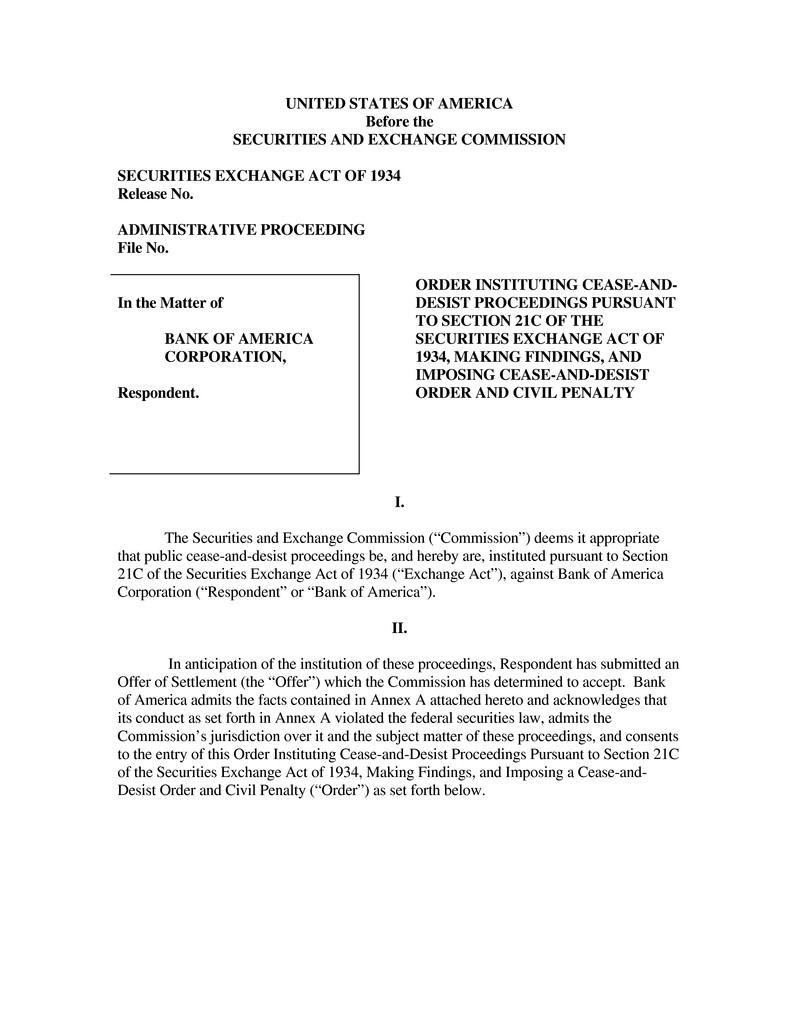 UNITED STATES OF AMERICA Before the SECURITIES AND EXCHANGE COMMISSION SECURITIES EXCHANGE ACT OF 1934 Release No. ADMINISTRATIVE PROCEEDING File No. In the Matter of BANK OF AMERICA CORPORATION, Respondent. ORDER INSTITUTING CEASE-AND- DESIST PROCEEDINGS PURSUANT TO SECTION 21C OF THE SECURITIES EXCHANGE ACT OF 1934, MAKING FINDINGS, AND IMPOSING CEASE-AND-DESIST ORDER AND CIVIL PENALTY I. The Securities and Exchange Commission (“Commission”) deems it appropriate that public cease-and-desist proceedings be, and hereby are, instituted pursuant to Section 21C of the Securities Exchange Act of 1934 (“Exchange Act”), against Bank of America Corporation (“Respondent” or “Bank of America”). II. In anticipation of the institution of these proceedings, Respondent has submitted an Offer of Settlement (the “Offer”) which the Commission has determined to accept. Bank of America admits the facts contained in Annex A attached hereto and acknowledges that its conduct as set forth in Annex A violated the federal securities law, admits the Commission’s jurisdiction over it and the subject matter of these proceedings, and consents to the entry of this Order Instituting Cease-and-Desist Proceedings Pursuant to Section 21C of the Securities Exchange Act of 1934, Making Findings, and Imposing a Cease-and- Desist Order and Civil Penalty (“Order”) as set forth below.