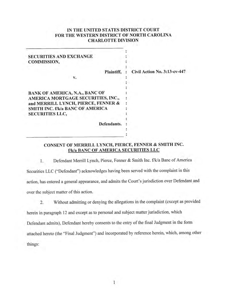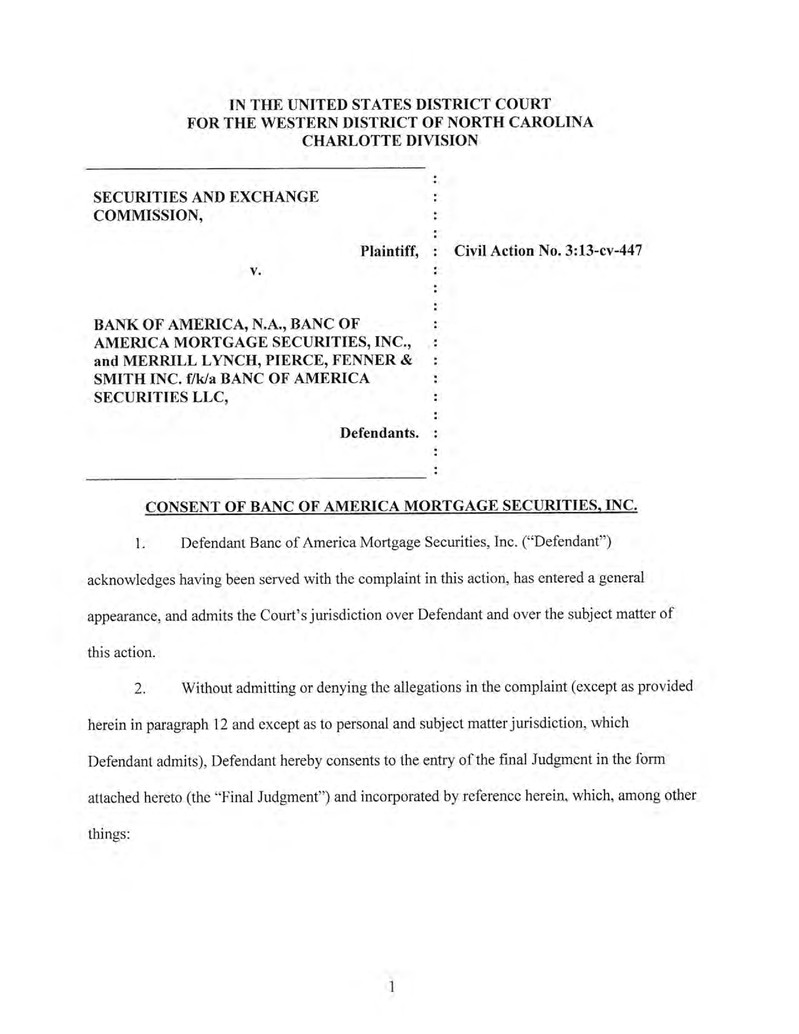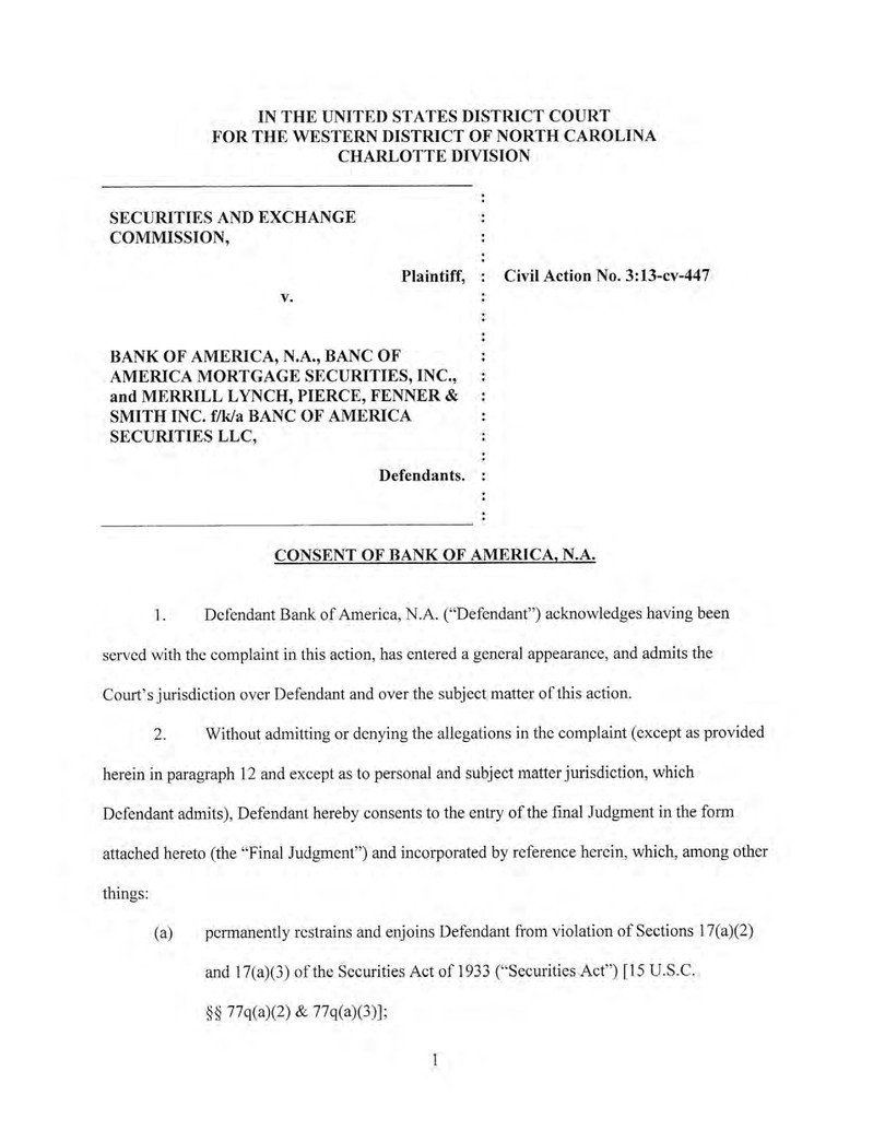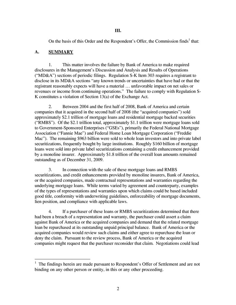2 III. On the basis of this Order and the Respondent’s Offer, the Commission finds1 that: A. SUMMARY 1. This matter involves the failure by Bank of America to make required disclosures in the Management’s Discussion and Analysis and Results of Operations (“MD&A”) sections of periodic filings. Regulation S-K Item 303 requires a registrant to disclose in its MD&A sections “any known trends or uncertainties that have had or that the registrant reasonably expects will have a material … unfavorable impact on net sales or revenues or income from continuing operations.” The failure to comply with Regulation S- K constitutes a violation of Section 13(a) of the Exchange Act. 2. Between 2004 and the first half of 2008, Bank of America and certain companies that it acquired in the second half of 2008 (the “acquired companies”) sold approximately $2.1 trillion of mortgage loans and residential mortgage backed securities (“RMBS”). Of the $2.1 trillion total, approximately $1.1 trillion were mortgage loans sold to Government-Sponsored Enterprises (“GSEs”), primarily the Federal National Mortgage Association (“Fannie Mae”) and Federal Home Loan Mortgage Corporation (“Freddie Mac”). The remaining $963 billion were sold to whole loan investors and into private label securitizations, frequently bought by large institutions. Roughly $160 billion of mortgage loans were sold into private label securitizations containing a credit enhancement provided by a monoline insurer. Approximately $1.8 trillion of the overall loan amounts remained outstanding as of December 31, 2009. 3. In connection with the sale of these mortgage loans and RMBS securitizations, and credit enhancements provided by monoline insurers, Bank of America, or the acquired companies, made contractual representations and warranties regarding the underlying mortgage loans. While terms varied by agreement and counterparty, examples of the types of representations and warranties upon which claims could be based included good title, conformity with underwriting guidelines, enforceability of mortgage documents, lien position, and compliance with applicable laws. 4. If a purchaser of these loans or RMBS securitizations determined that there had been a breach of a representation and warranty, the purchaser could assert a claim against Bank of America or the acquired companies and demand that the related mortgage loan be repurchased at its outstanding unpaid principal balance. Bank of America or the acquired companies would review such claims and either agree to repurchase the loan or deny the claim. Pursuant to the review process, Bank of America or the acquired companies might request that the purchaser reconsider that claim. Negotiations could lead 1 The findings herein are made pursuant to Respondent’s Offer of Settlement and are not binding on any other person or entity, in this or any other proceeding.