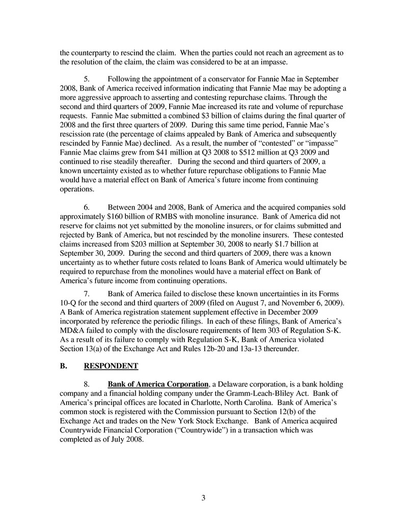 3 the counterparty to rescind the claim. When the parties could not reach an agreement as to the resolution of the claim, the claim was considered to be at an impasse. 5. Following the appointment of a conservator for Fannie Mae in September 2008, Bank of America received information indicating that Fannie Mae may be adopting a more aggressive approach to asserting and contesting repurchase claims. Through the second and third quarters of 2009, Fannie Mae increased its rate and volume of repurchase requests. Fannie Mae submitted a combined $3 billion of claims during the final quarter of 2008 and the first three quarters of 2009. During this same time period, Fannie Mae’s rescission rate (the percentage of claims appealed by Bank of America and subsequently rescinded by Fannie Mae) declined. As a result, the number of “contested” or “impasse” Fannie Mae claims grew from $41 million at Q3 2008 to $512 million at Q3 2009 and continued to rise steadily thereafter. During the second and third quarters of 2009, a known uncertainty existed as to whether future repurchase obligations to Fannie Mae would have a material effect on Bank of America’s future income from continuing operations. 6. Between 2004 and 2008, Bank of America and the acquired companies sold approximately $160 billion of RMBS with monoline insurance. Bank of America did not reserve for claims not yet submitted by the monoline insurers, or for claims submitted and rejected by Bank of America, but not rescinded by the monoline insurers. These contested claims increased from $203 million at September 30, 2008 to nearly $1.7 billion at September 30, 2009. During the second and third quarters of 2009, there was a known uncertainty as to whether future costs related to loans Bank of America would ultimately be required to repurchase from the monolines would have a material effect on Bank of America’s future income from continuing operations. 7. Bank of America failed to disclose these known uncertainties in its Forms 10-Q for the second and third quarters of 2009 (filed on August 7, and November 6, 2009). A Bank of America registration statement supplement effective in December 2009 incorporated by reference the periodic filings. In each of these filings, Bank of America’s MD&A failed to comply with the disclosure requirements of Item 303 of Regulation S-K. As a result of its failure to comply with Regulation S-K, Bank of America violated Section 13(a) of the Exchange Act and Rules 12b-20 and 13a-13 thereunder. B. RESPONDENT 8. Bank of America Corporation, a Delaware corporation, is a bank holding company and a financial holding company under the Gramm-Leach-Bliley Act. Bank of America’s principal offices are located in Charlotte, North Carolina. Bank of America’s common stock is registered with the Commission pursuant to Section 12(b) of the Exchange Act and trades on the New York Stock Exchange. Bank of America acquired Countrywide Financial Corporation (“Countrywide”) in a transaction which was completed as of July 2008.