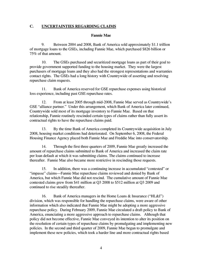 4 C. UNCERTAINTIES REGARDING CLAIMS Fannie Mae 9. Between 2004 and 2008, Bank of America sold approximately $1.1 trillion of mortgage loans to the GSEs, including Fannie Mae, which purchased $826 billion or 75% of that amount. 10. The GSEs purchased and securitized mortgage loans as part of their goal to provide government supported funding to the housing market. They were the largest purchasers of mortgage loans and they also had the strongest representations and warranties contact rights. The GSEs had a long history with Countrywide of asserting and resolving repurchase claim requests. 11. Bank of America reserved for GSE repurchase expenses using historical loss experience, including past GSE repurchase rates. 12. From at least 2005 through mid-2008, Fannie Mae served as Countrywide’s GSE “alliance partner.” Under this arrangement, which Bank of America later continued, Countrywide sold most of its mortgage inventory to Fannie Mae. Based on that relationship, Fannie routinely rescinded certain types of claims rather than fully assert its contractual rights to have the repurchase claims paid. 13. By the time Bank of America completed its Countrywide acquisition in July 2008, housing market conditions had deteriorated. On September 6, 2008, the Federal Housing Finance Agency placed both Fannie Mae and Freddie Mac into conservatorship. 14. Through the first three quarters of 2009, Fannie Mae greatly increased the amount of repurchase claims submitted to Bank of America and increased the claim rate per loan default at which it was submitting claims. The claims continued to increase thereafter. Fannie Mae also became more restrictive in rescinding those requests. 15. In addition, there was a continuing increase in accumulated “contested” or “impasse” claims—Fannie Mae repurchase claims reviewed and denied by Bank of America, but which Fannie Mae did not rescind. The cumulative amount of Fannie Mae contested claims grew from $41 million at Q3 2008 to $512 million at Q3 2009 and continued to rise steadily thereafter. 16. Bank of America managers in the Home Loans & Insurance (“HL&I”) division, which was responsible for handling the repurchase claims, were aware of other information which also indicated that Fannie Mae might be adopting a more aggressive repurchase policy. During February 2009, Fannie Mae circulated a draft policy to Bank of America, enunciating a more aggressive approach to repurchase claims. Although that policy did not become effective, Fannie Mae conveyed its intention to alter its position on the resolution of certain types of repurchase claims by promulgating and implementing new policies. In the second and third quarter of 2009, Fannie Mae began to promulgate and implement these new policies, which took a harder line and more contractual rights based