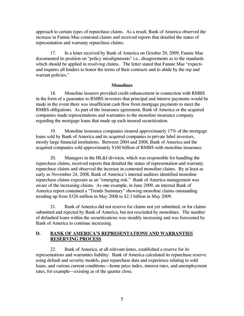 5 approach to certain types of repurchase claims. As a result, Bank of America observed the increase in Fannie Mae contested claims and received reports that detailed the status of representation and warranty repurchase claims. 17. In a letter received by Bank of America on October 20, 2009, Fannie Mae documented its position on “policy misalignments” i.e., disagreements as to the standards which should be applied in resolving claims. The letter stated that Fannie Mae “expects and requires all lenders to honor the terms of their contracts and to abide by the rep and warrant policies.” Monolines 18. Monoline insurers provided credit enhancement in connection with RMBS in the form of a guarantee to RMBS investors that principal and interest payments would be made in the event there was insufficient cash flow from mortgage payments to meet the RMBS obligations. As part of the insurance agreement, Bank of America or the acquired companies made representations and warranties to the monoline insurance company regarding the mortgage loans that made up each insured securitization. 19. Monoline insurance companies insured approximately 17% of the mortgage loans sold by Bank of America and its acquired companies to private label investors, mostly large financial institutions. Between 2004 and 2008, Bank of America and the acquired companies sold approximately $160 billion of RMBS with monoline insurance. 20. Managers in the HL&I division, which was responsible for handling the repurchase claims, received reports that detailed the status of representation and warranty repurchase claims and observed the increase in contested monoline claims. By at least as early as November 24, 2008, Bank of America’s internal auditors identified monoline repurchase claims exposure as an “emerging risk.” Bank of America management was aware of the increasing claims. As one example, in June 2009, an internal Bank of America report contained a “Trends Summary” showing monoline claims outstanding trending up from $326 million in May 2008 to $2.3 billion in May 2009. 21. Bank of America did not reserve for claims not yet submitted, or for claims submitted and rejected by Bank of America, but not rescinded by monolines. The number of defaulted loans within the securitizations was steadily increasing and was forecasted by Bank of America to continue increasing. D. BANK OF AMERICA’S REPRESENTATIONS AND WARRANTIES RESERVING PROCESS 22. Bank of America, at all relevant times, established a reserve for its representations and warranties liability. Bank of America calculated its repurchase reserve using default and severity models, past repurchase data and experience relating to sold loans, and various current conditions—home price index, interest rates, and unemployment rates, for example—existing as of the quarter close.